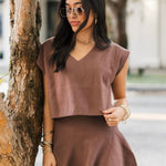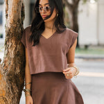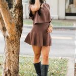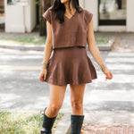 The Classic Knit Sweater Skirt in Chestnut is the perfect mix of comfort and style. With a relaxed fit and soft solid knit fabric, this mini skirt is easy to dress up or down. Its warm chestnut color adds a chic, autumn-ready touch to any outfit. Sage is wearing a small.