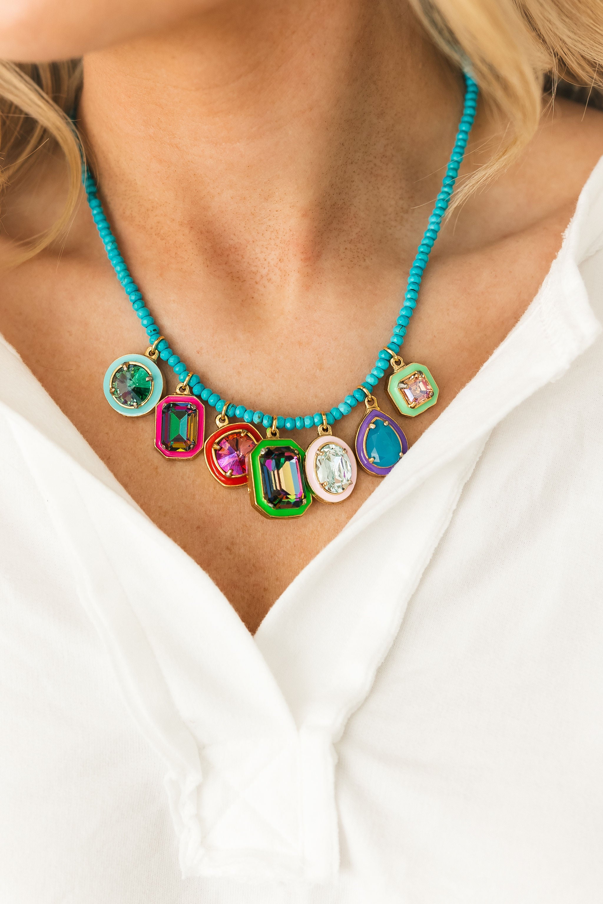 Make a statement with this Clemmy Necklace! Show off your personality with its antique gold plated brass base metal, high quality crystals, hand painted enamel and beautiful beads add an extra touch of glam. 17" in length and 4" extension. Designed and made in Canada.