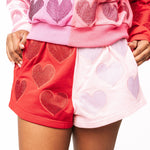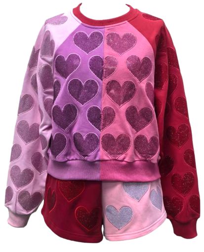 The Queen Of Sparkles Colorblock Rhinestone Hearts Sweatshirt features a relaxed, loose fit with a classic crewneck and long sleeves. Finished with eye-catching rhinestone heart graphics, it’s perfect for styling with the matching shorts or wearing solo for a bold, comfy outfit.
