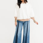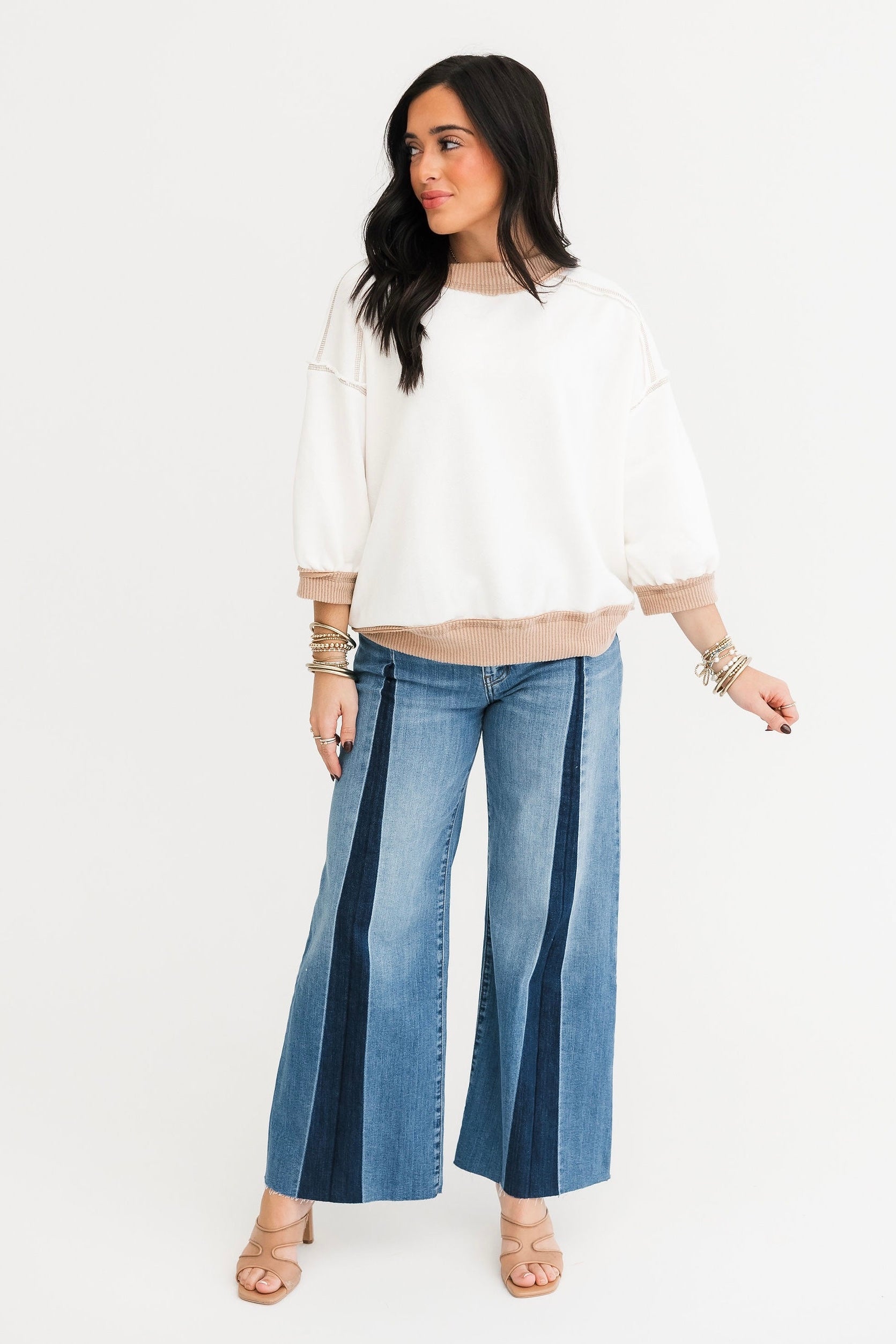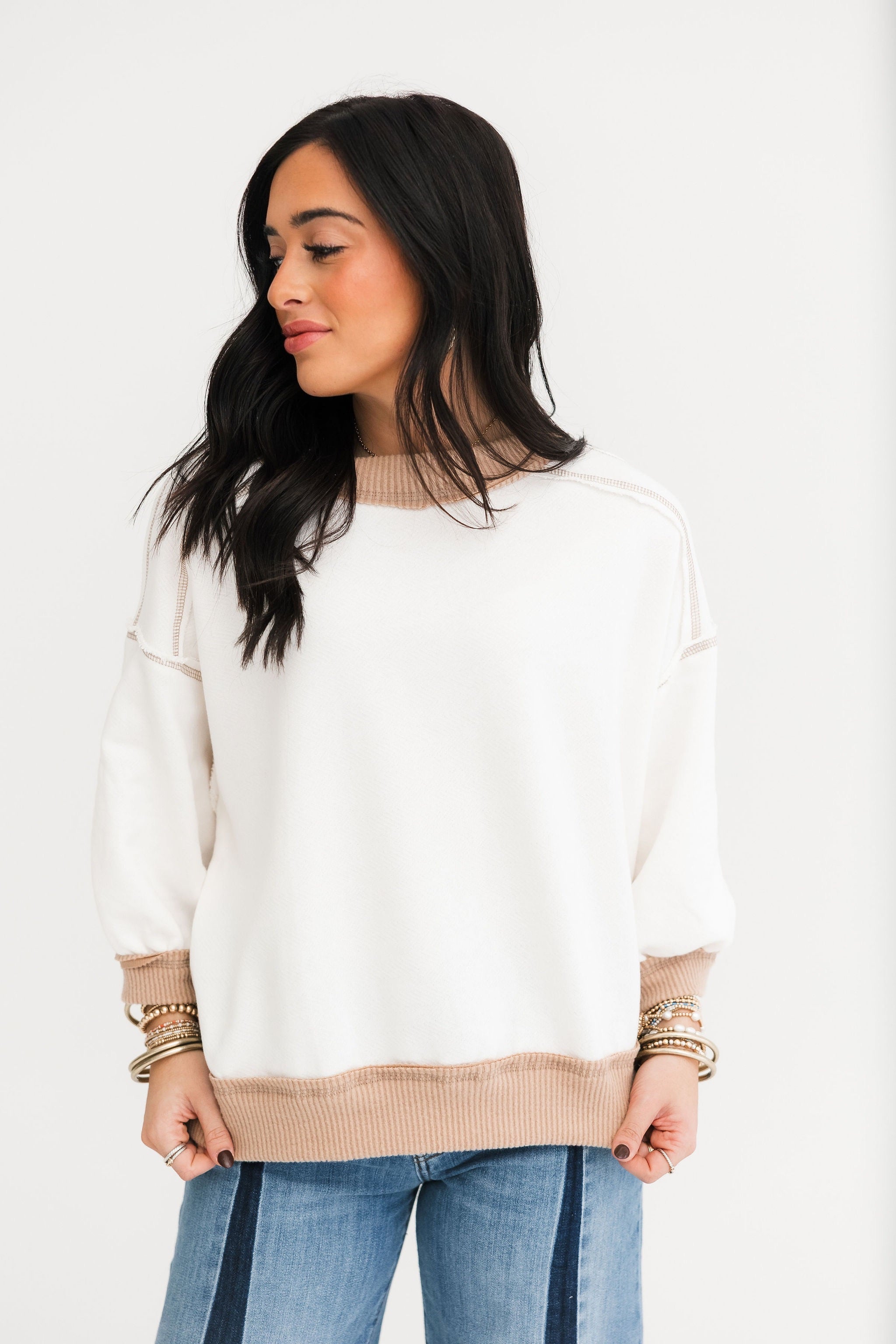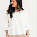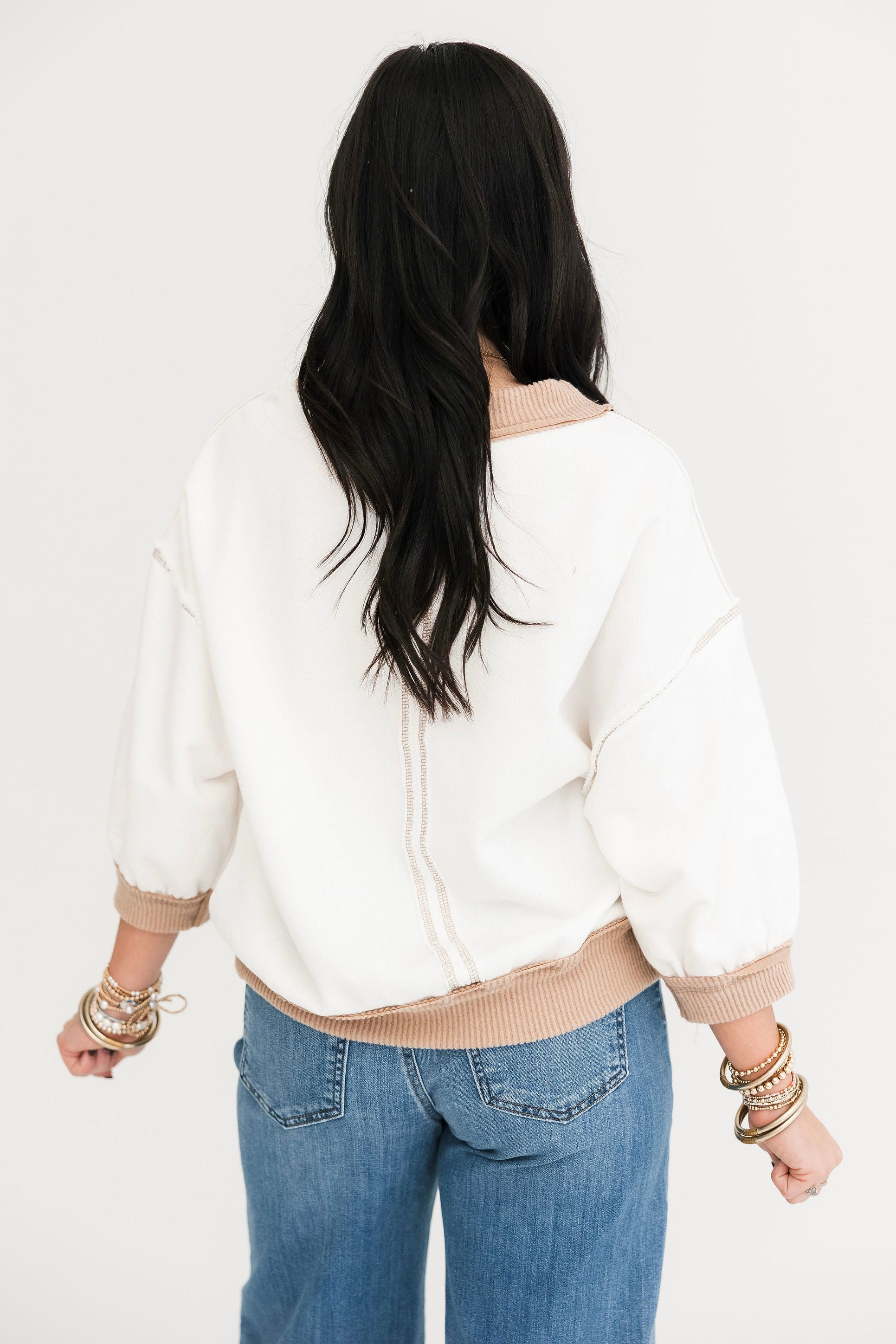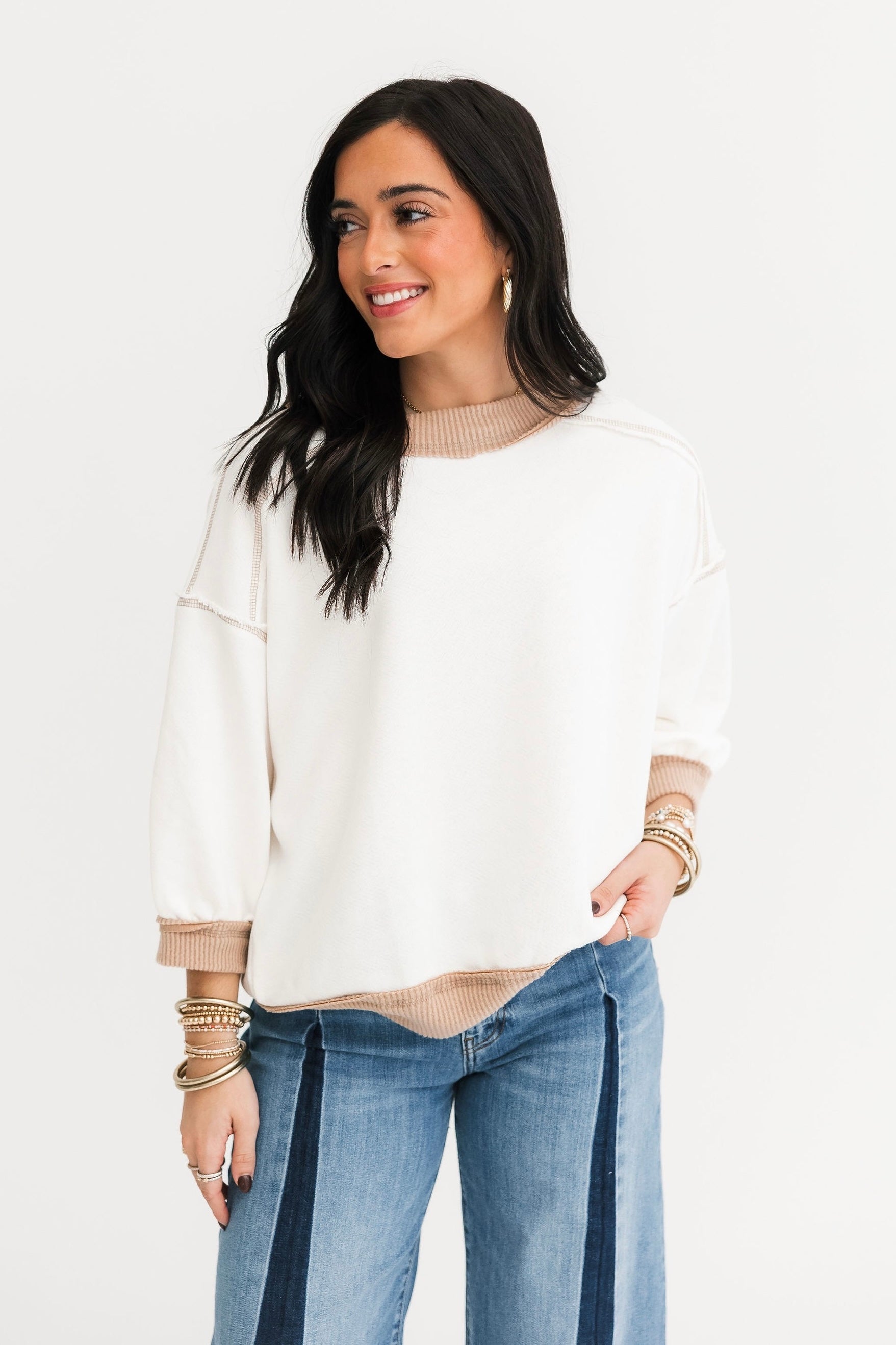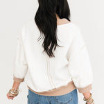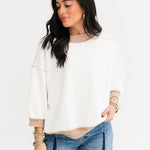 The Contrast Edge Top features a relaxed fit with 3/4 sleeves, a classic crew neckline, and contrast stitching throughout. Exposed seaming adds texture and interest, making it ideal for pairing with jeans, leggings, or comfy shorts. Simple—yet standout. Sage is wearing a small.