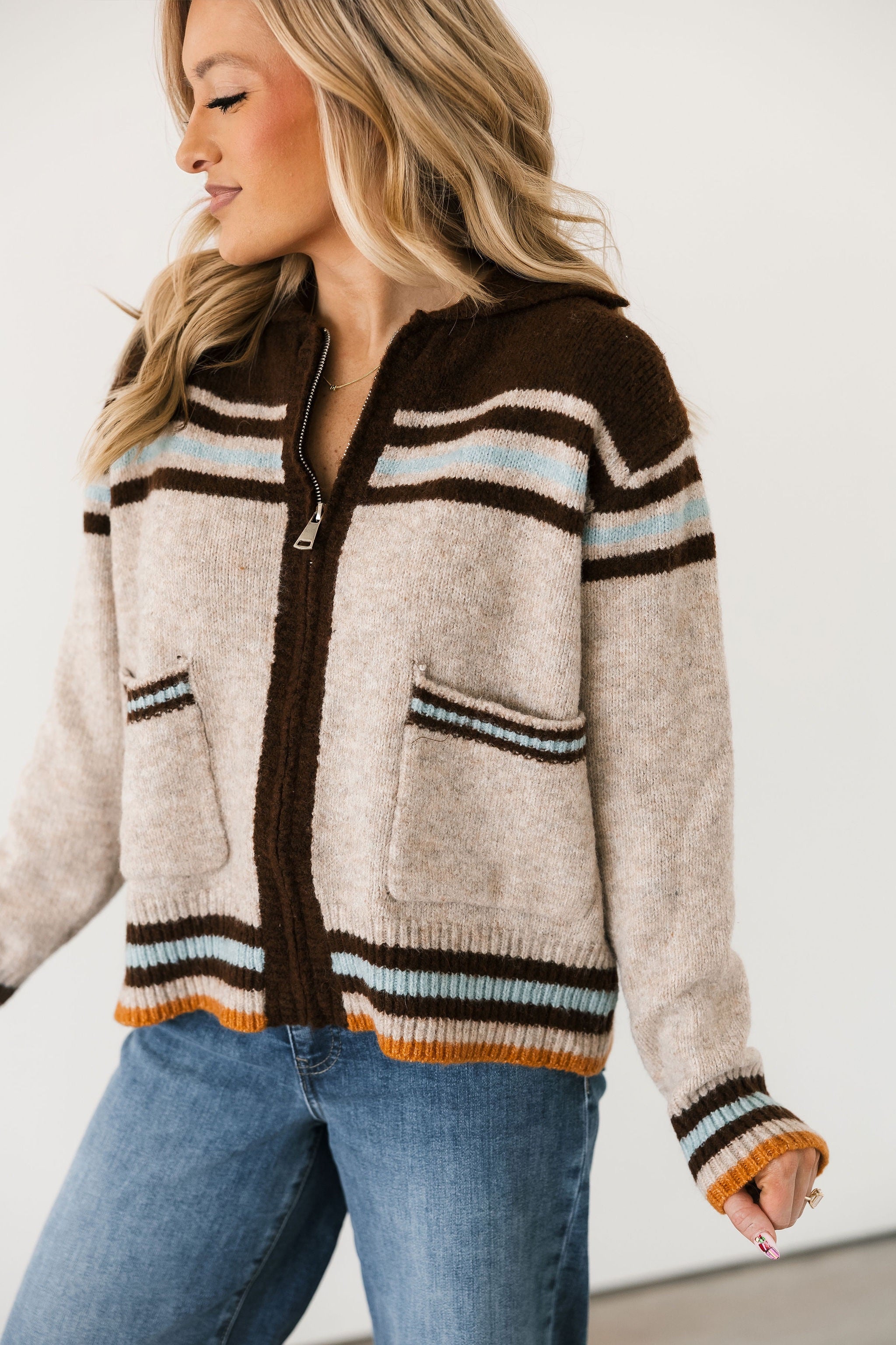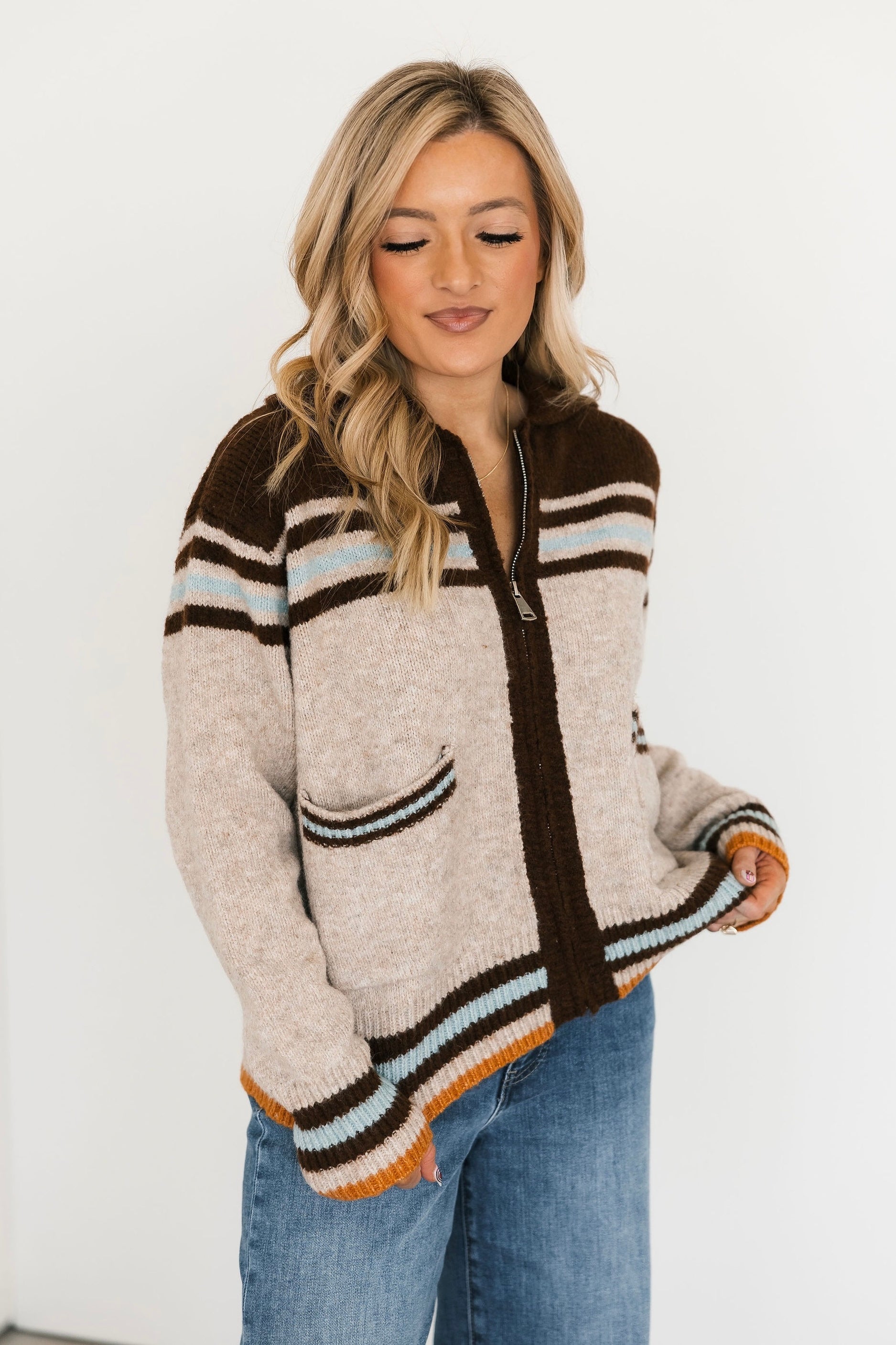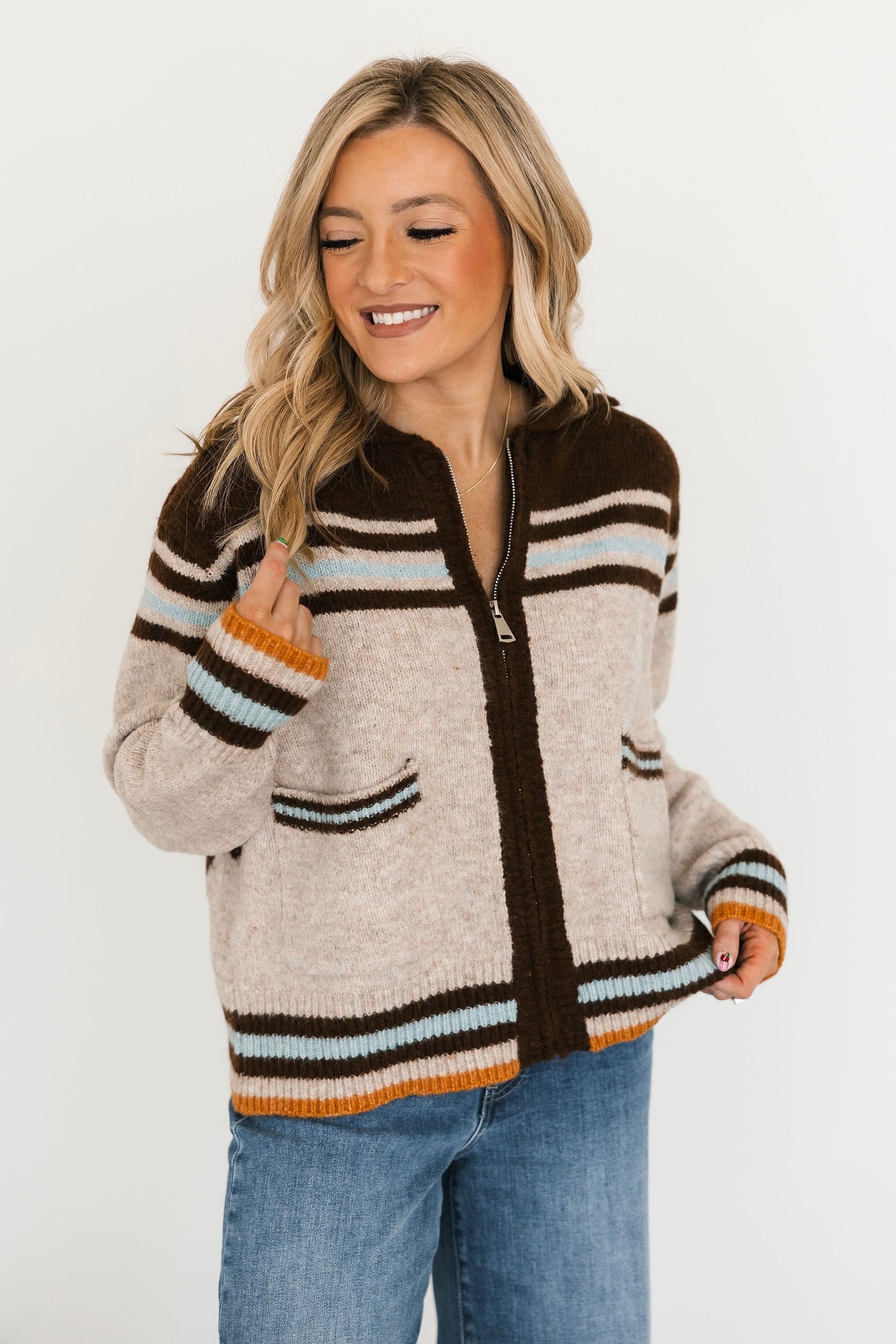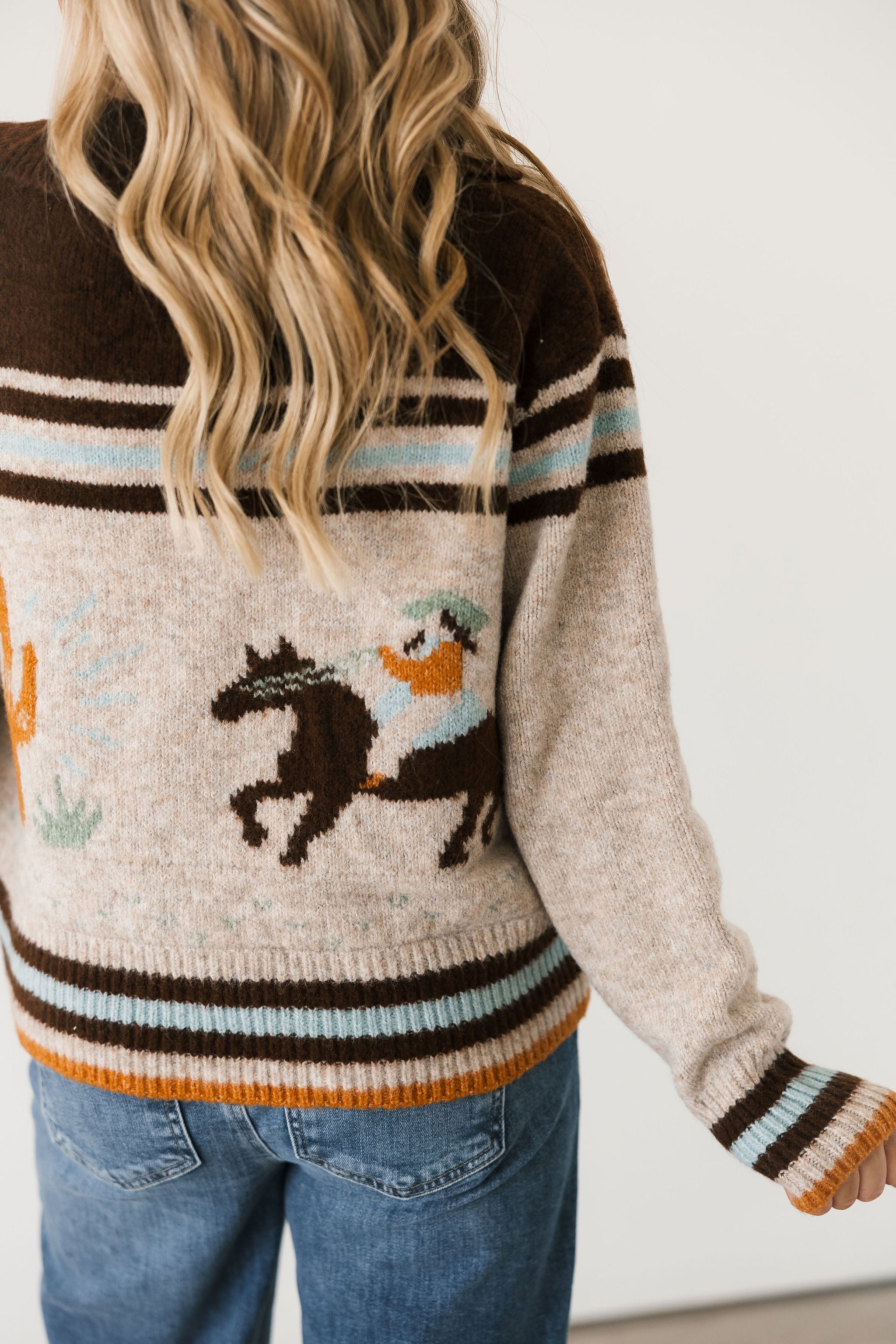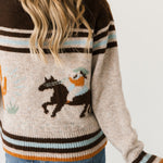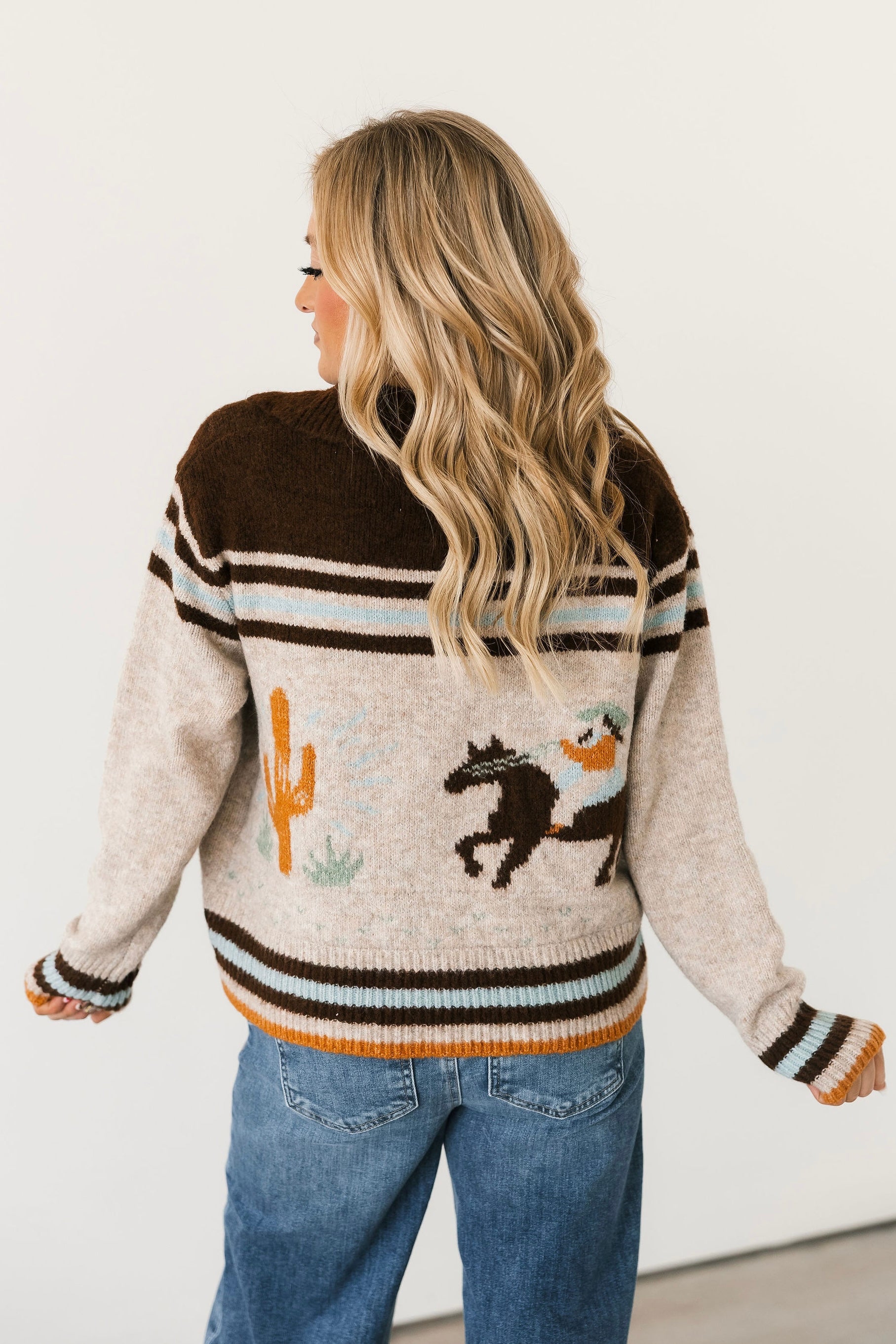 The Cowboy Desert Zip Knit Cardigan features a relaxed fit with a soft knit feel that’s perfect for layering. Designed with a collared neckline, long sleeves, and a front zipper closure, it blends casual comfort with subtle statement details. Finished with front pockets for an effortless, worn-in feel, this piece works just as well thrown on over a tee as it does styled as a standalone top. Lexi is wearing an xs.