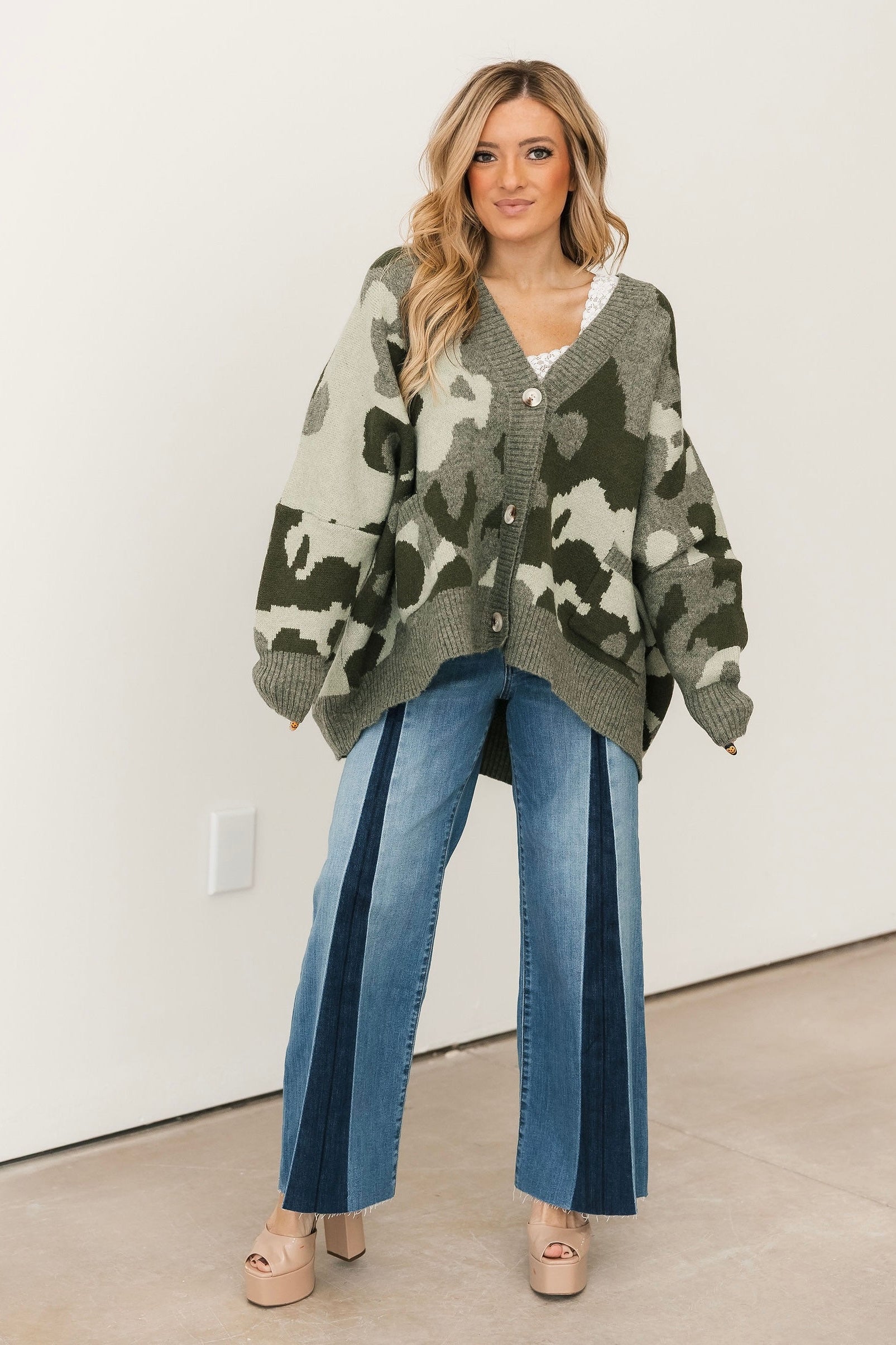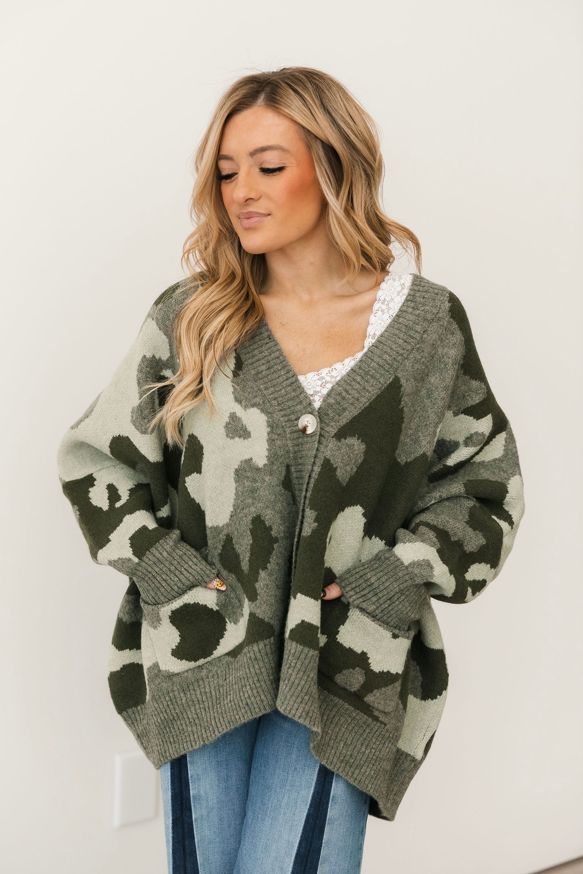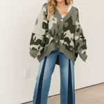 This oversized knit cardigan features long sleeves, a full front button closure, and a soft, cozy knit that keeps you warm without sacrificing style. Finished with an olive camo print, it’s the ideal throw-on layer for effortless, casual outfits all season long. Lexi is wearing a small.