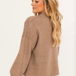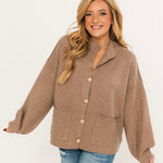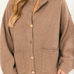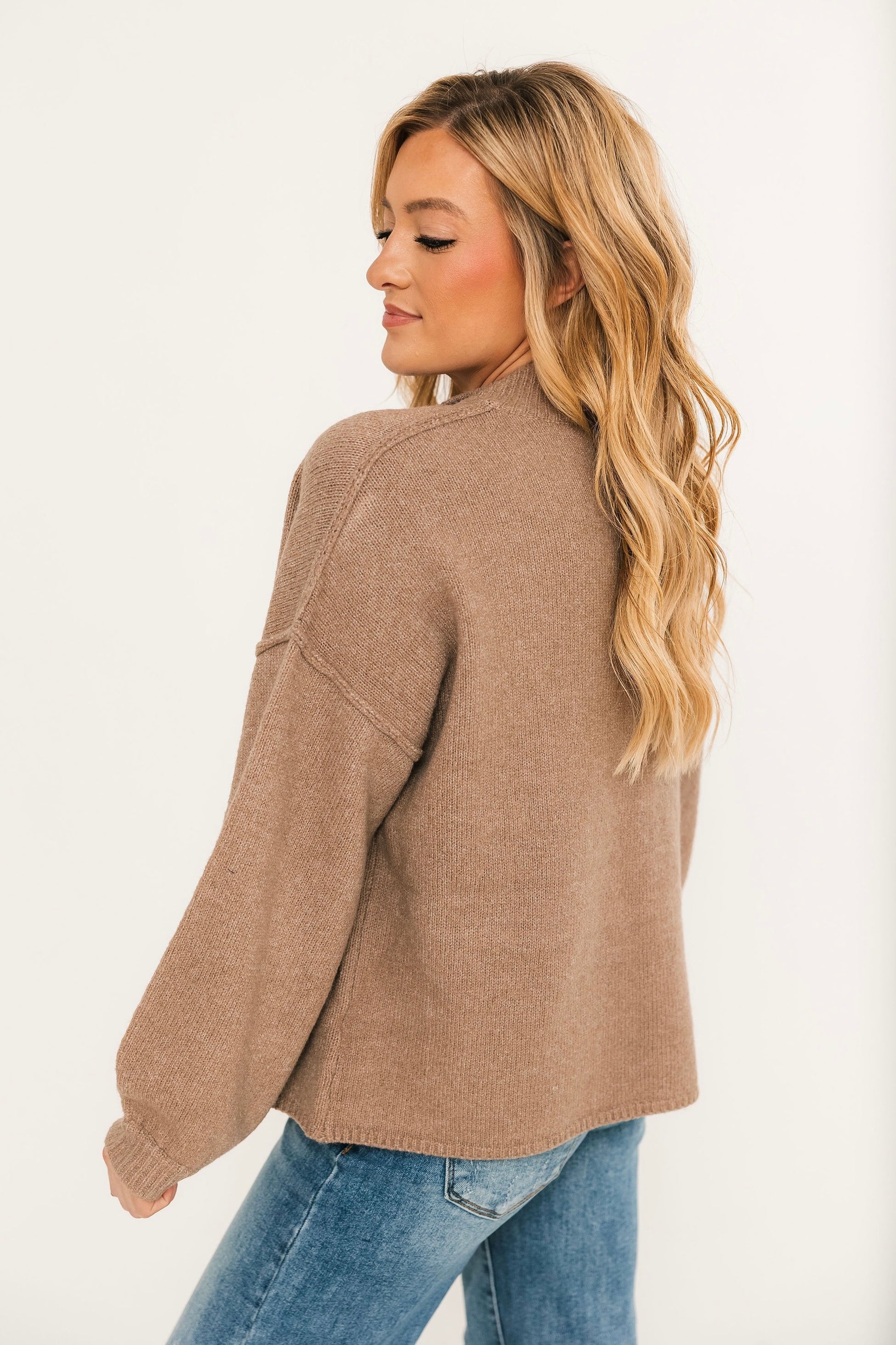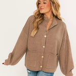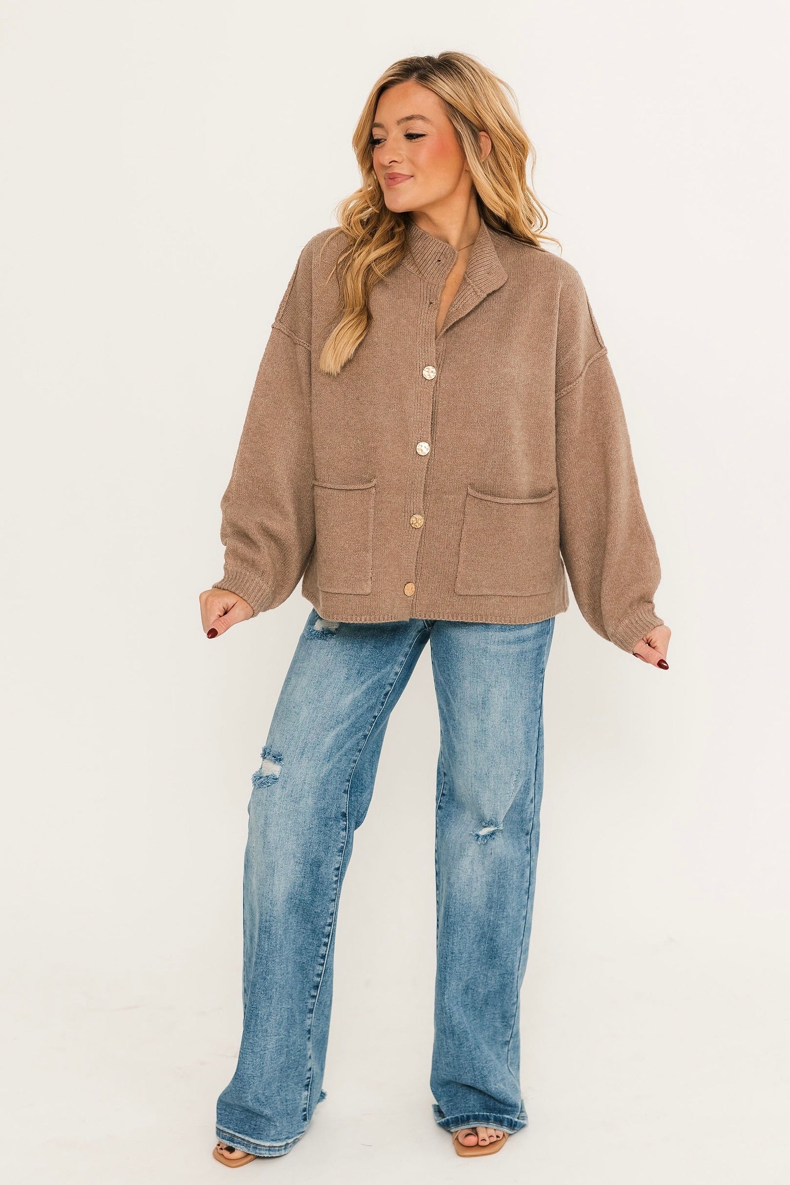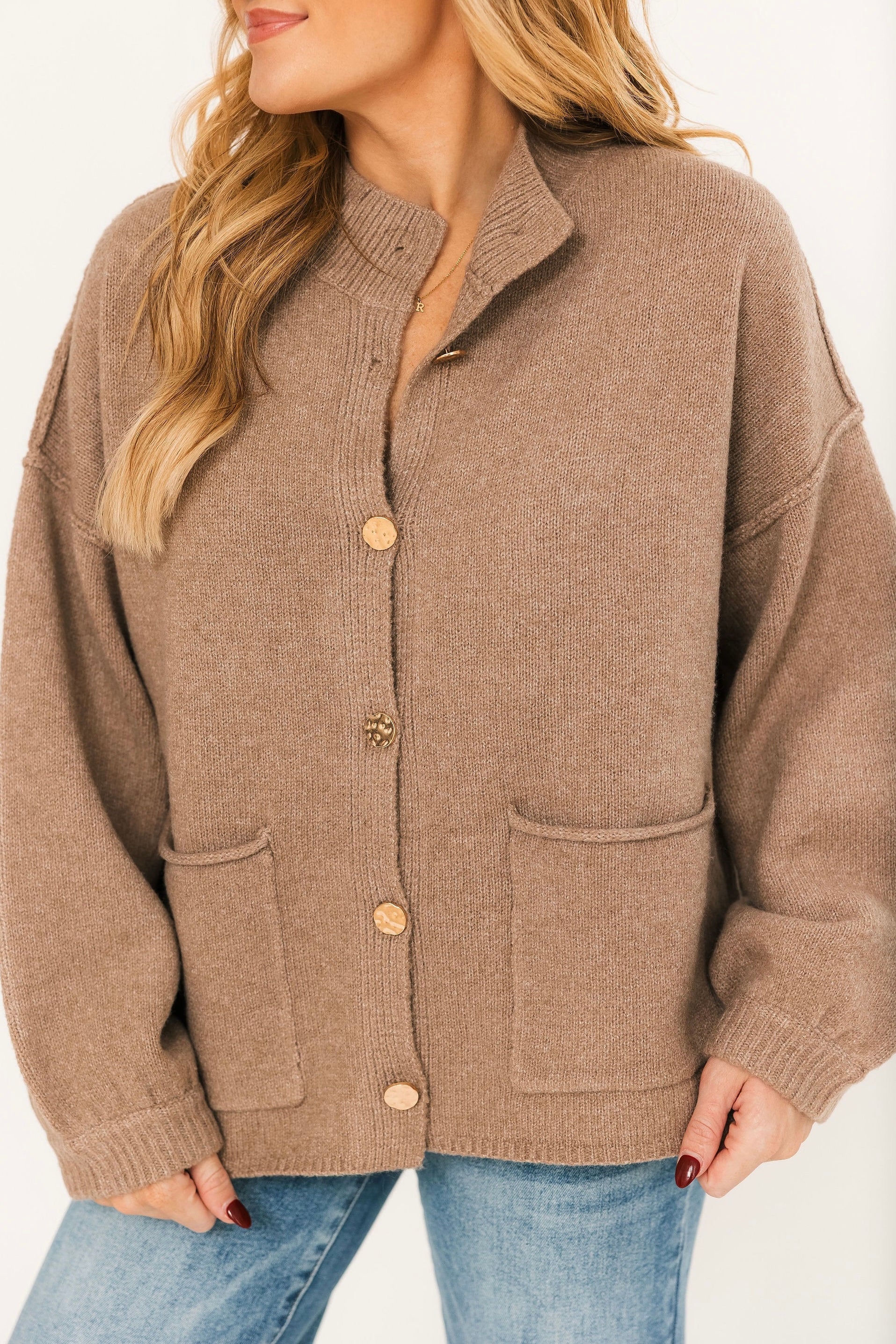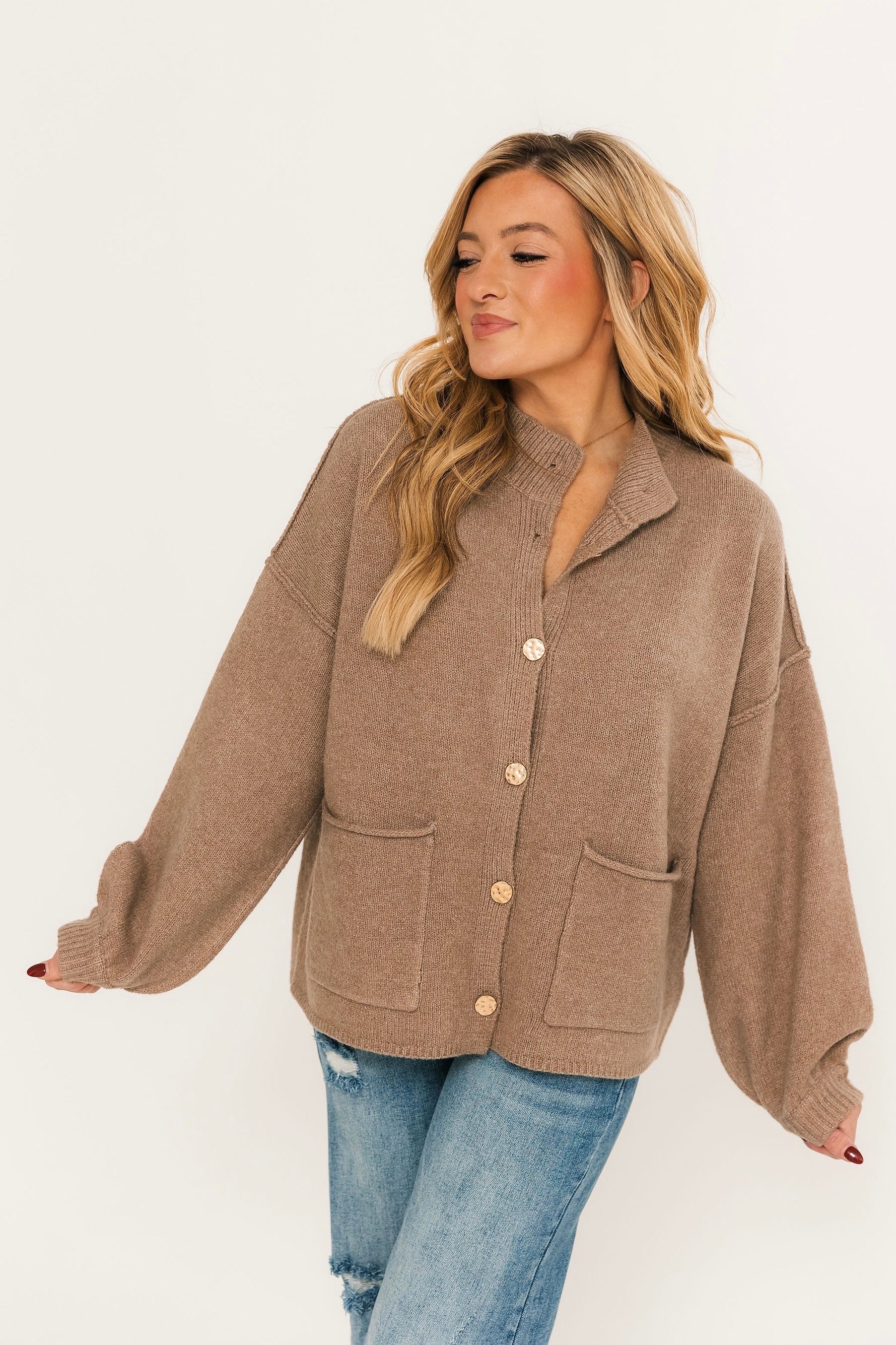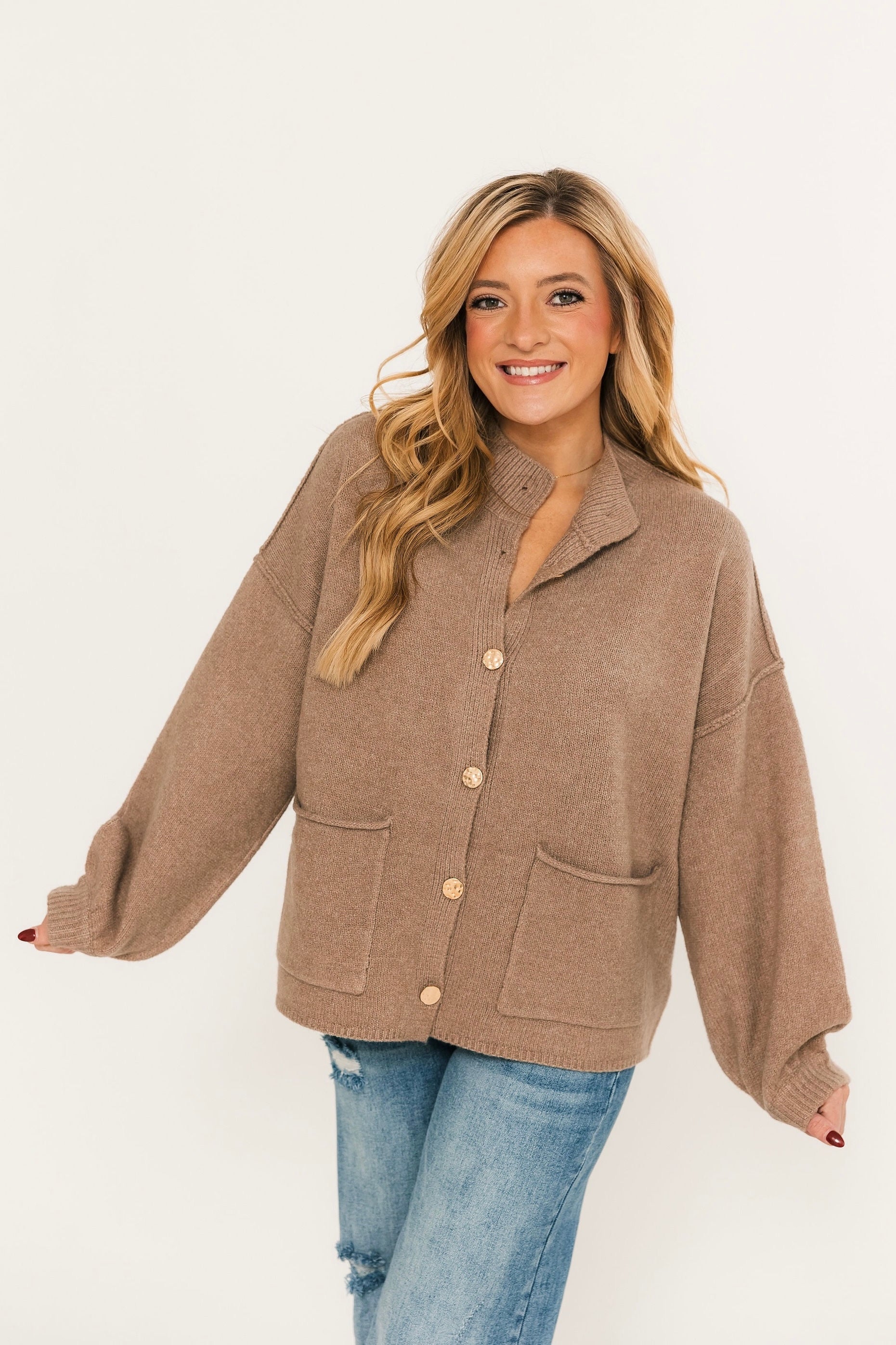 The Cozy Cutie Cardigan in Toast features a relaxed fit with a mock neck and long sleeves. Gold button front closure adds a touch of elegance, while front pockets offer both style and practicality. Perfect for layering over tees, blouses, or dresses for a polished, everyday look. Lexi is wearing a small.