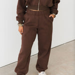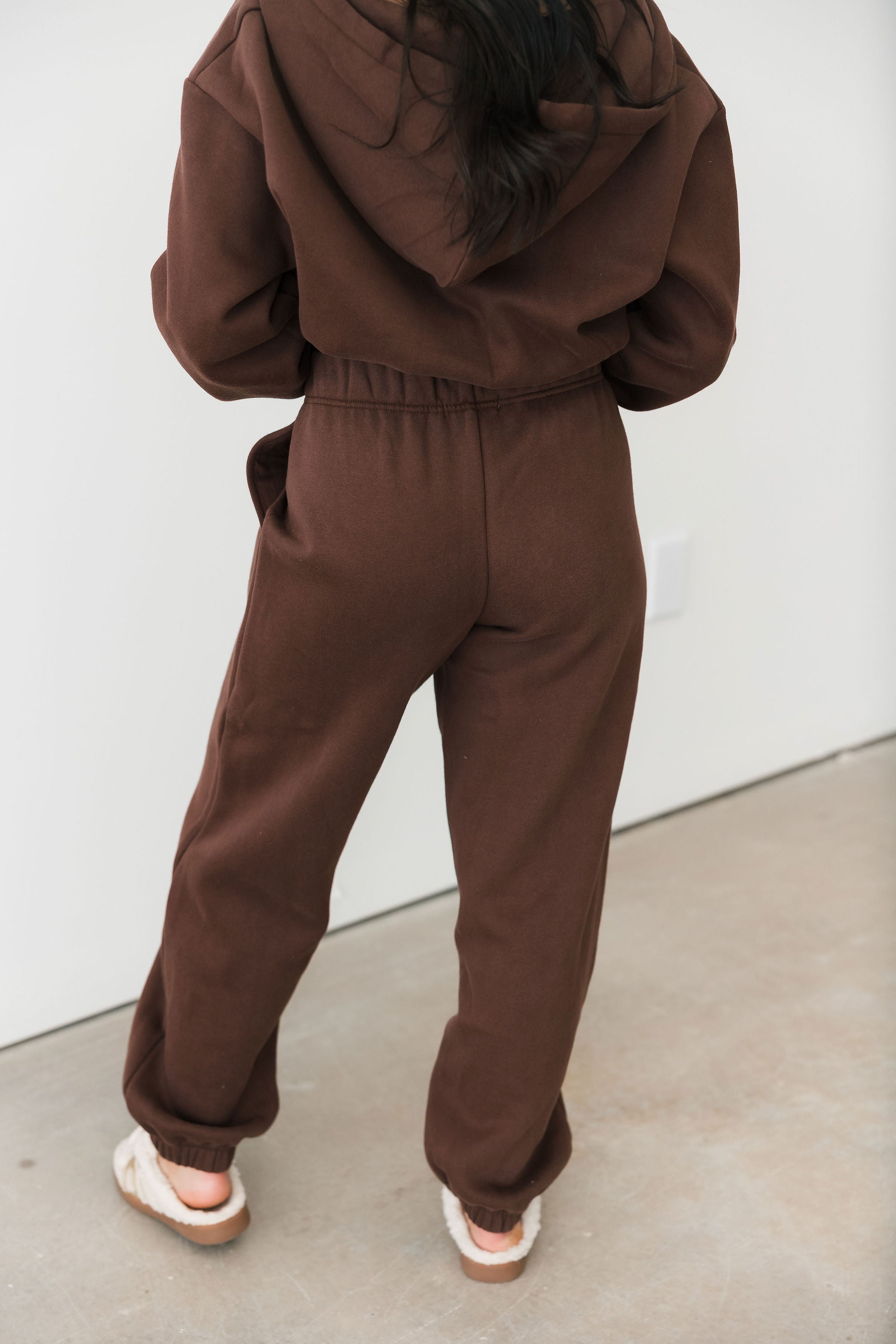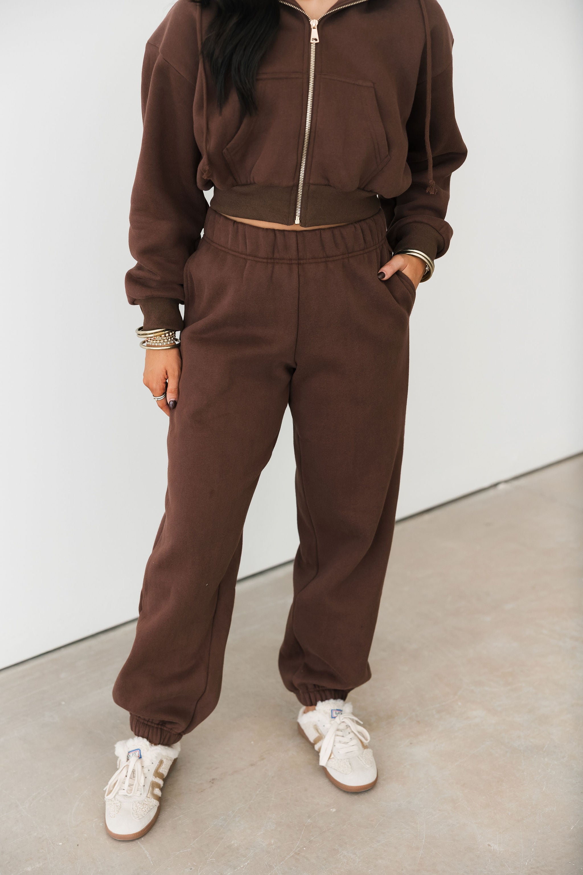 The Cozy Fleece Sweatpants in Espresso feature a relaxed fit with an elastic waistband, elastic cuffs at the ankles, and a soft fleece lining. Designed to pair perfectly with the matching hoodie, they’re the ultimate in casual, comfy style. Sage is wearing a small.