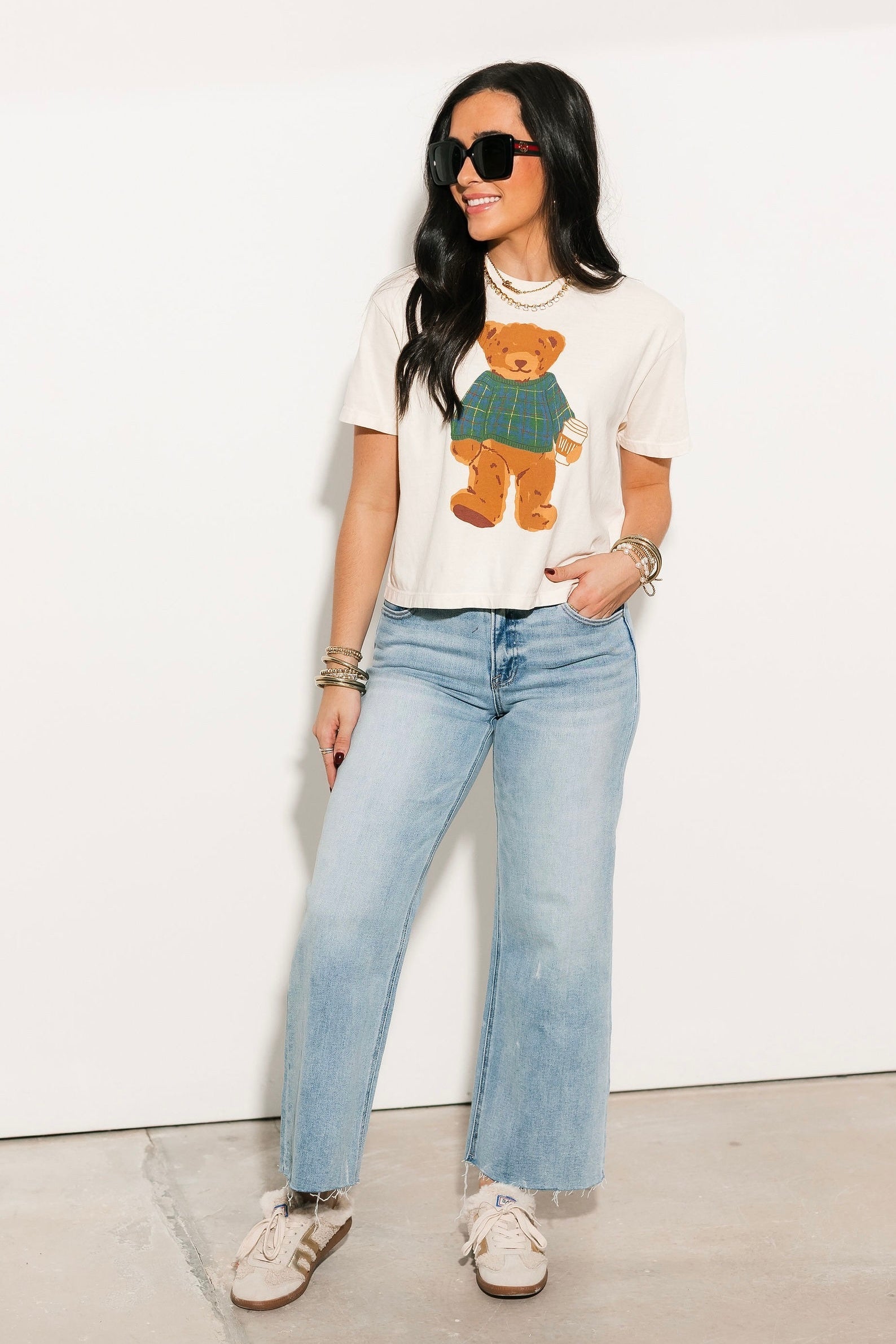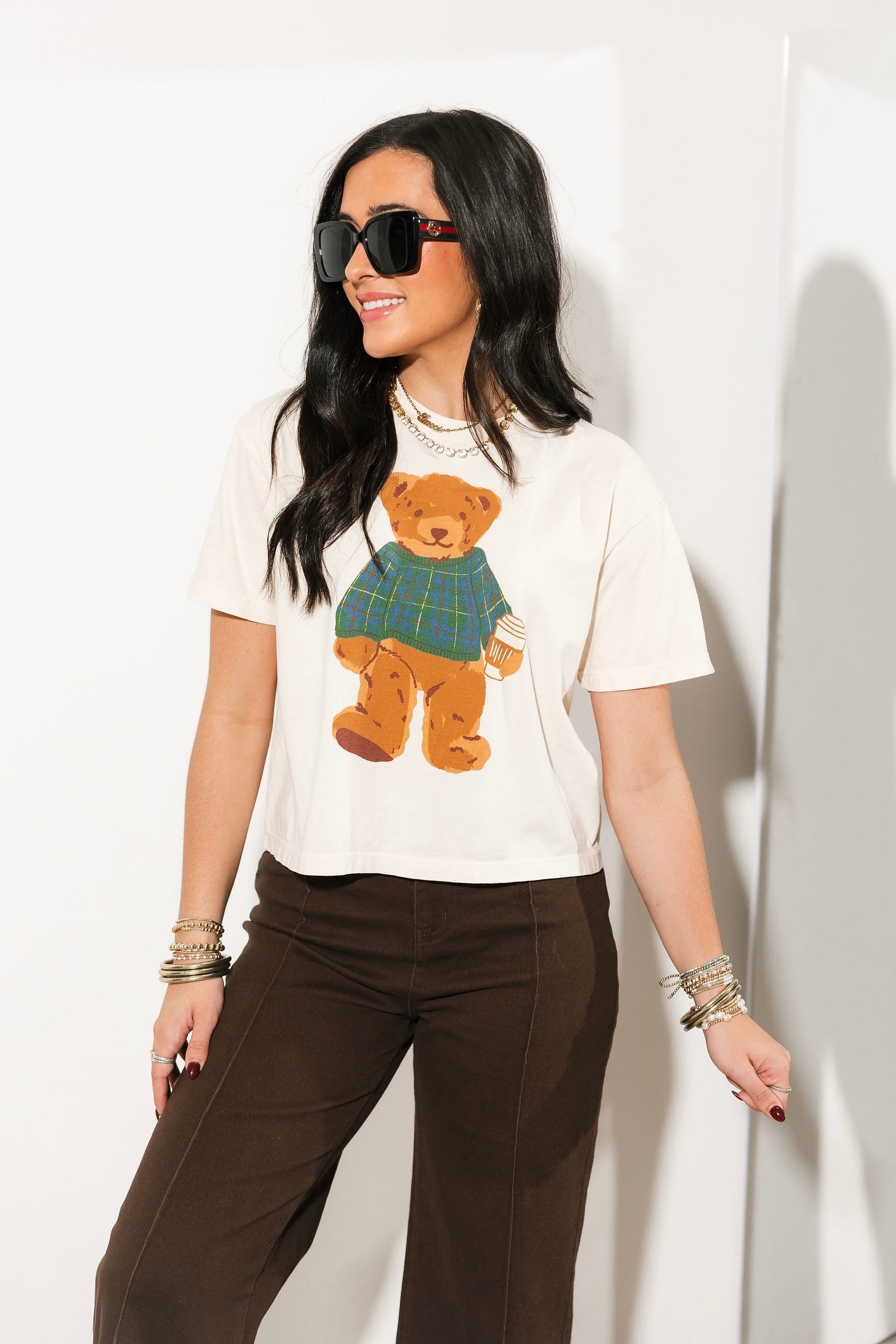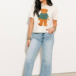The Cozy Plaid Bear Crop Tee features a relaxed, cropped silhouette with a classic crew neckline and easy short sleeves. Soft and comfortable, it’s perfect for pairing with high-waisted denim, joggers, or layered under your favorite flannels and jackets. A laid-back essential with a touch of whimsy. Sage is wearing a small.