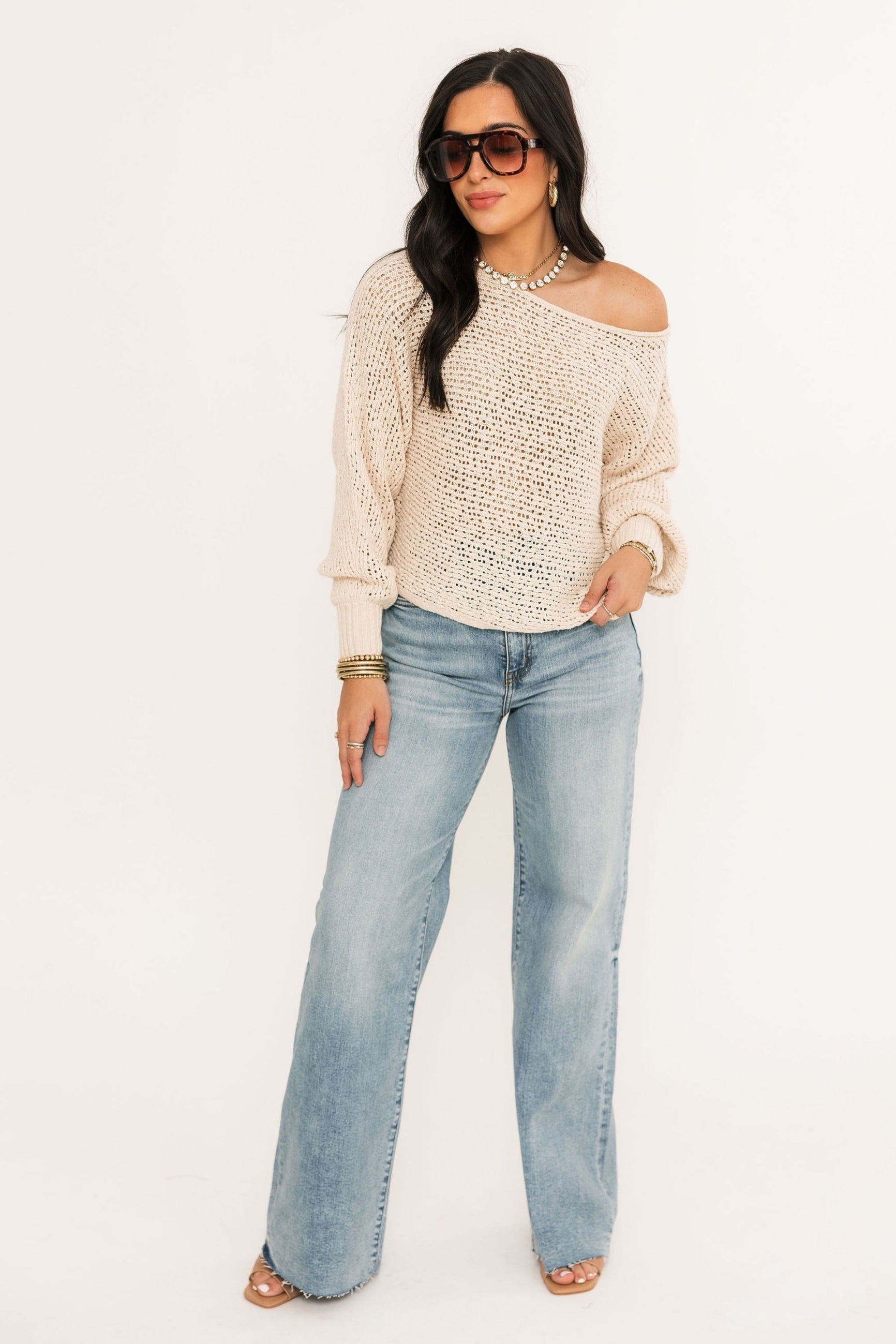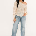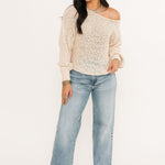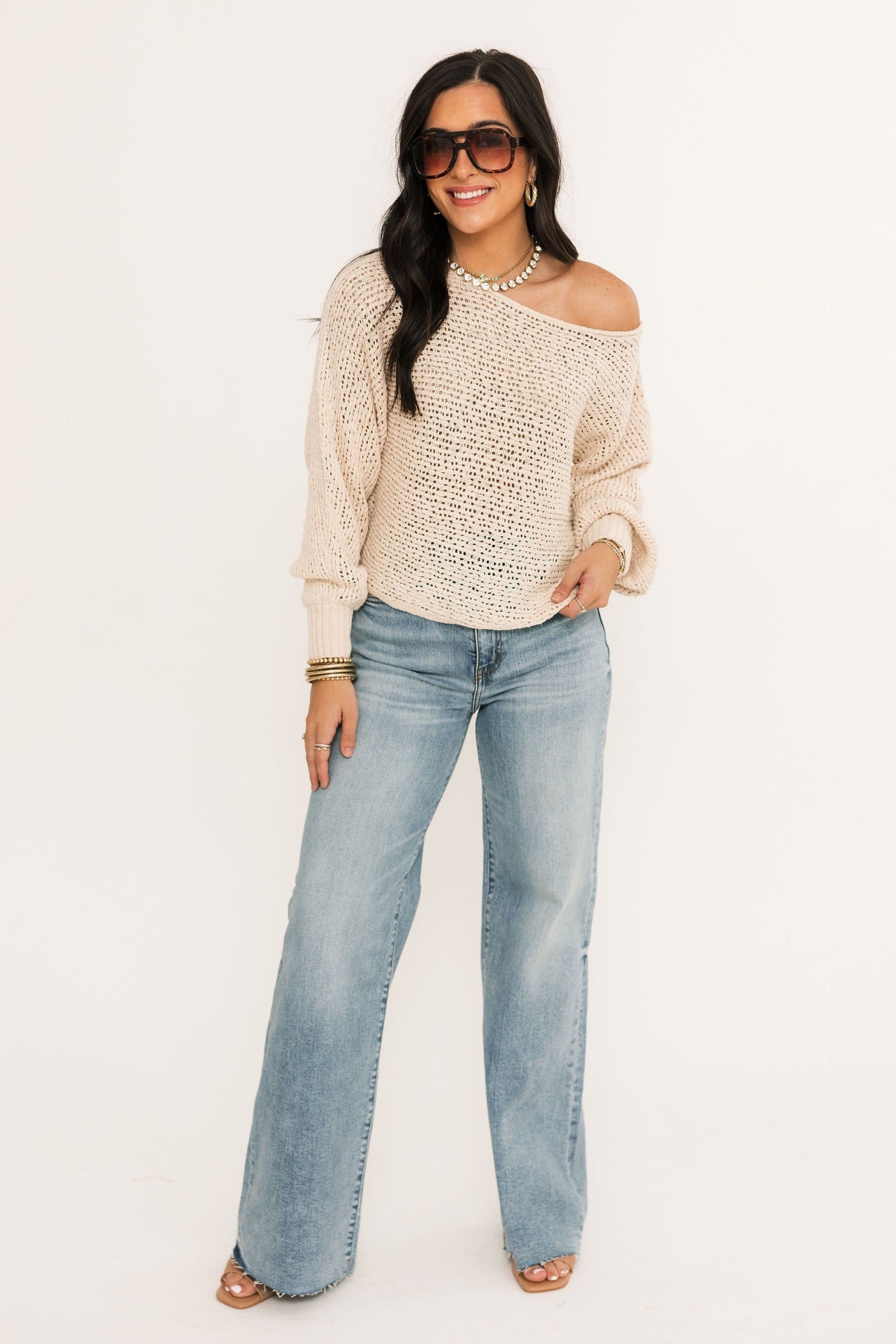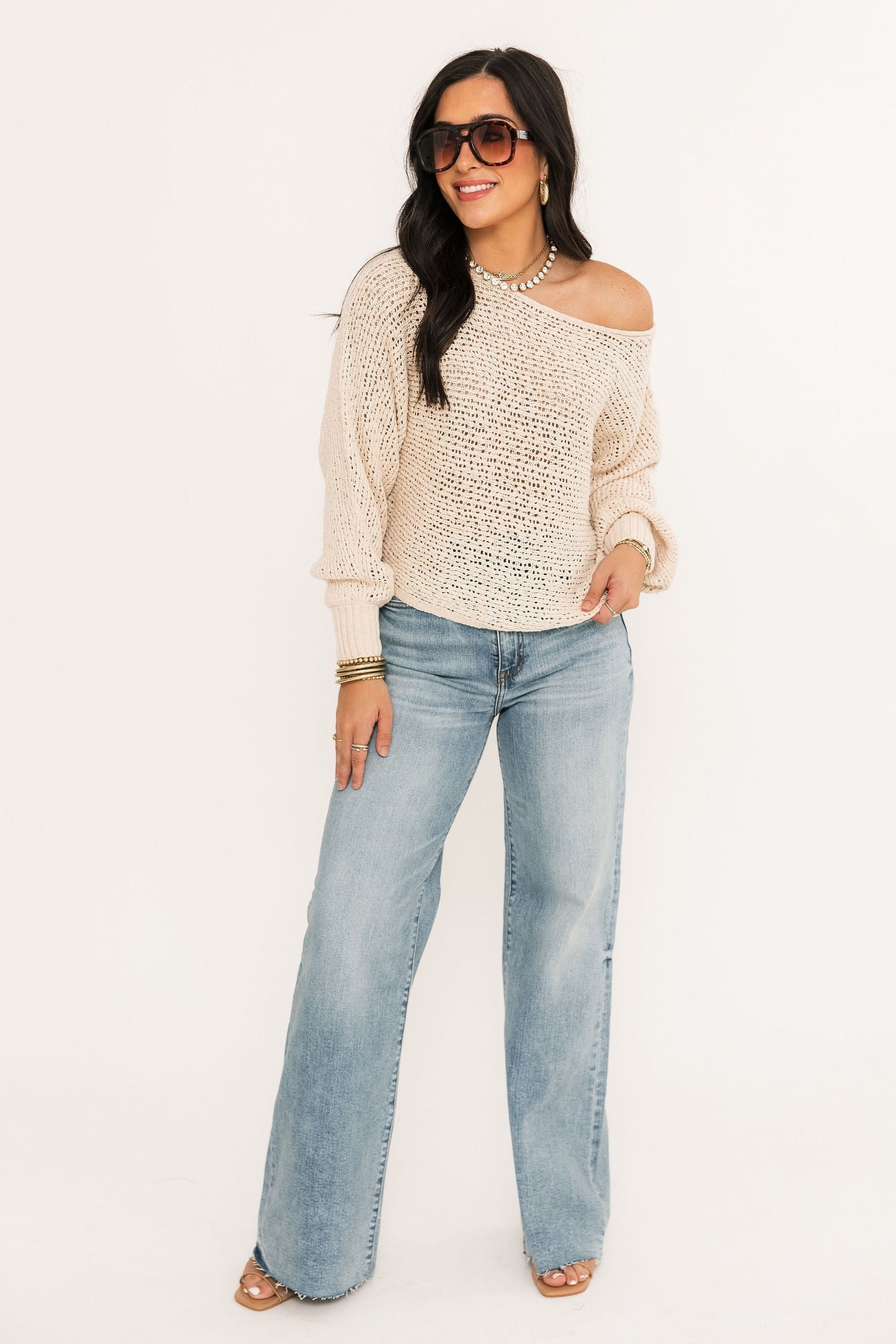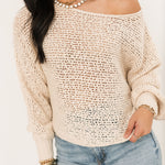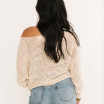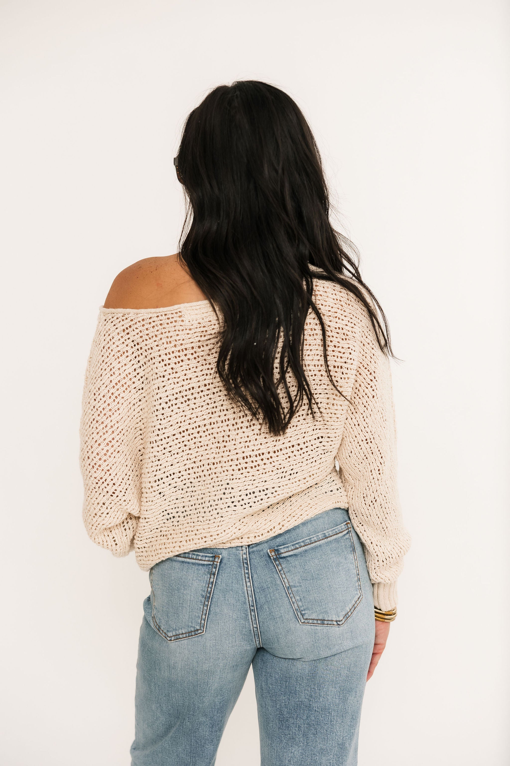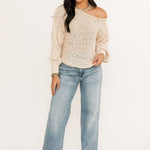 The Crochet Slouchy Sweater In Natural features a relaxed, slouchy fit with a classic round neckline and long sleeves. Designed in a soft crochet knit, it offers the perfect mix of texture and ease. Pair it with denim cutoffs for a casual weekend vibe or layer over a slip skirt for an elevated, relaxed look. Sage is wearing a small.