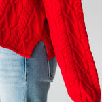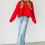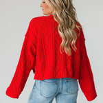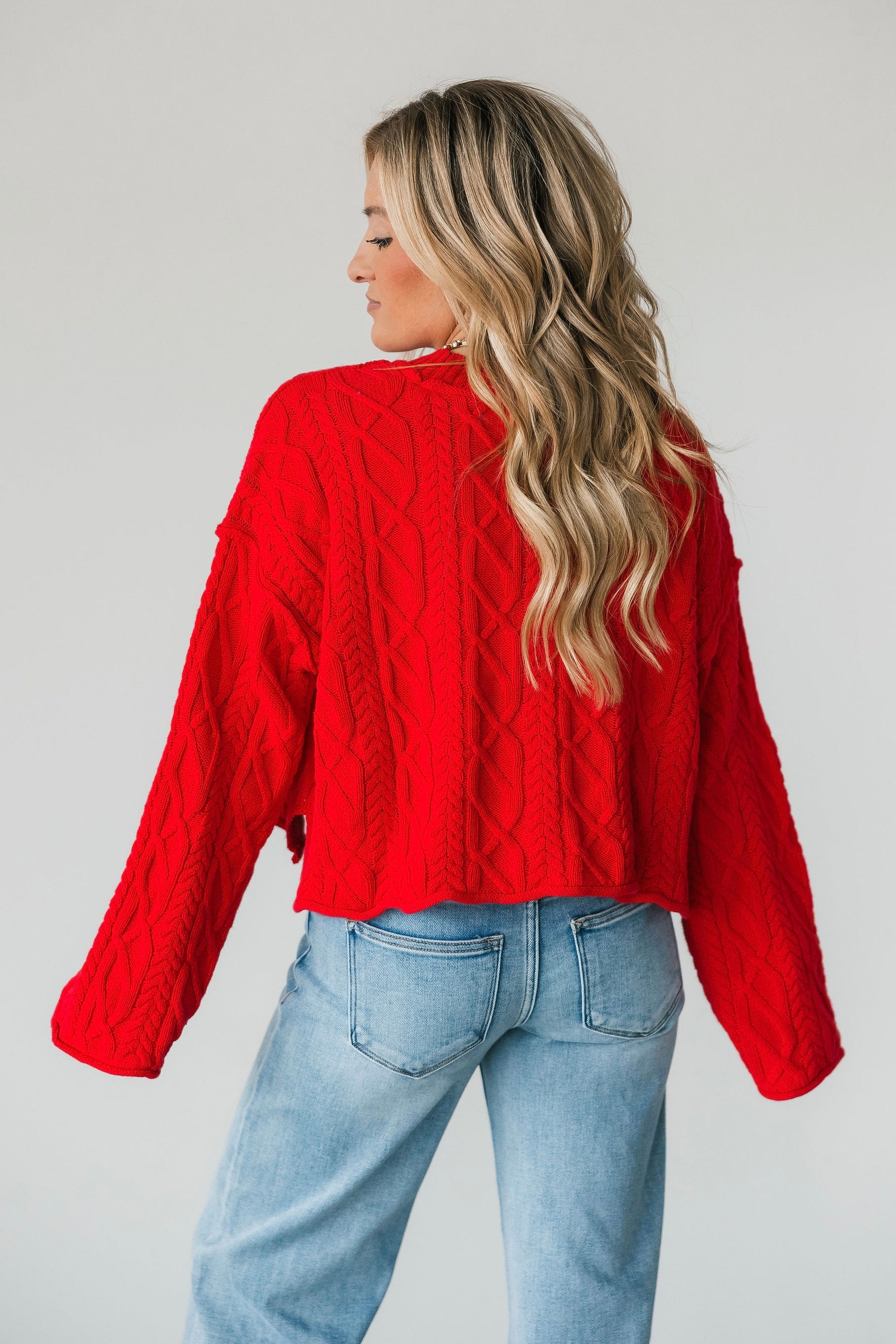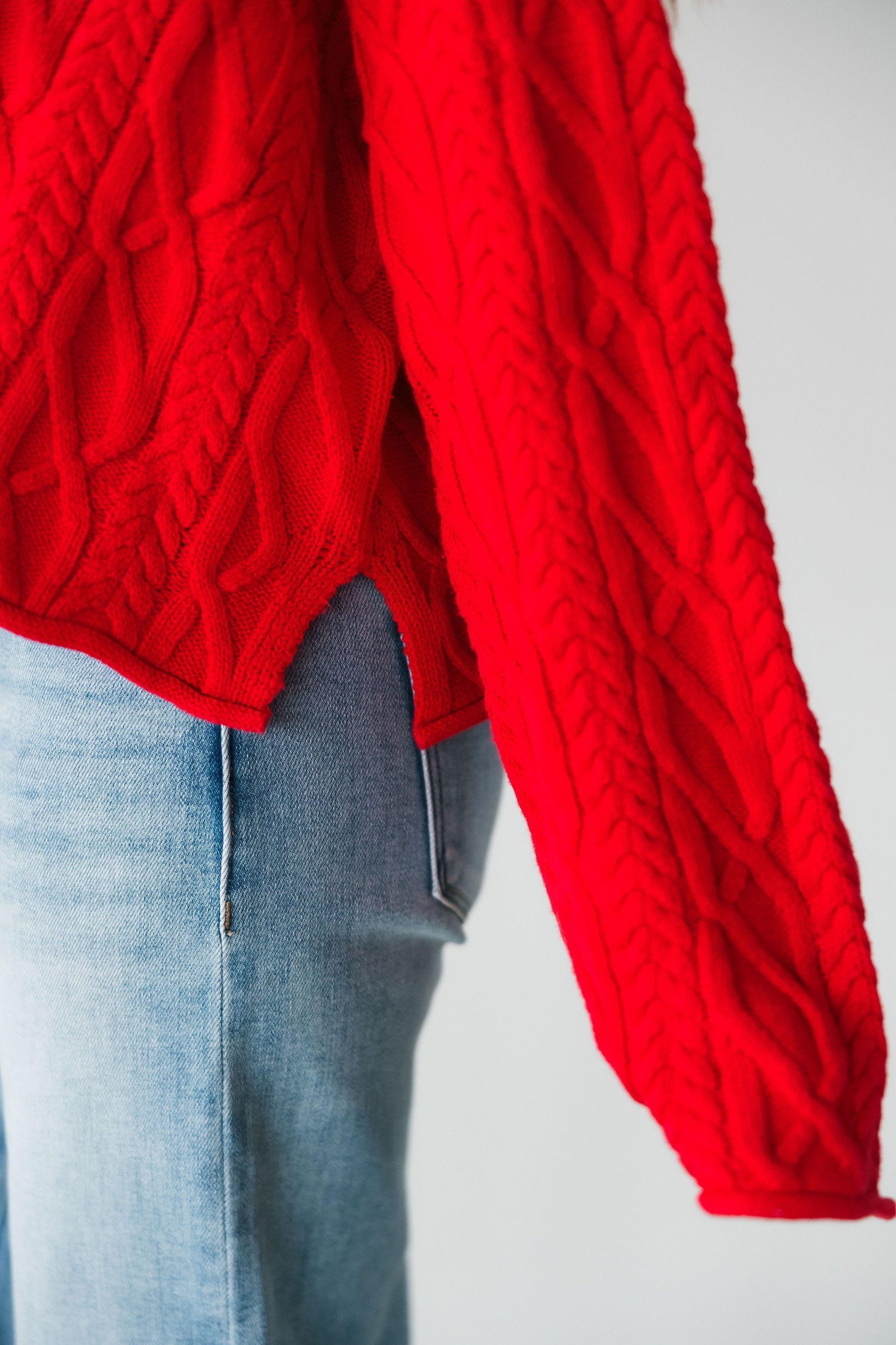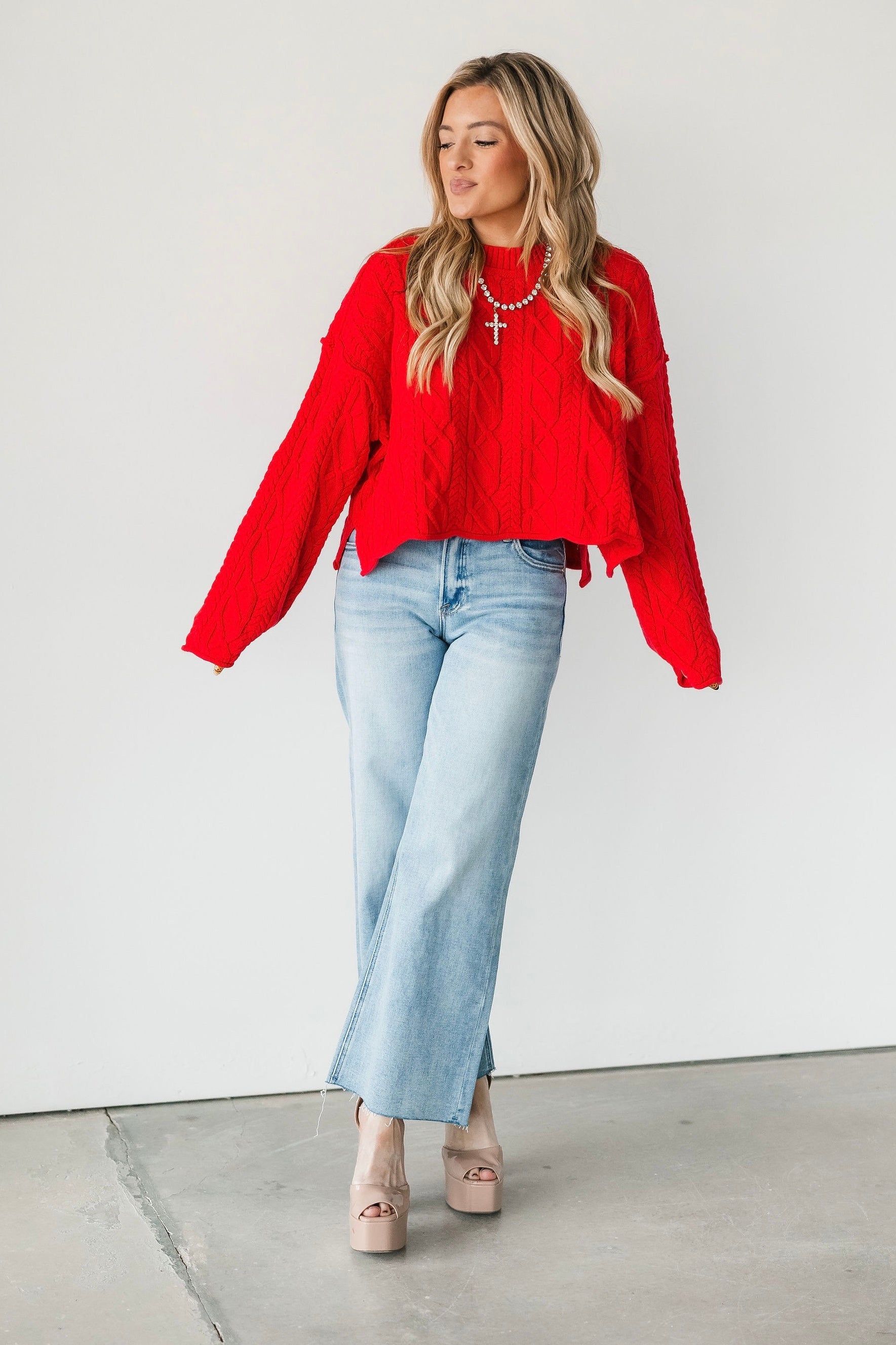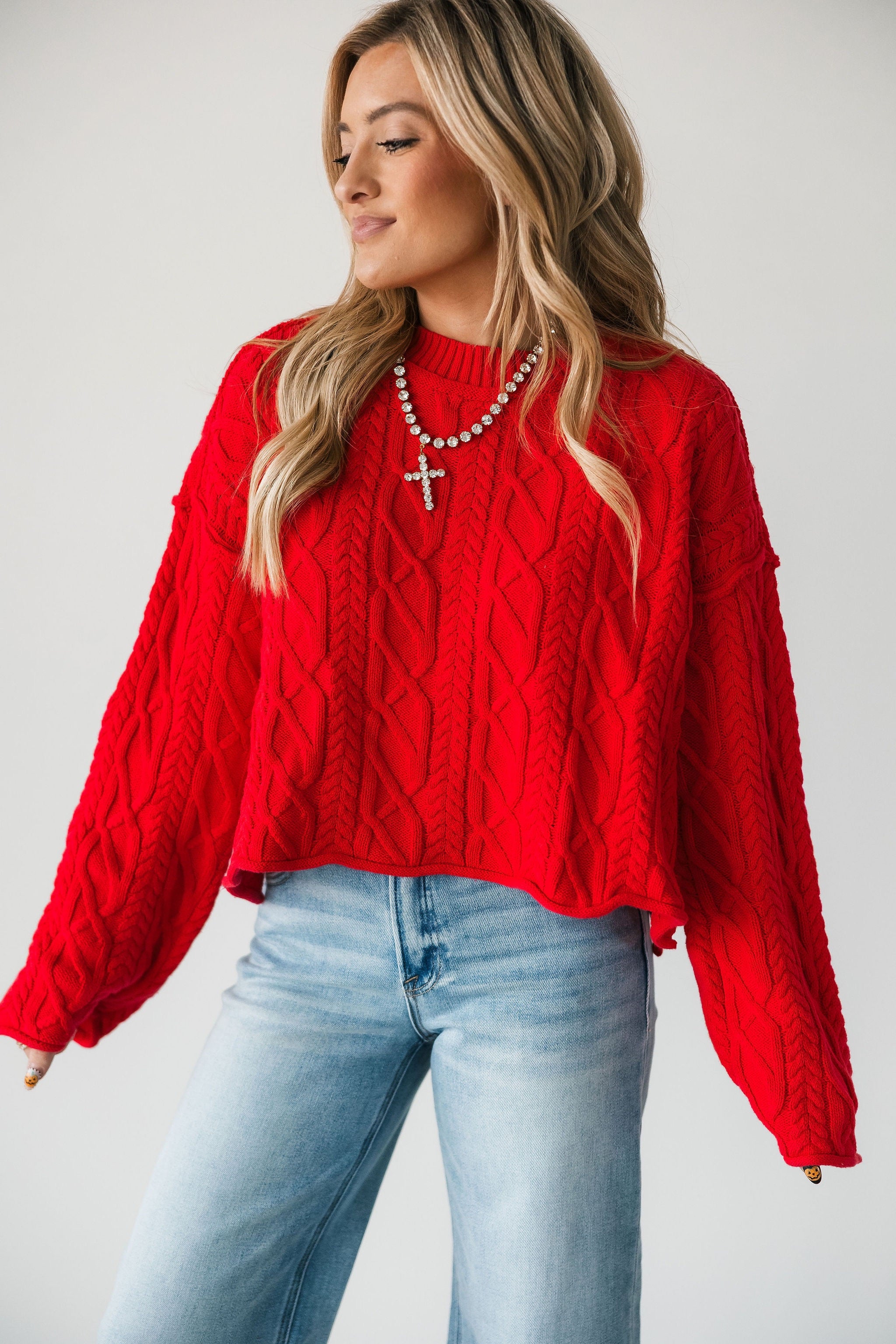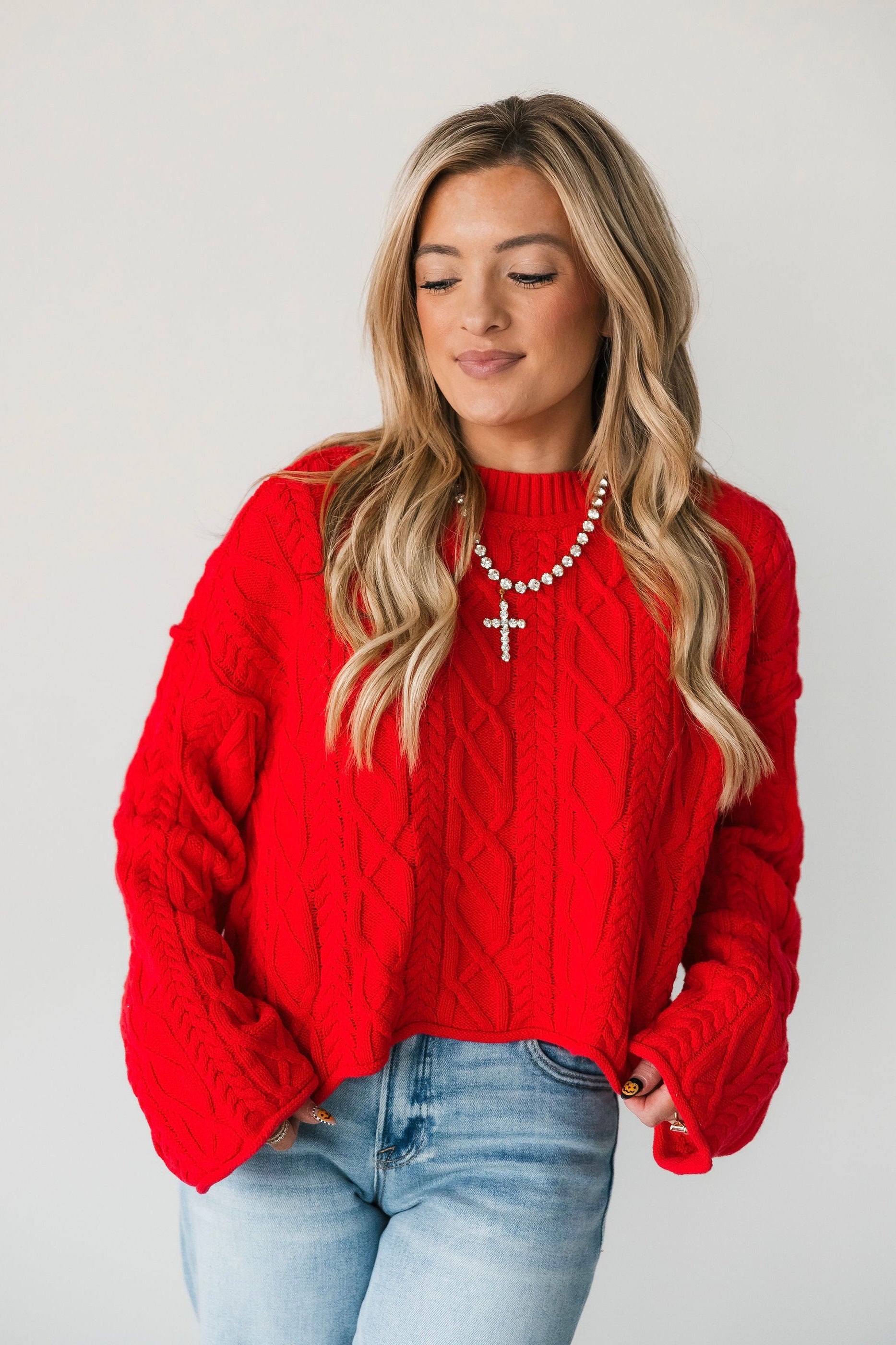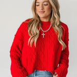 The Cropped Cable Knit Sweater in Red is the perfect blend of comfort and style. Designed with a relaxed fit, this sweater features classic cable-knit detailing, a soft crew neckline, and long sleeves for that timeless cozy feel. The rolled hems give it a modern, lived-in touch, while the cropped length makes it easy to style with both high-rise jeans and skirts. A festive, vibrant red that instantly elevates any winter outfit. Lexi is wearing a small.