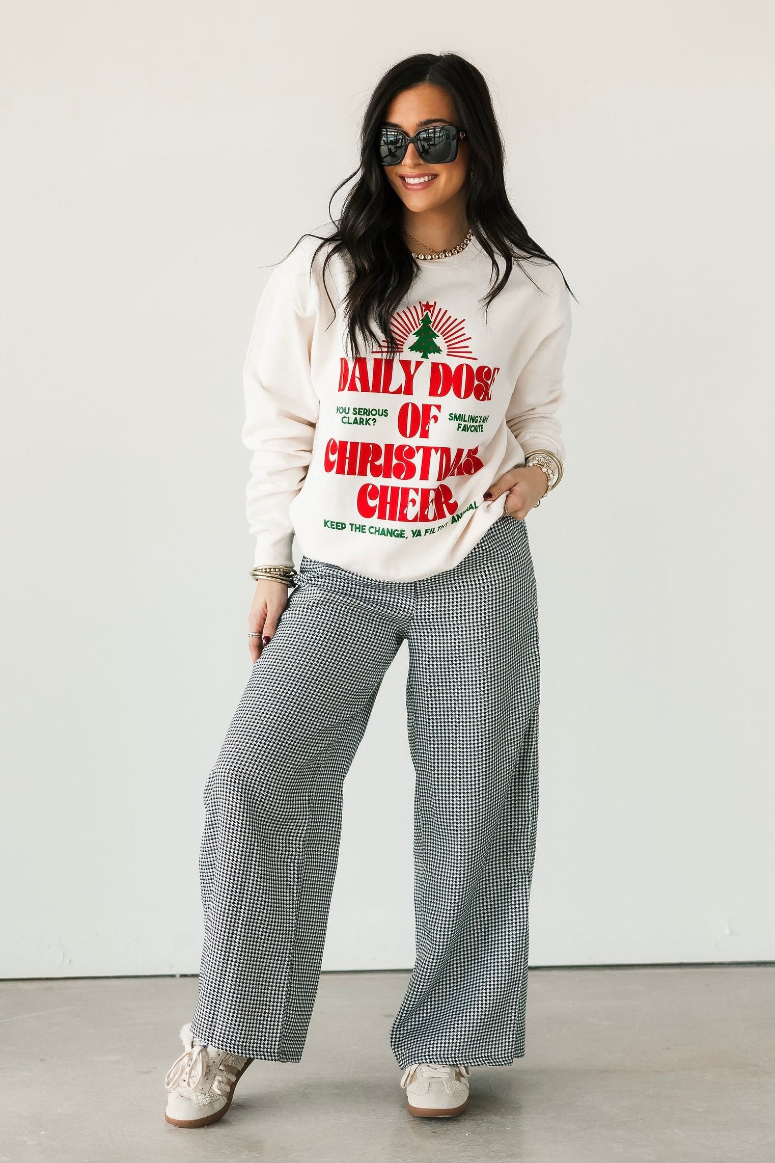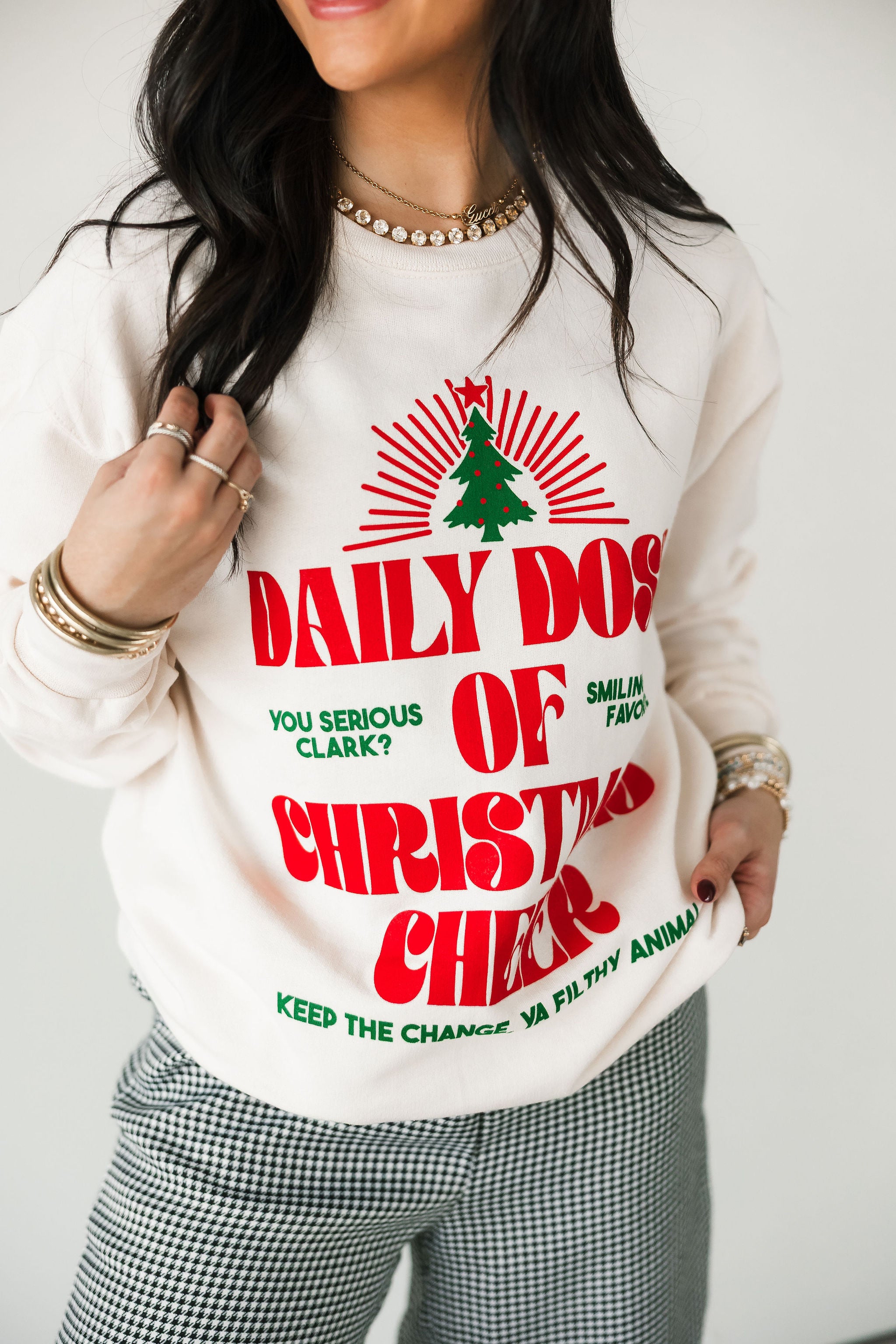 The Daily Dose of Christmas Cheer Crewneck is your go-to sweatshirt for comfy holiday vibes. Designed with a relaxed fit, this crewneck features long sleeves and a classic silhouette made for easy styling. Soft, warm, and festive without being over the top—it’s perfect for everyday wear, gifting, or pairing with leggings for all your merry errands. Sage is wearing a small.