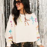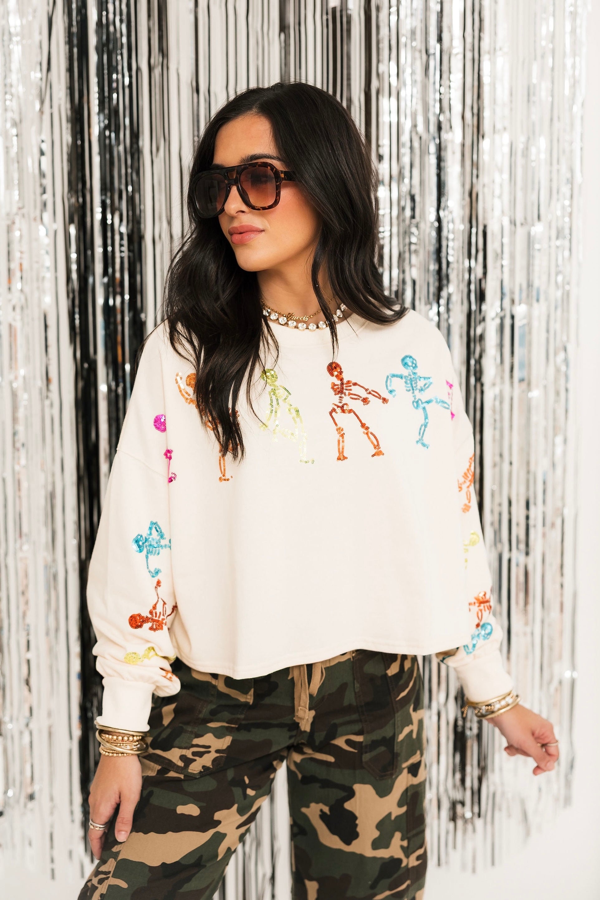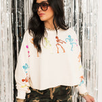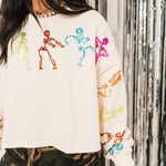 Get into the spooky spirit with the Dancing Skeletons Halloween Top. Bright, multi-colored skeletons dance across a cozy, comfortable fit—perfect for adding a festive, fun twist to your Halloween and fall wardrobe. Sage is wearing a small.
