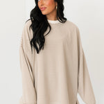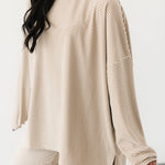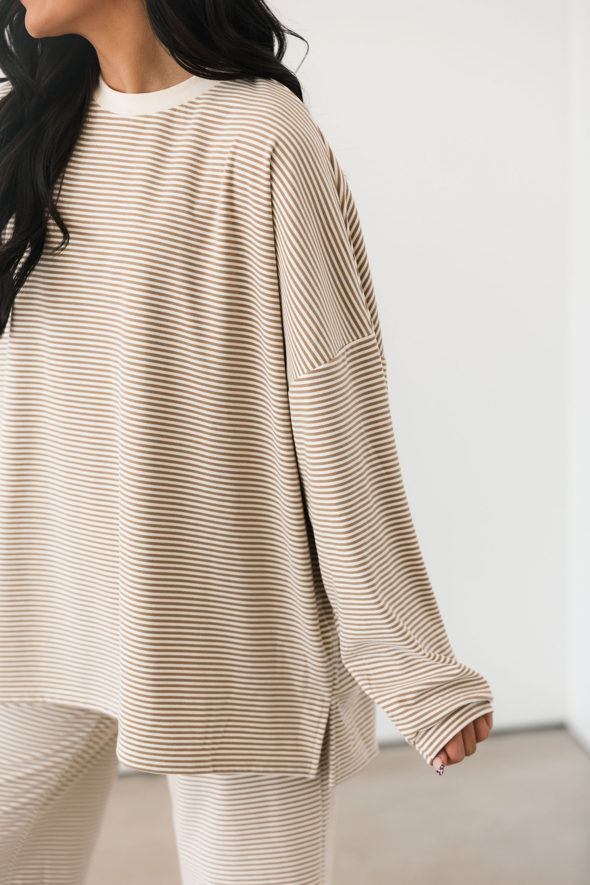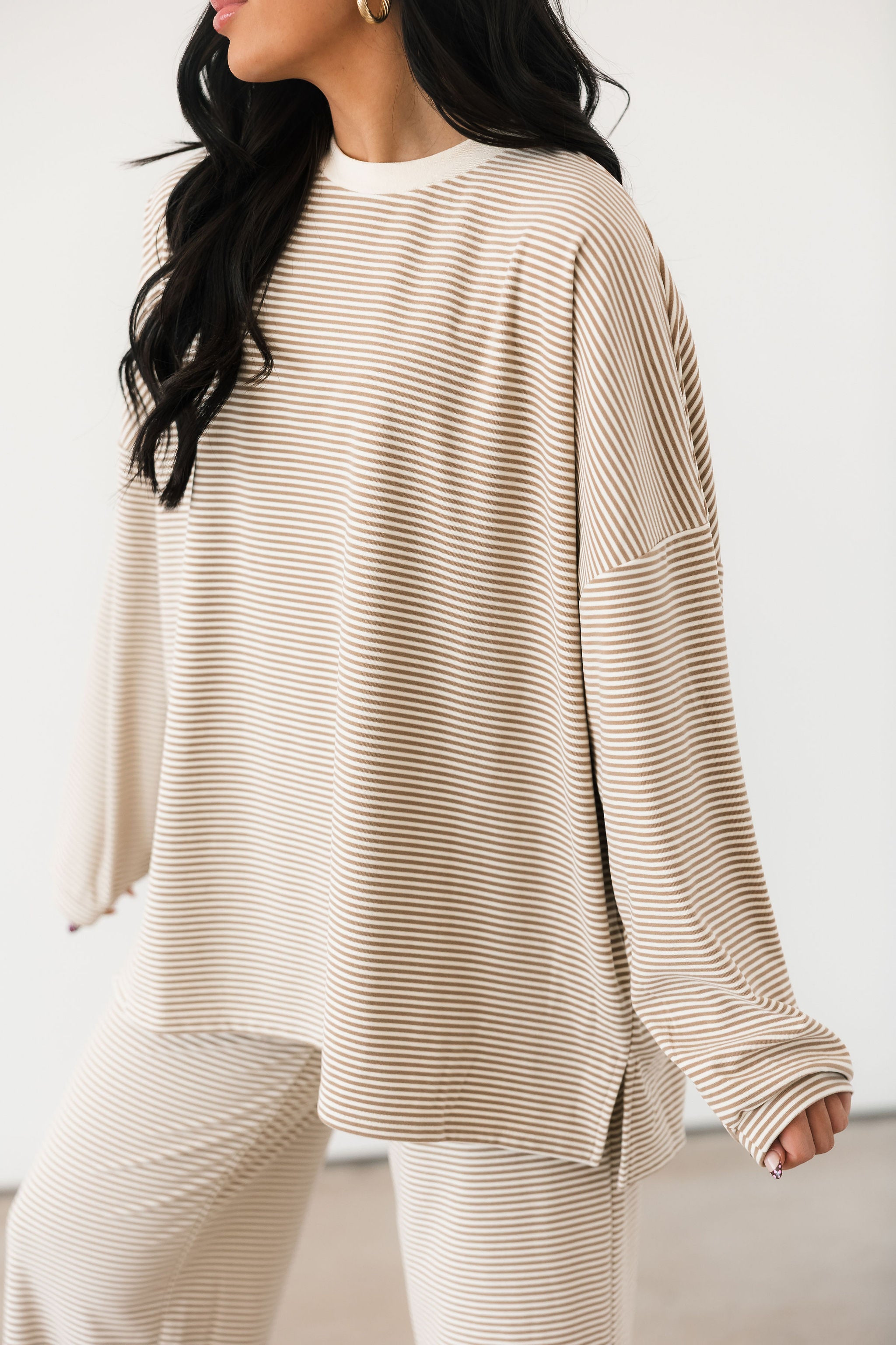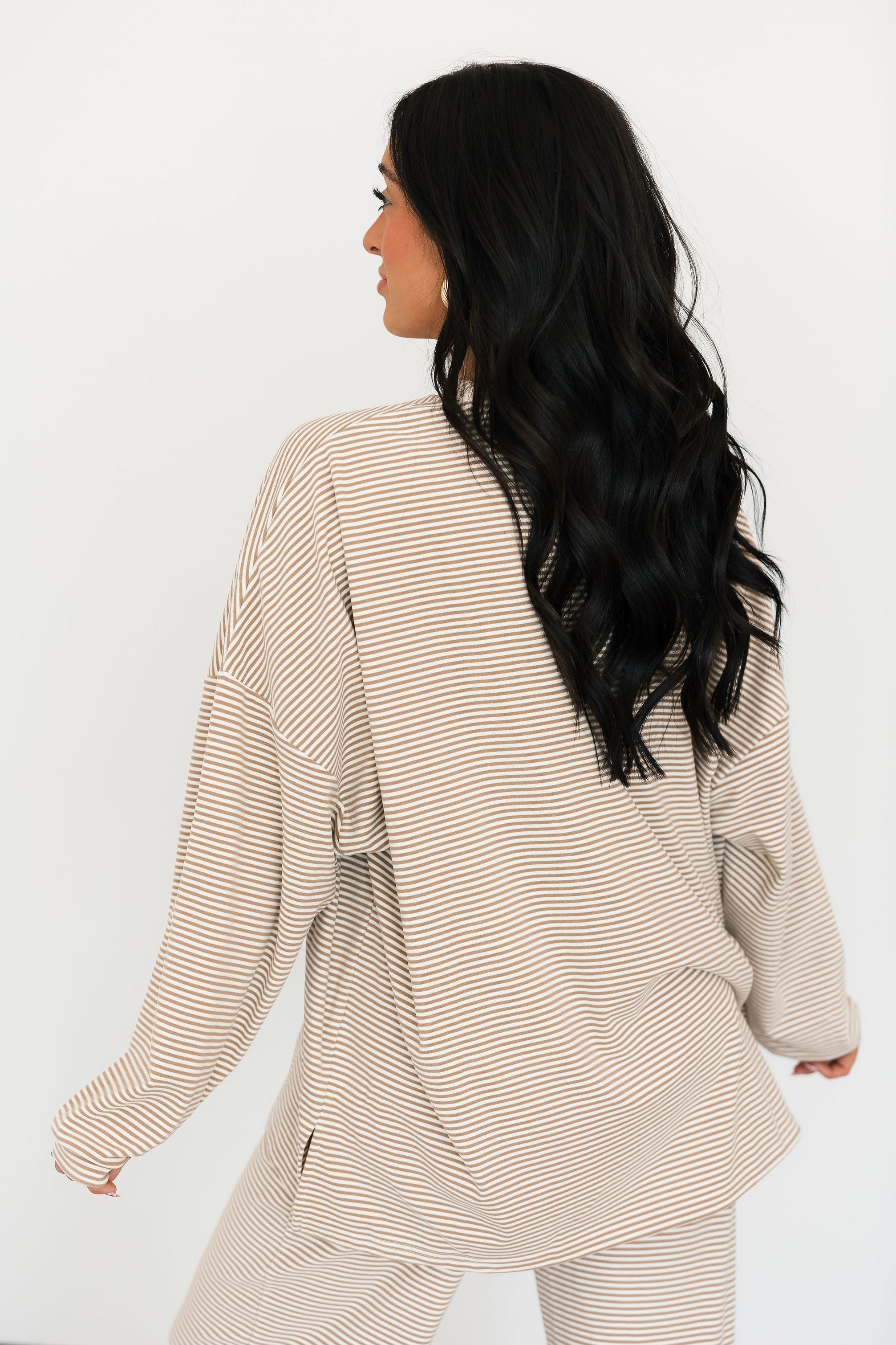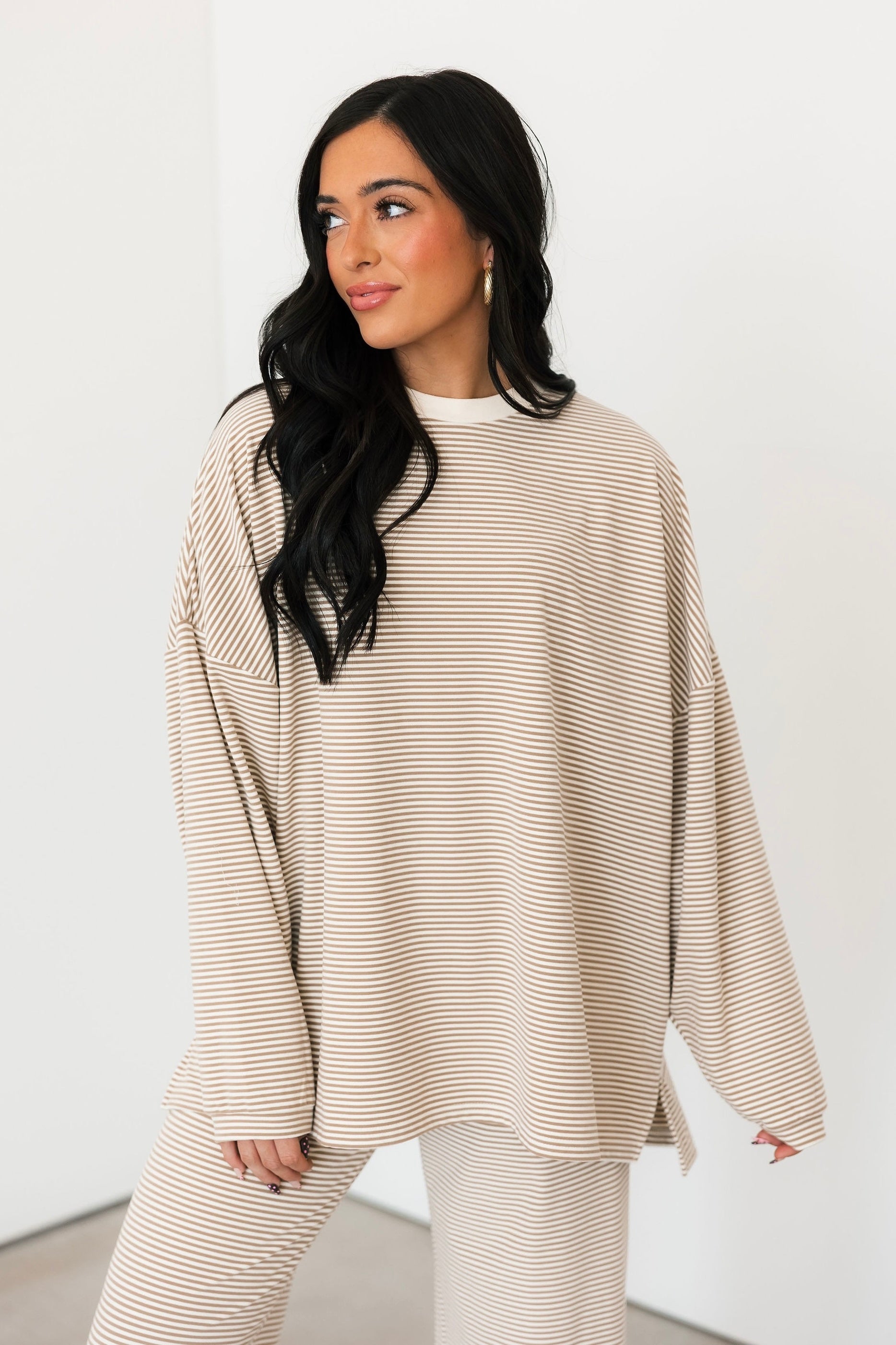 The Dani Stripe Pullover Top in Beige features an oversized, relaxed fit with a classic crewneck and long sleeves. Ultra-soft fabric makes it perfect for pairing with the matching pants or mixing into your everyday wardrobe. Whether you’re curled up with a book, running errands, or meeting friends for coffee, this pullover brings casual, cozy sophistication to every moment. Sage is wearing a s/m.