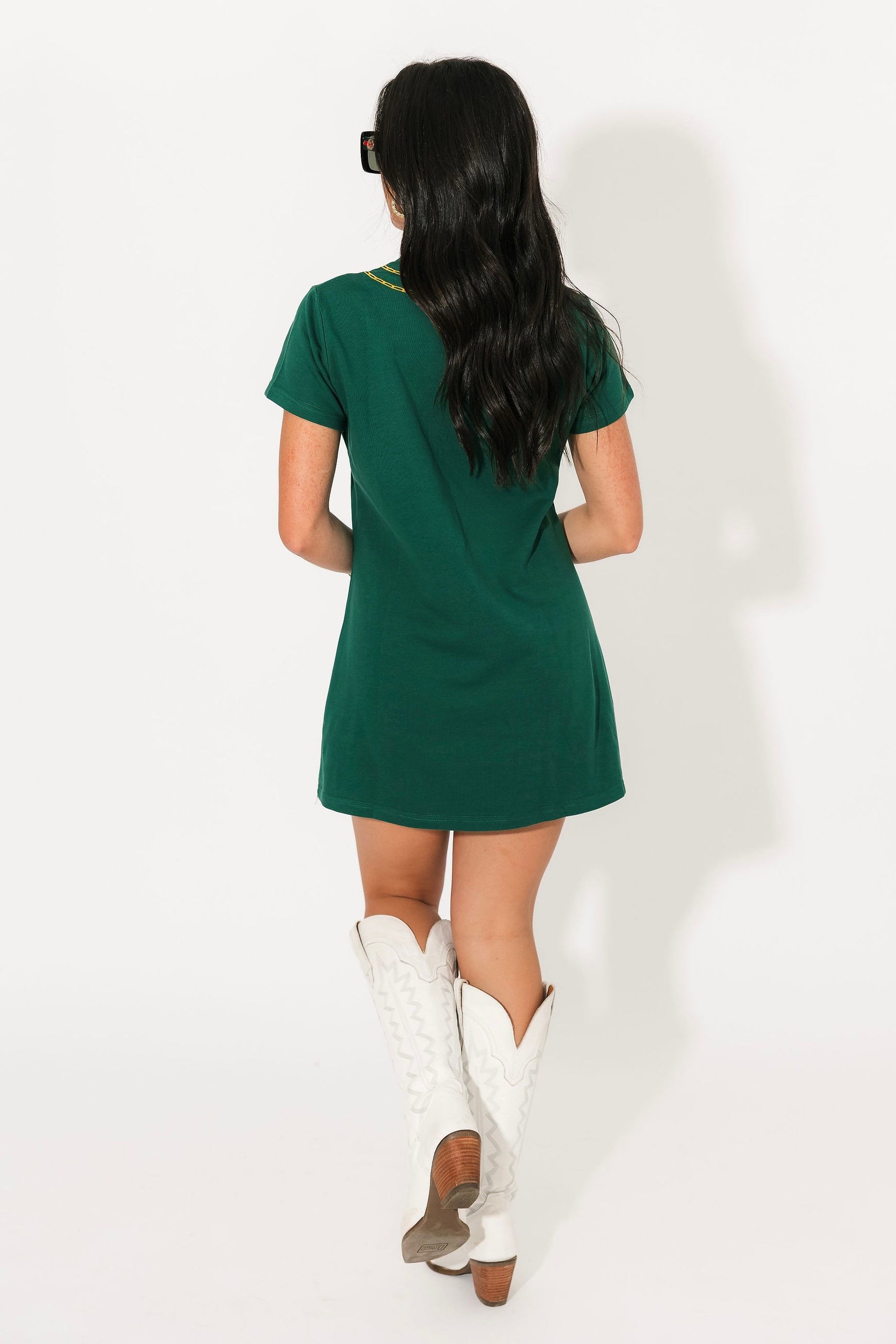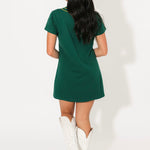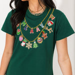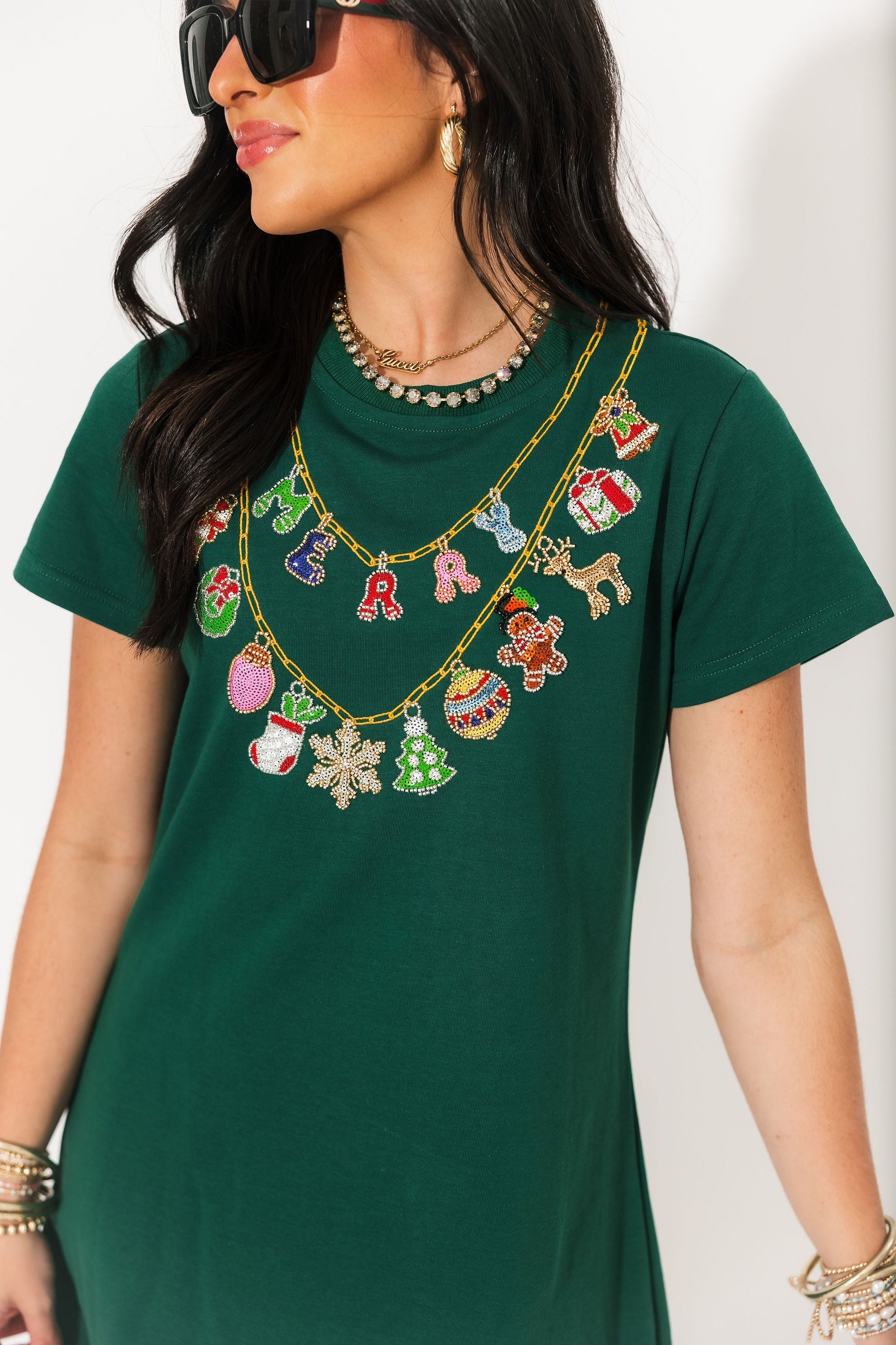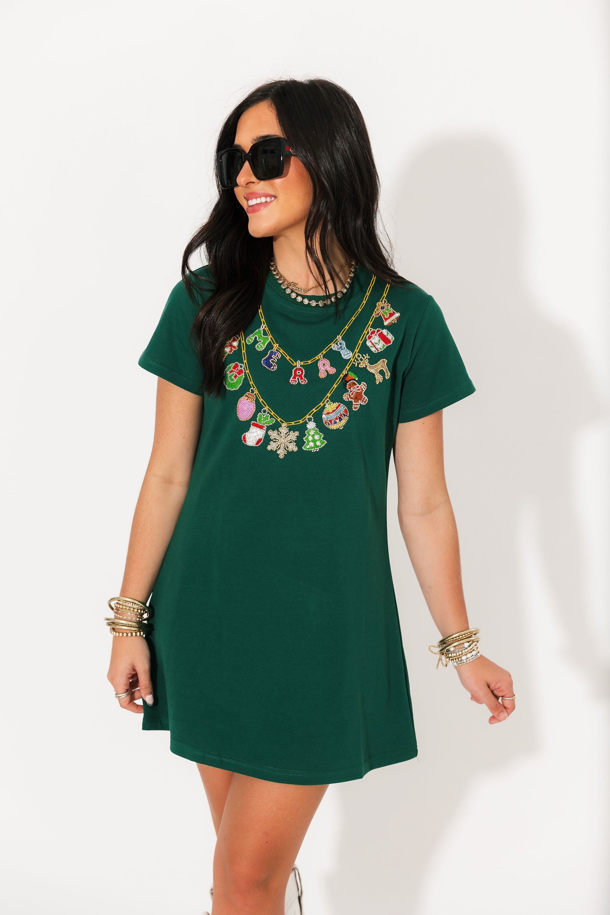 The Queen Of Sparkles Bright Green Christmas Necklace Tee Dress is a playful twist on a classic t-shirt dress. Featuring a relaxed fit, crew neckline, and short sleeves, this mini-length style is brought to life with a shimmering necklace-inspired graphic that adds a festive, standout touch. The easy silhouette makes it perfect for everything from casual holiday parties to cozy nights in. Style it with sneakers for a laid-back look or dress it up with tights and boots for a more polished holiday ensemble. Sage is wearing an XS.