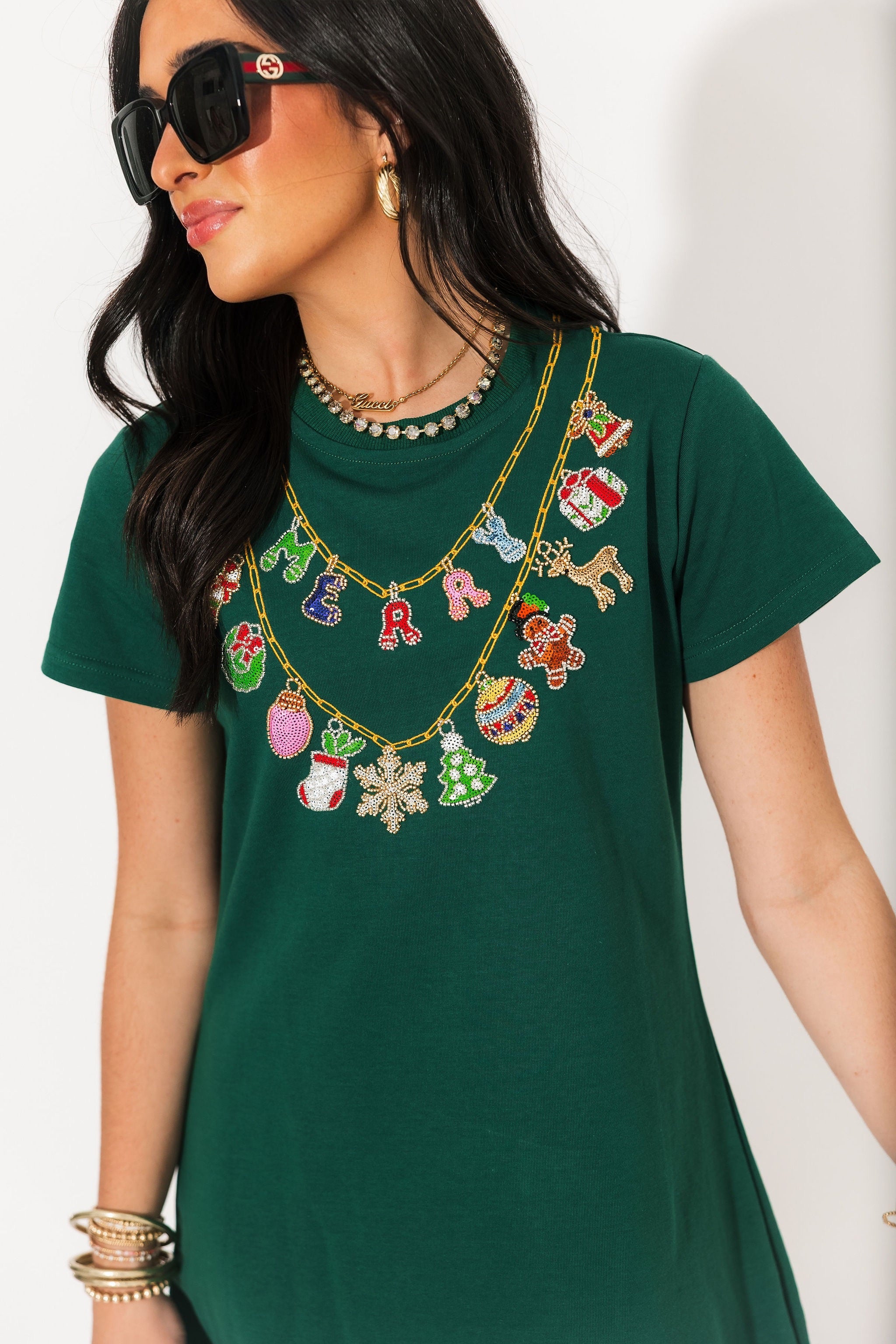 Bright Green Christmas Necklace Tee Dress | Queen Of Sparkles