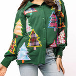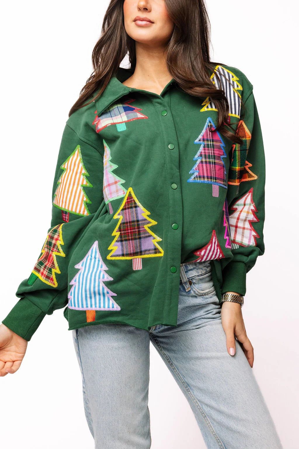 The Queen Of Sparkles Dark Green Multi Plaid & Stripe Christmas Tree Button Up Shacket is a holiday-ready essential with a relaxed fit. Designed with a collared neckline, V-neck, long sleeves, and functional button-up front, it’s finished with playful patterned Christmas tree graphics. Perfect for layering or wearing on its own, this shacket brings festive cheer to any outfit.