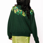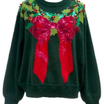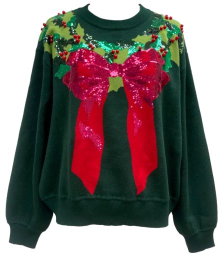 The Queen Of Sparkles Dark Green & Red Wreath Around Neck Sweater features a relaxed crewneck fit with long sleeves for cozy comfort. Designed with a bold wreath graphic and finished with a big red bow, this piece brings timeless holiday spirit to your seasonal wardrobe.