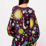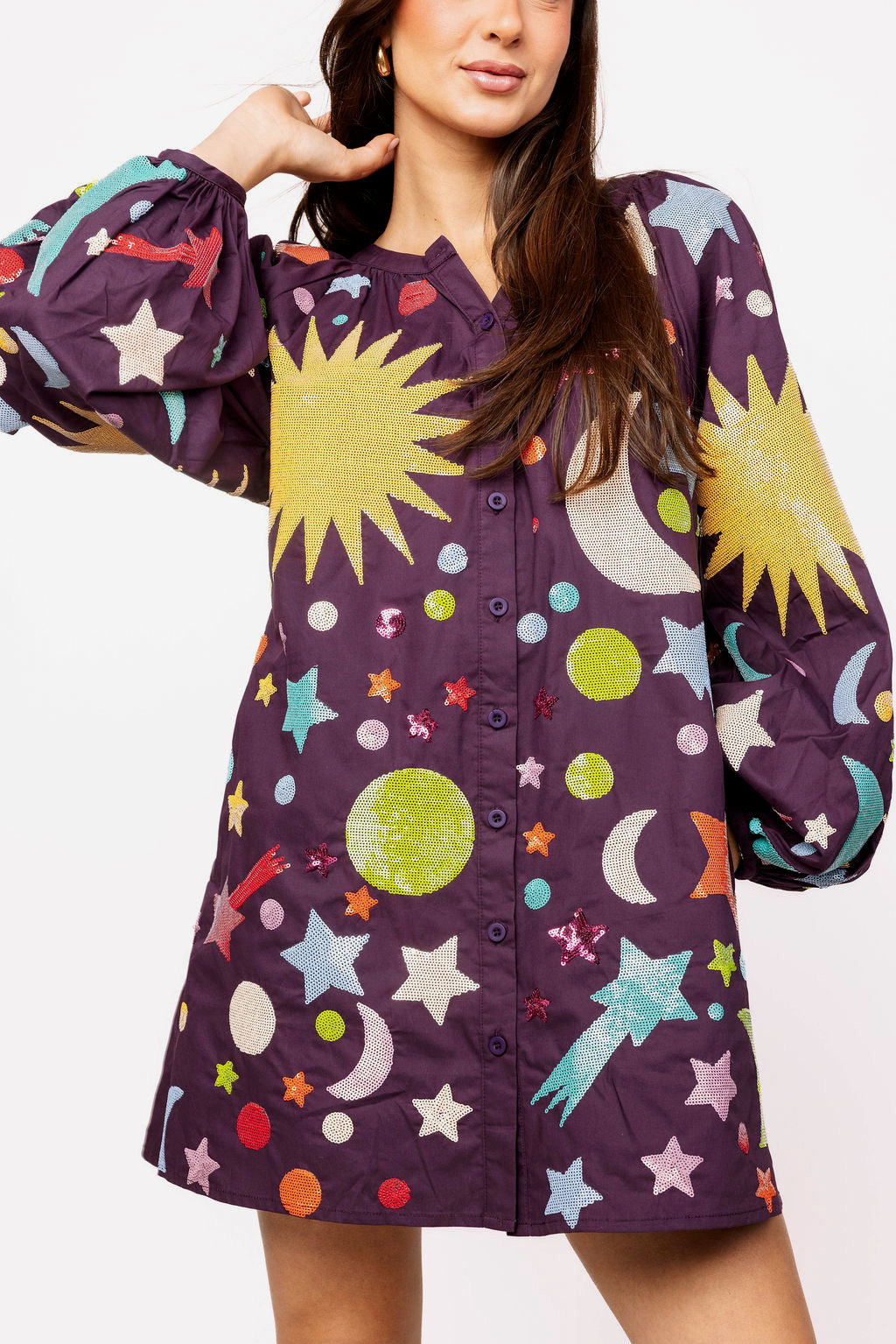Dark Purple Multi Galaxy Button Up Cotton Bubble Sleeve Dress | Queen Of Sparkles