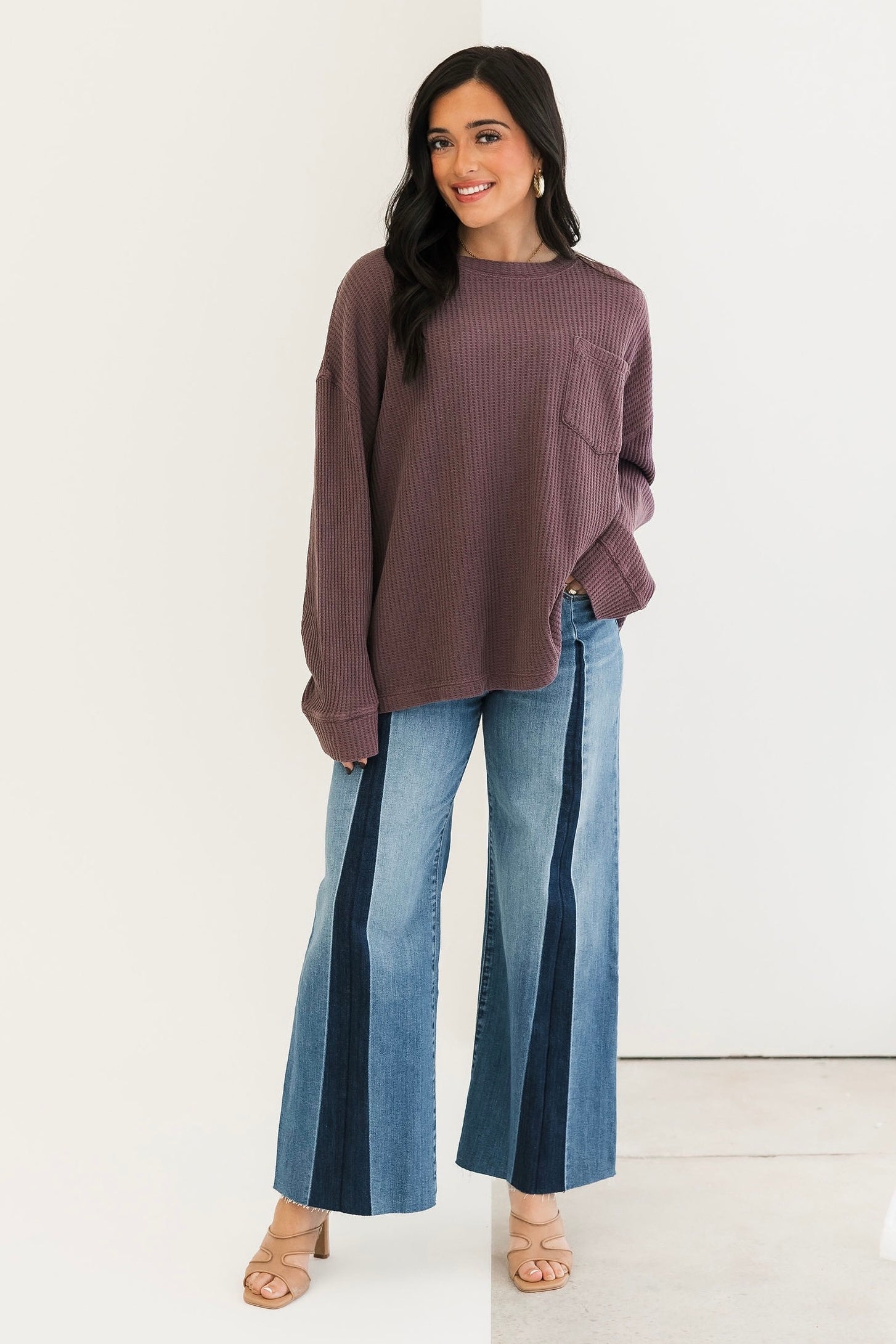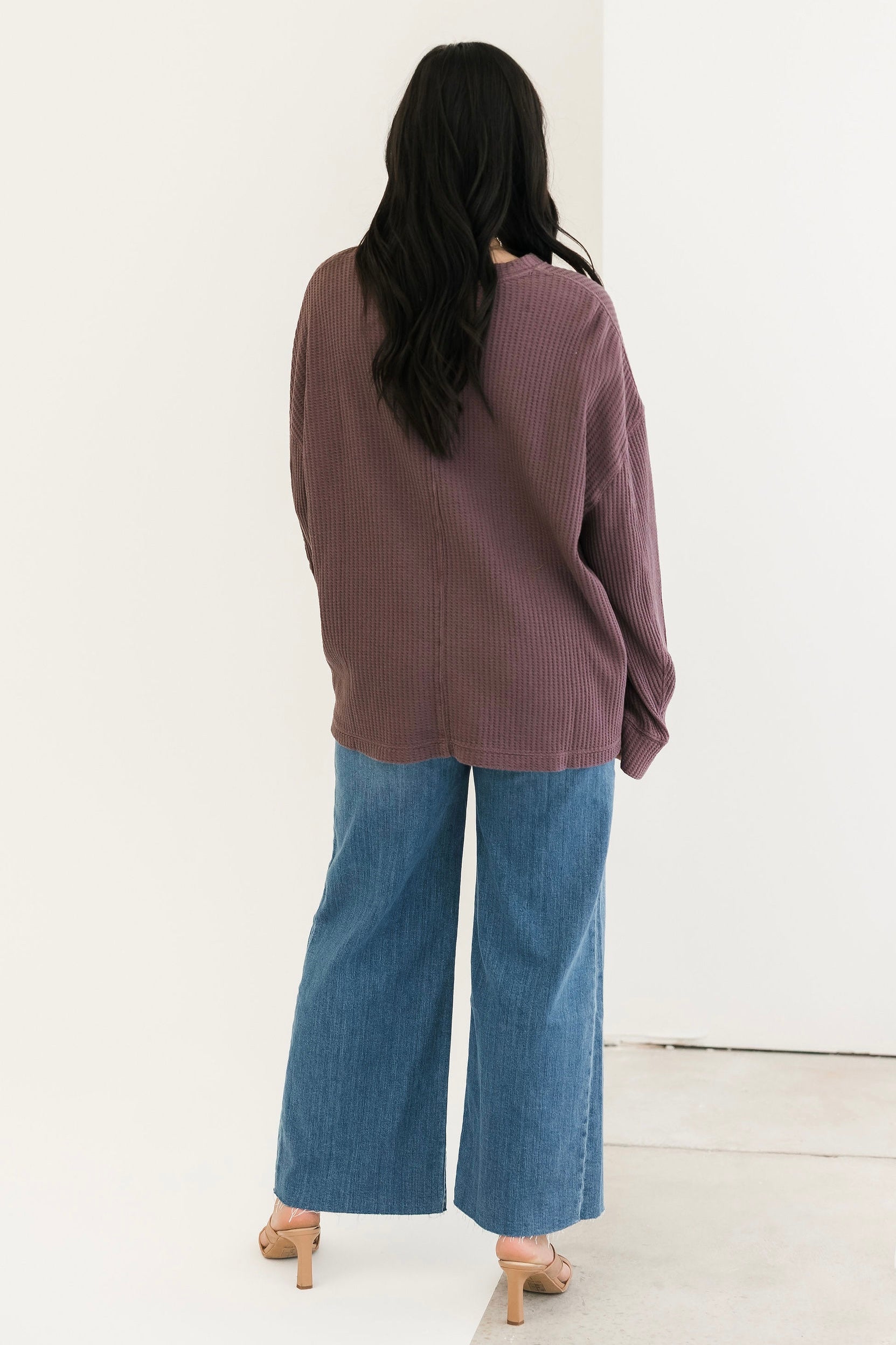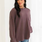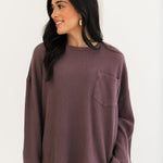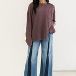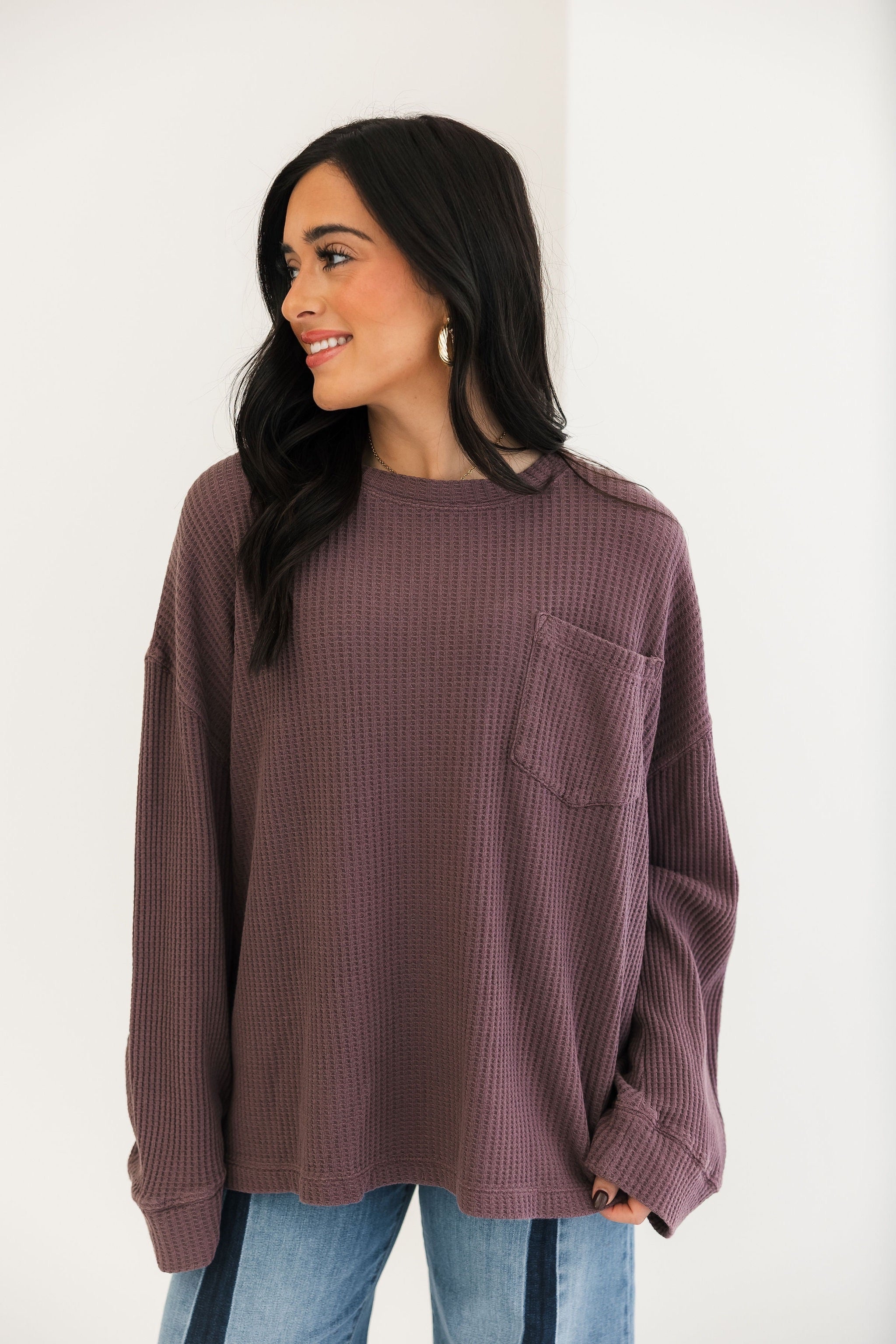 This oversized thermal features a classic crew neckline, long sleeves, and a front pocket for that effortless, lived-in feel. With its soft waffle texture and rich Chocolate Grape hue, it’s the ideal piece for layering, lounging, and staying comfy all season long. Sage is wearing an xs.