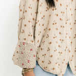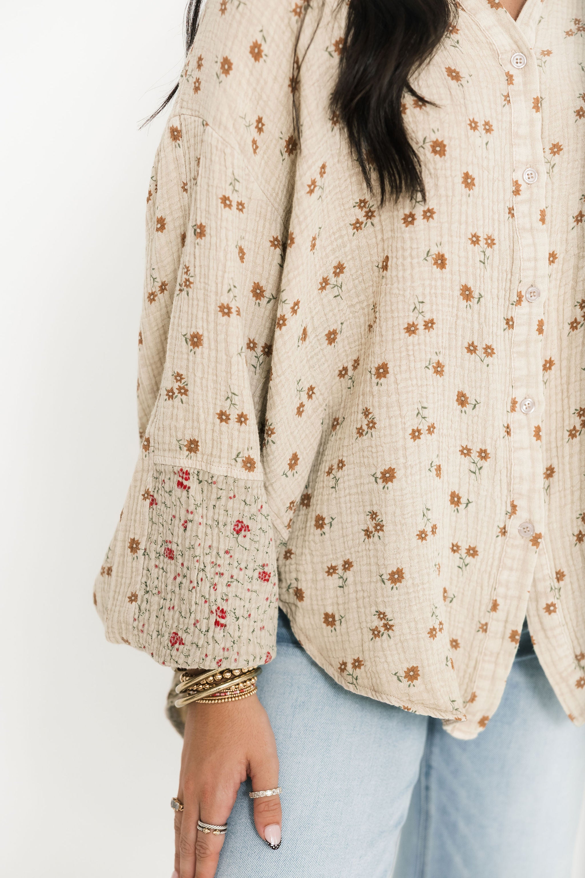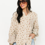 Soft and slouchy in all the right ways, this oversized button-up features a dainty daisy print that adds a touch of whimsy to a classic silhouette. Designed with drop shoulders and a front pocket, it’s the perfect mix of laid-back and lovely. Sage is wearing a small.