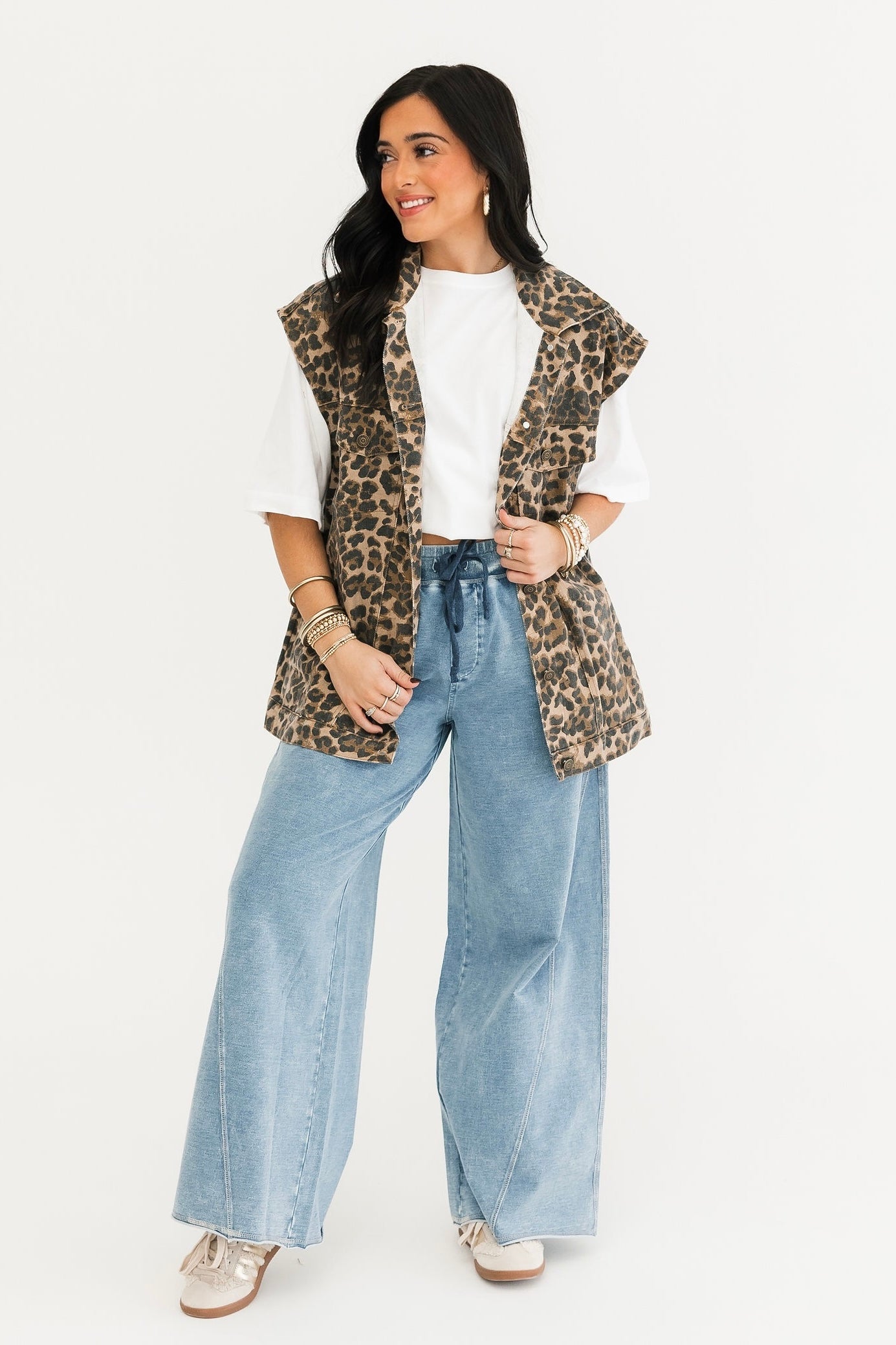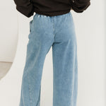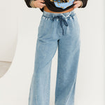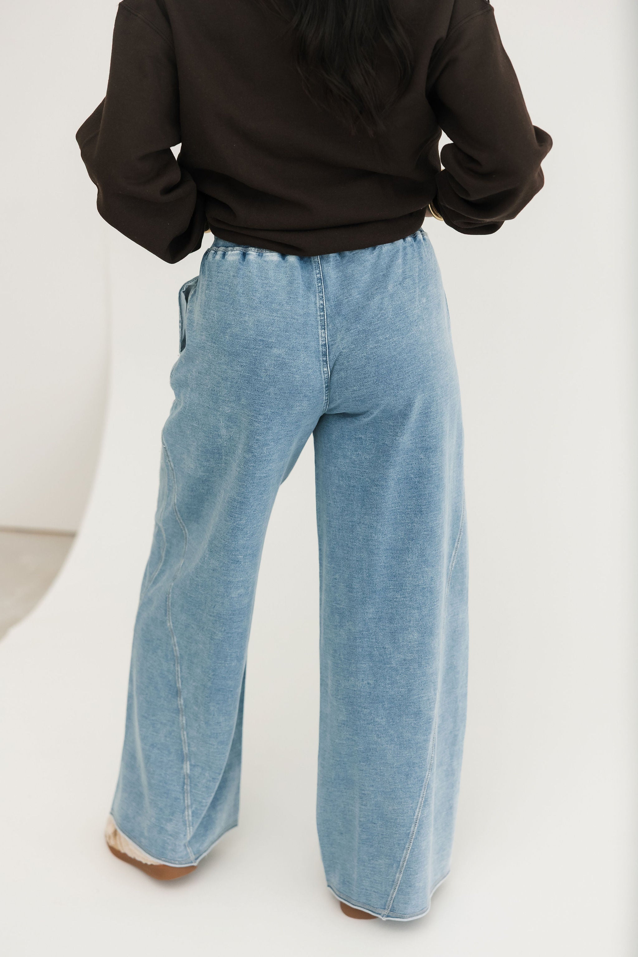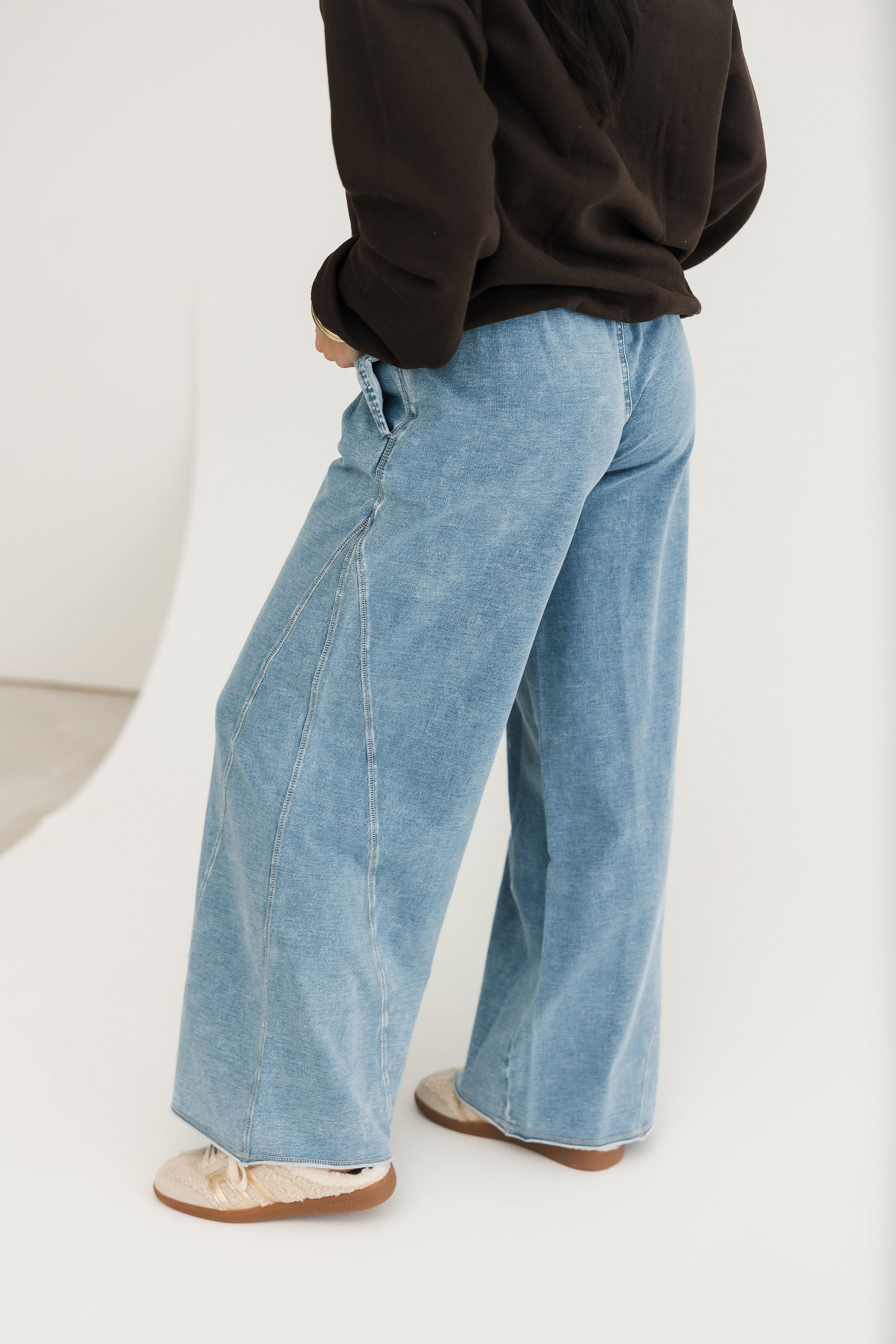 These relaxed-fit pull-on pants feature a wide-leg silhouette, an easy elastic waistband, and a raw-edge hem for a laid-back, lived-in feel. Crafted in light denim, they’re the perfect throw-on piece for casual days, travel, and everything in between. Sage is wearing a small.