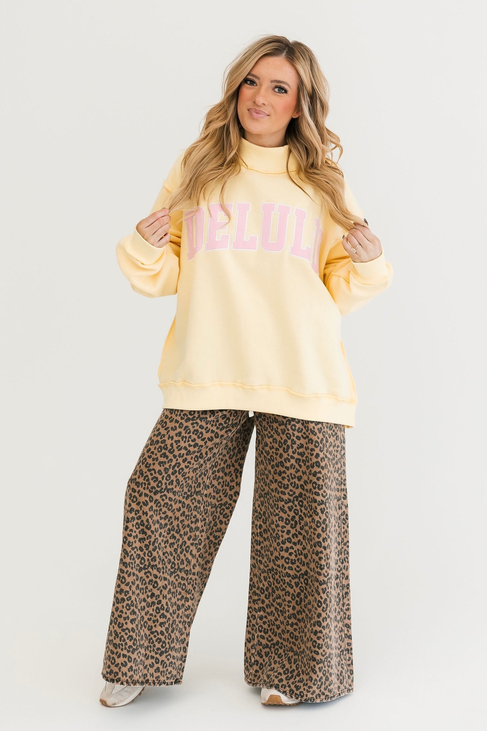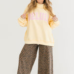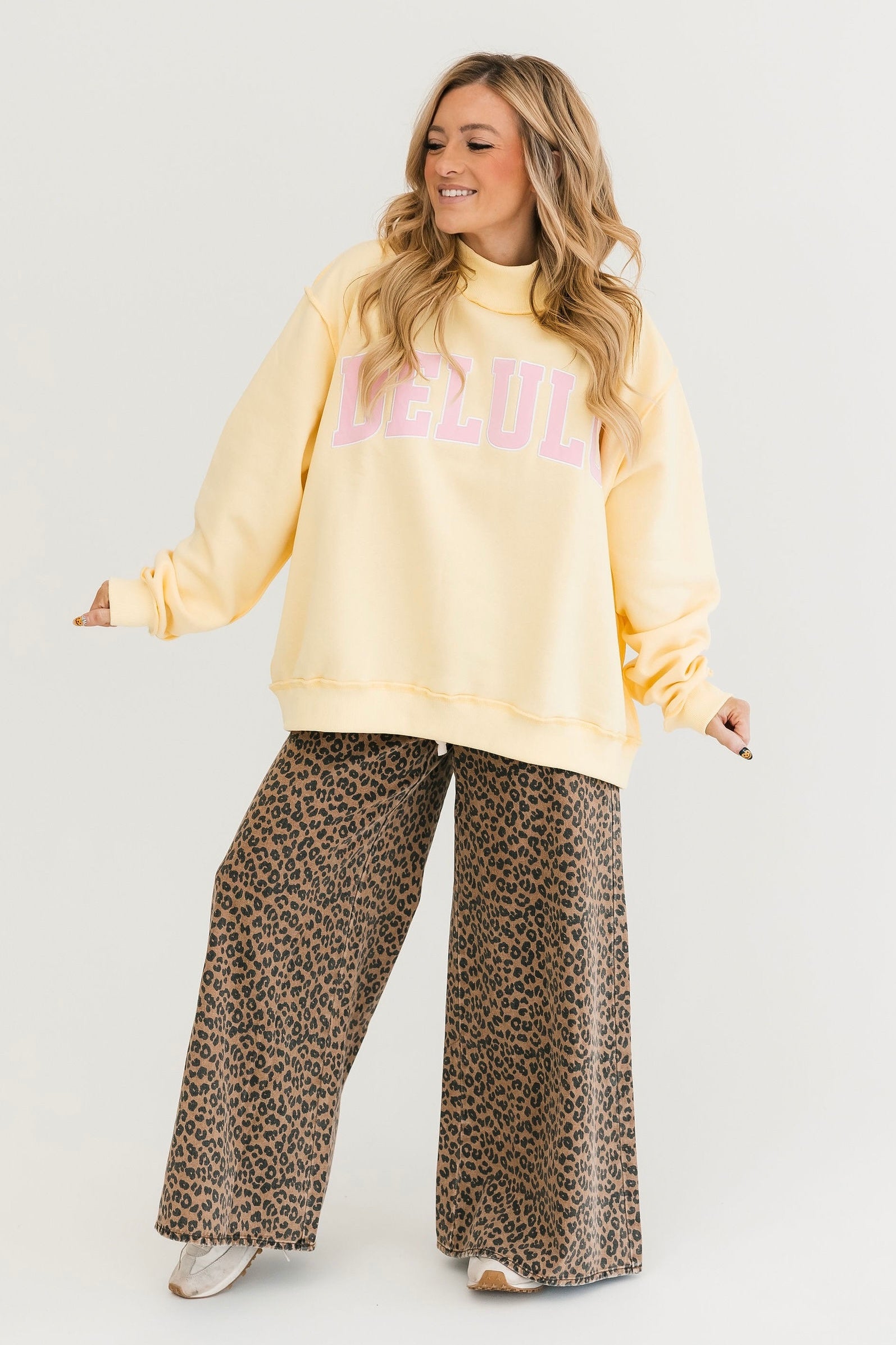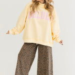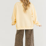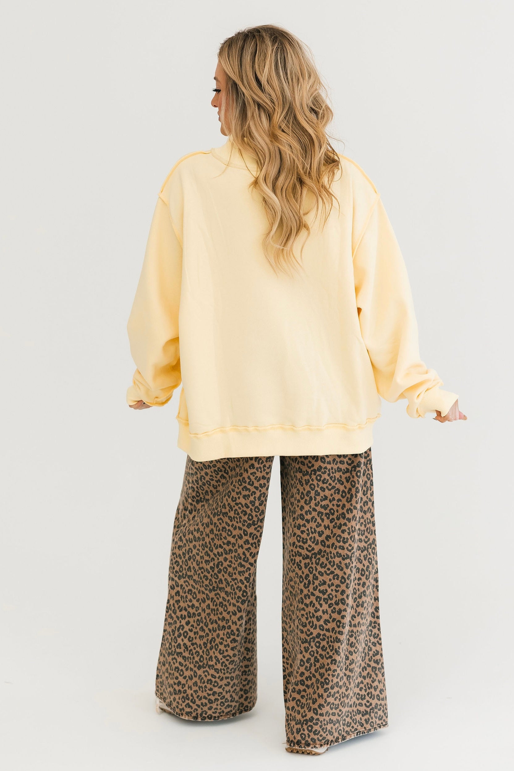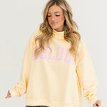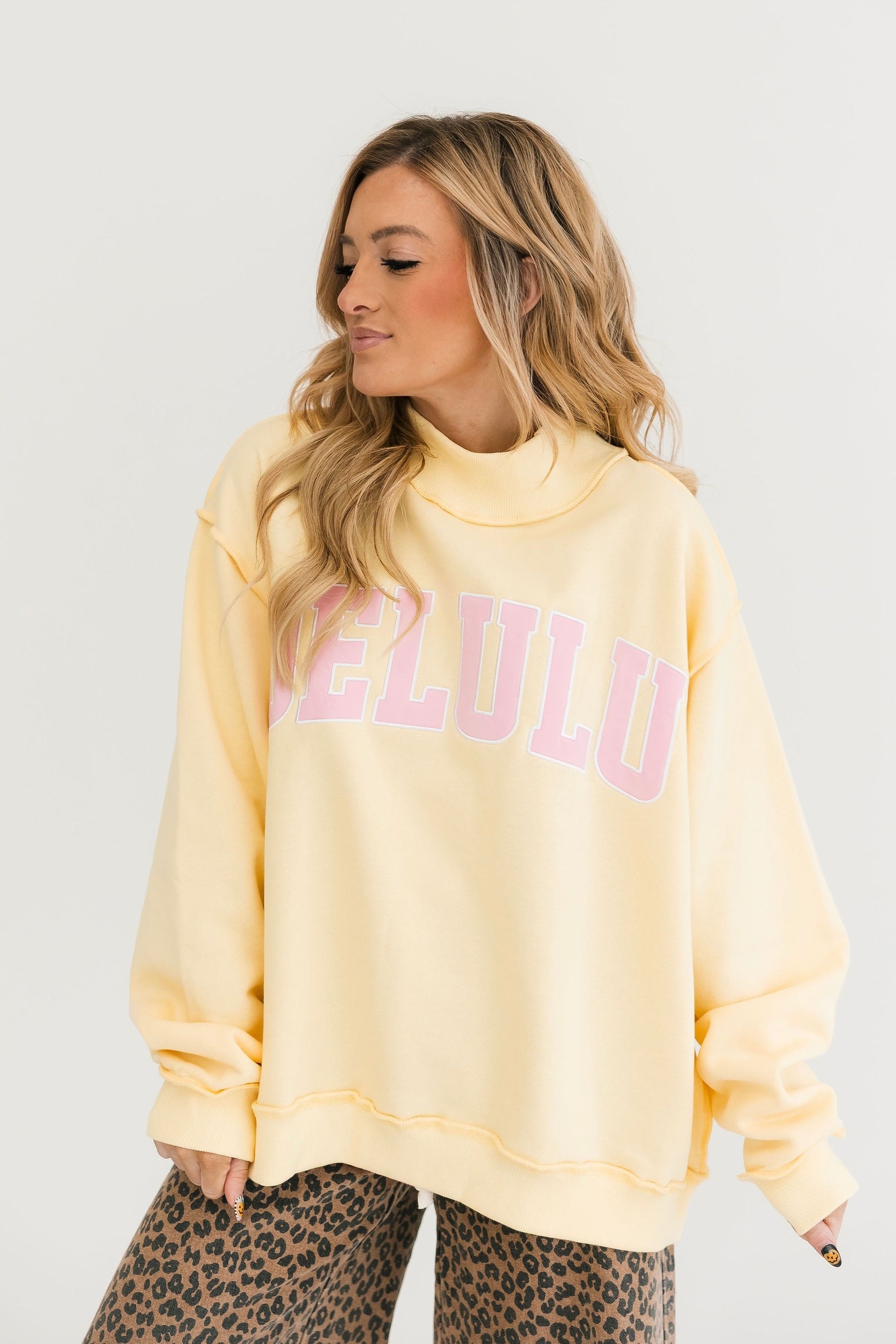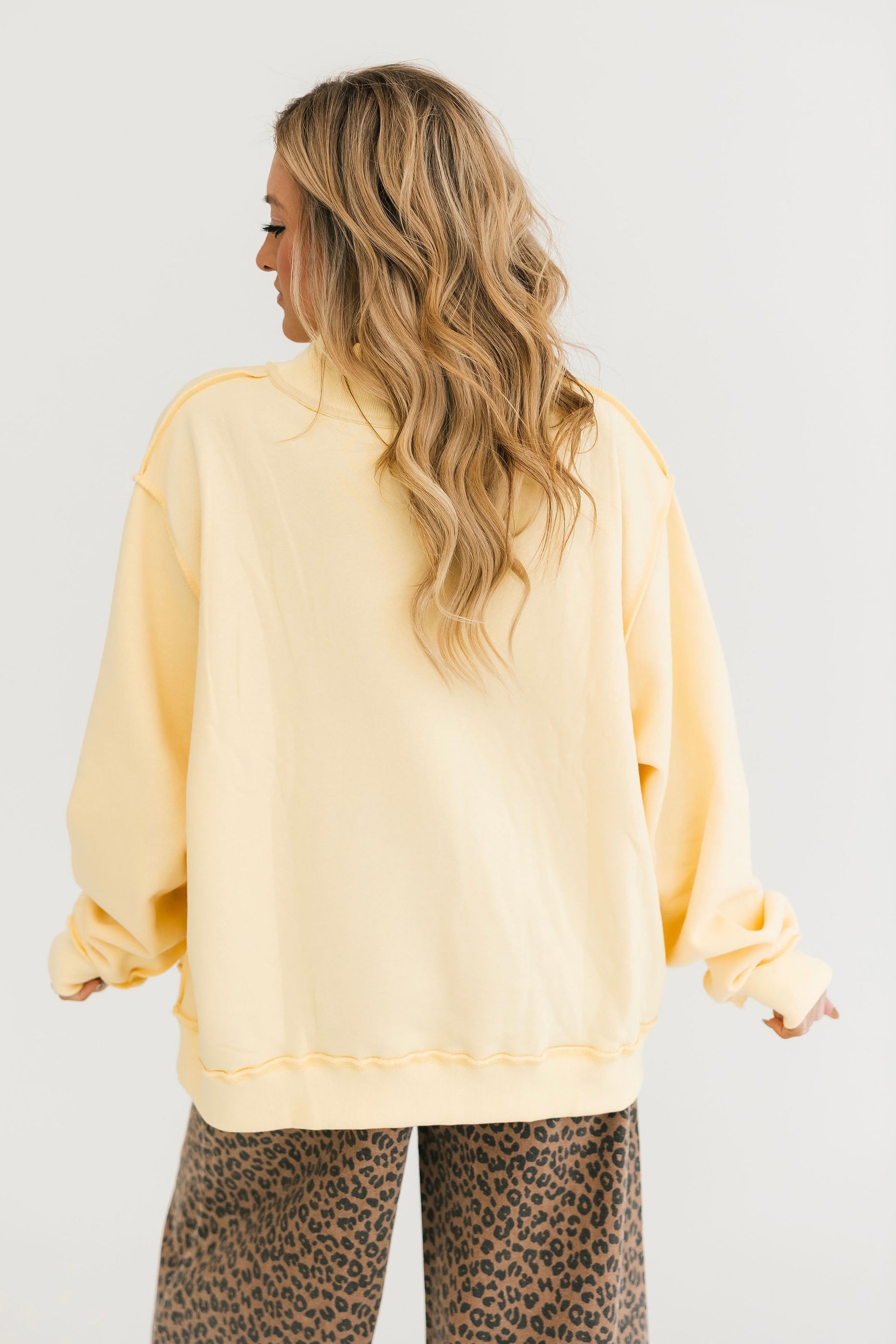 Meet your new go-to casual sweatshirt. Made in a soft butter-yellow hue, this mock-neck pullover offers an oversized silhouette with classic long sleeves and detailed embroidery across the chest. It’s cozy, lightweight, and perfect for lounging, layering, or adding a cheeky touch to your weekend wardrobe. Lexi is wearing a S/M.