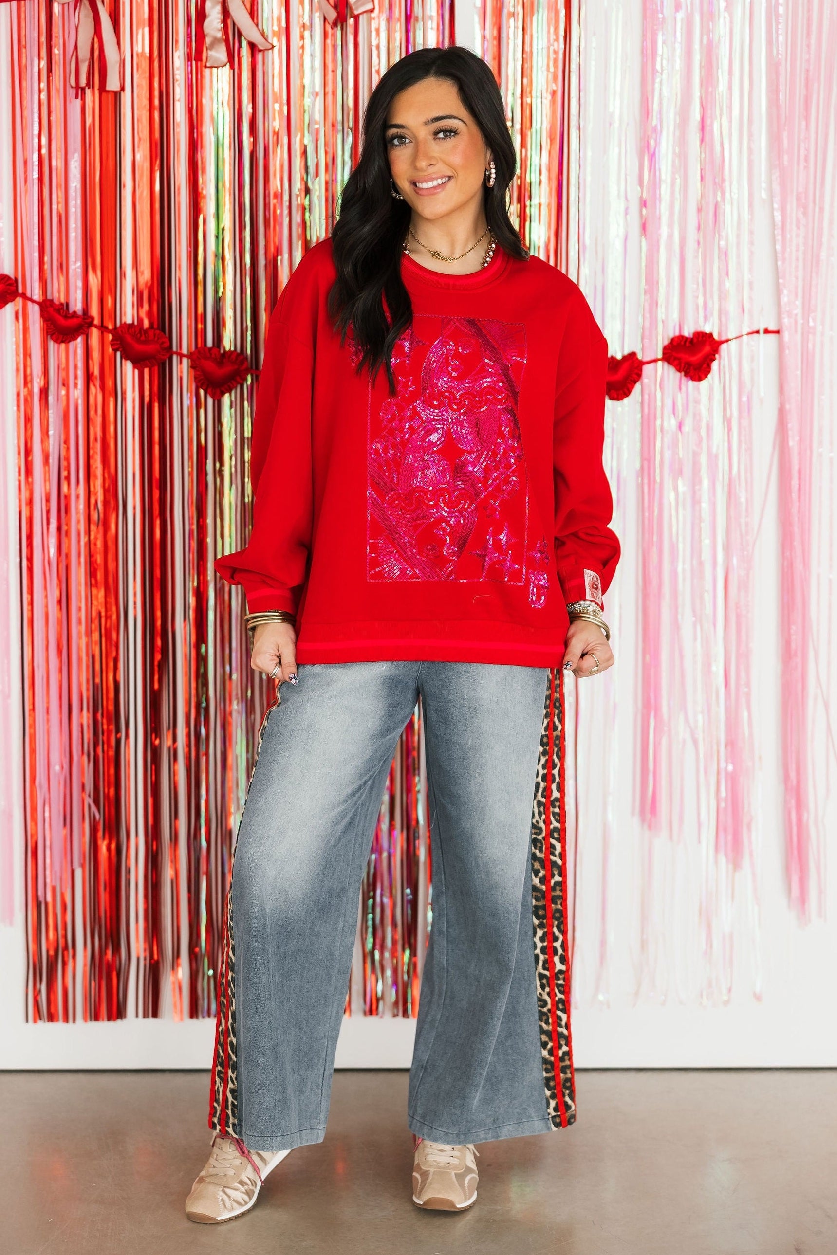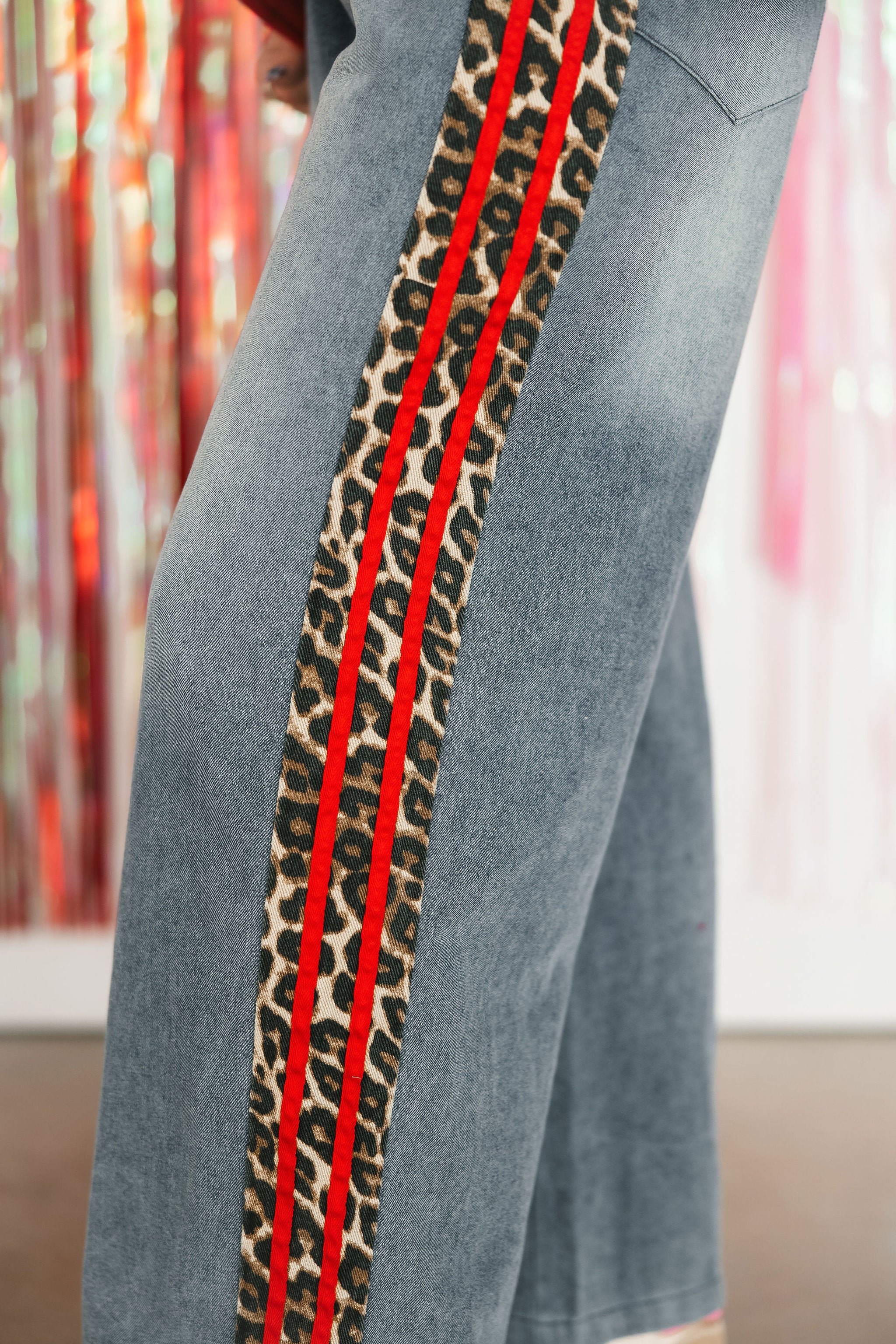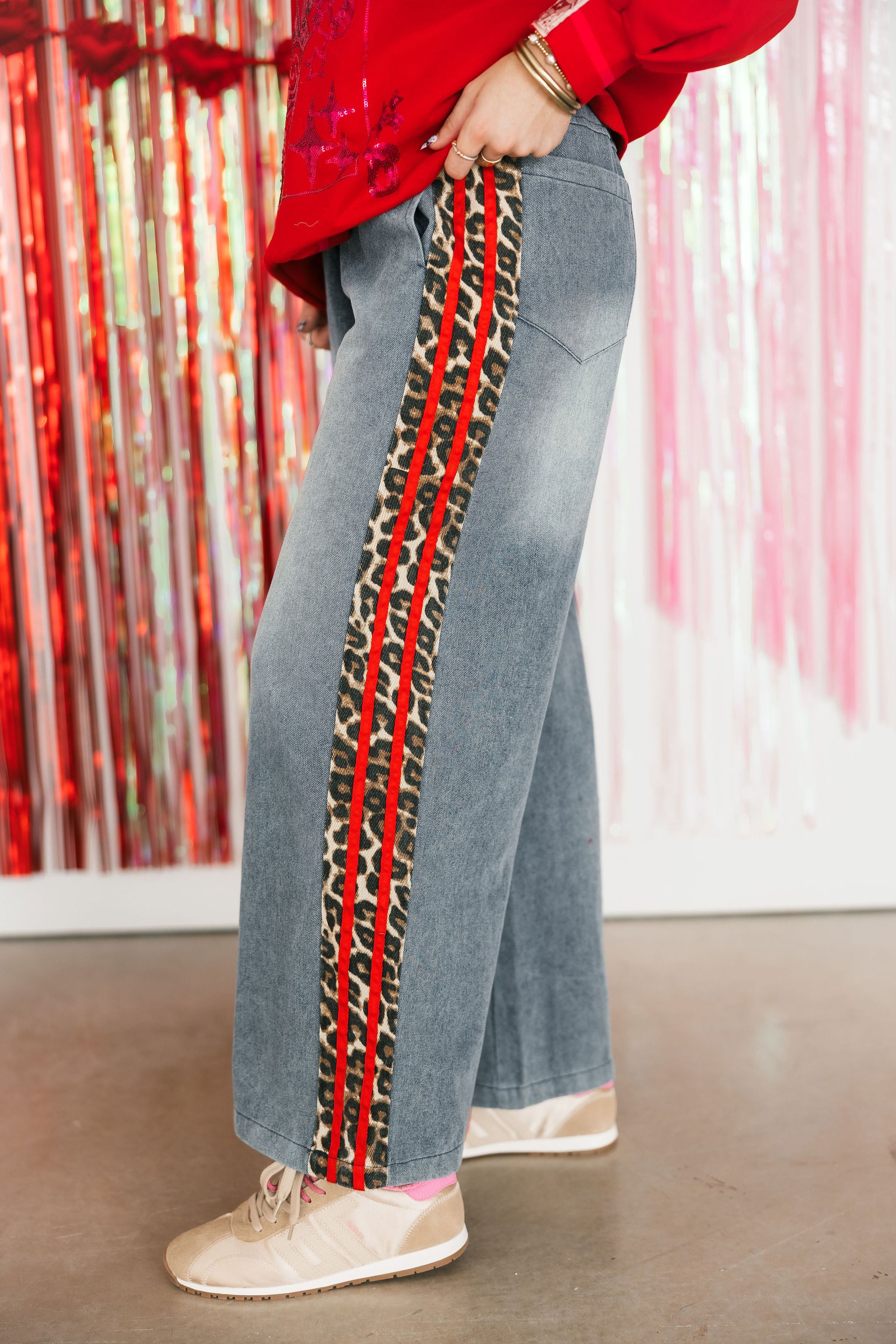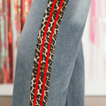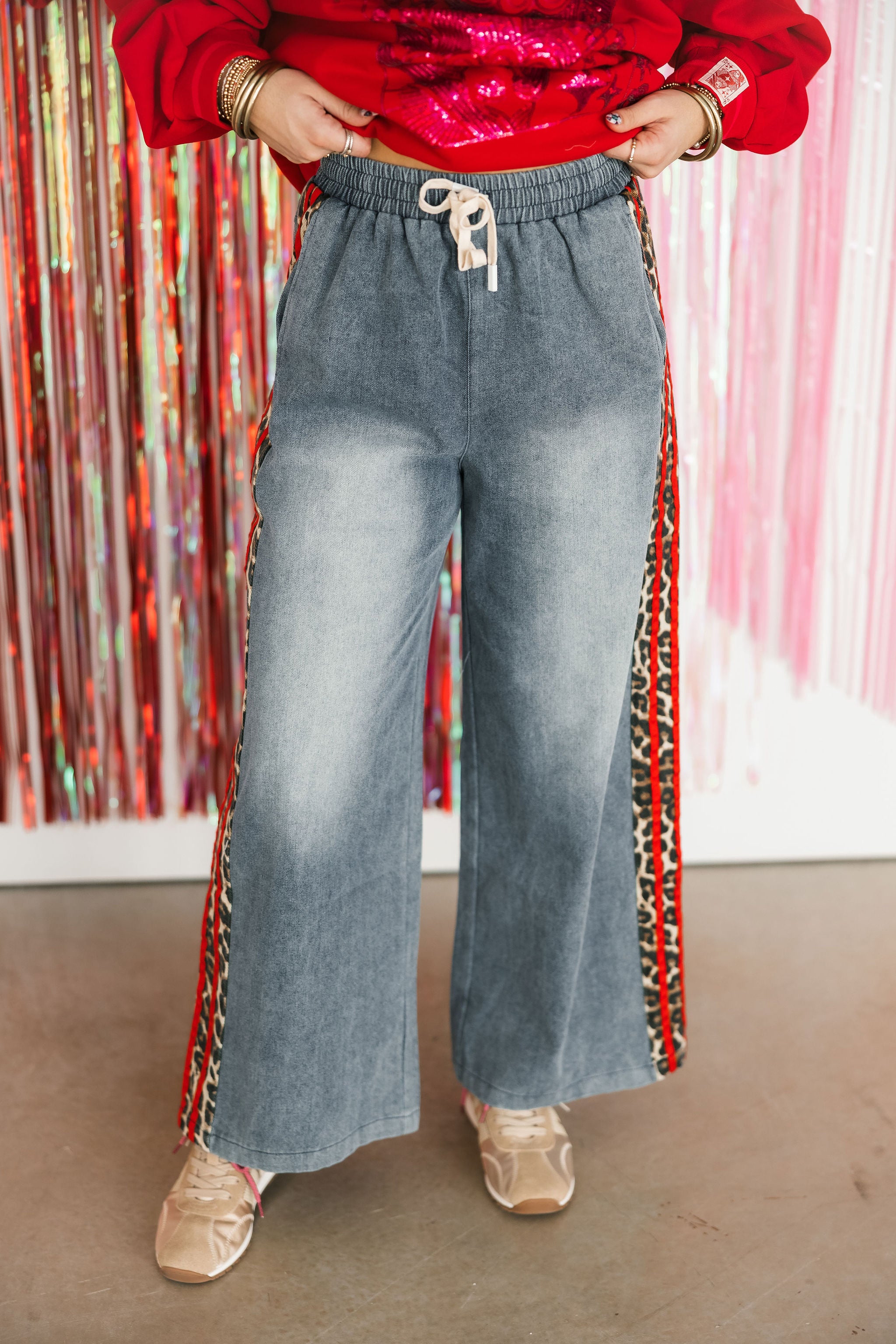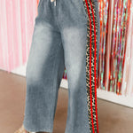 The On The Wild Side Denim Pants in Red feature a wide-leg, relaxed fit with an elastic waistband and drawstring for all-day comfort. Highlighted with a striking red leopard stripe detail, they’re a statement-making piece that pairs perfectly with simple tees or cozy sweaters for a standout look. Sage is wearing a small.