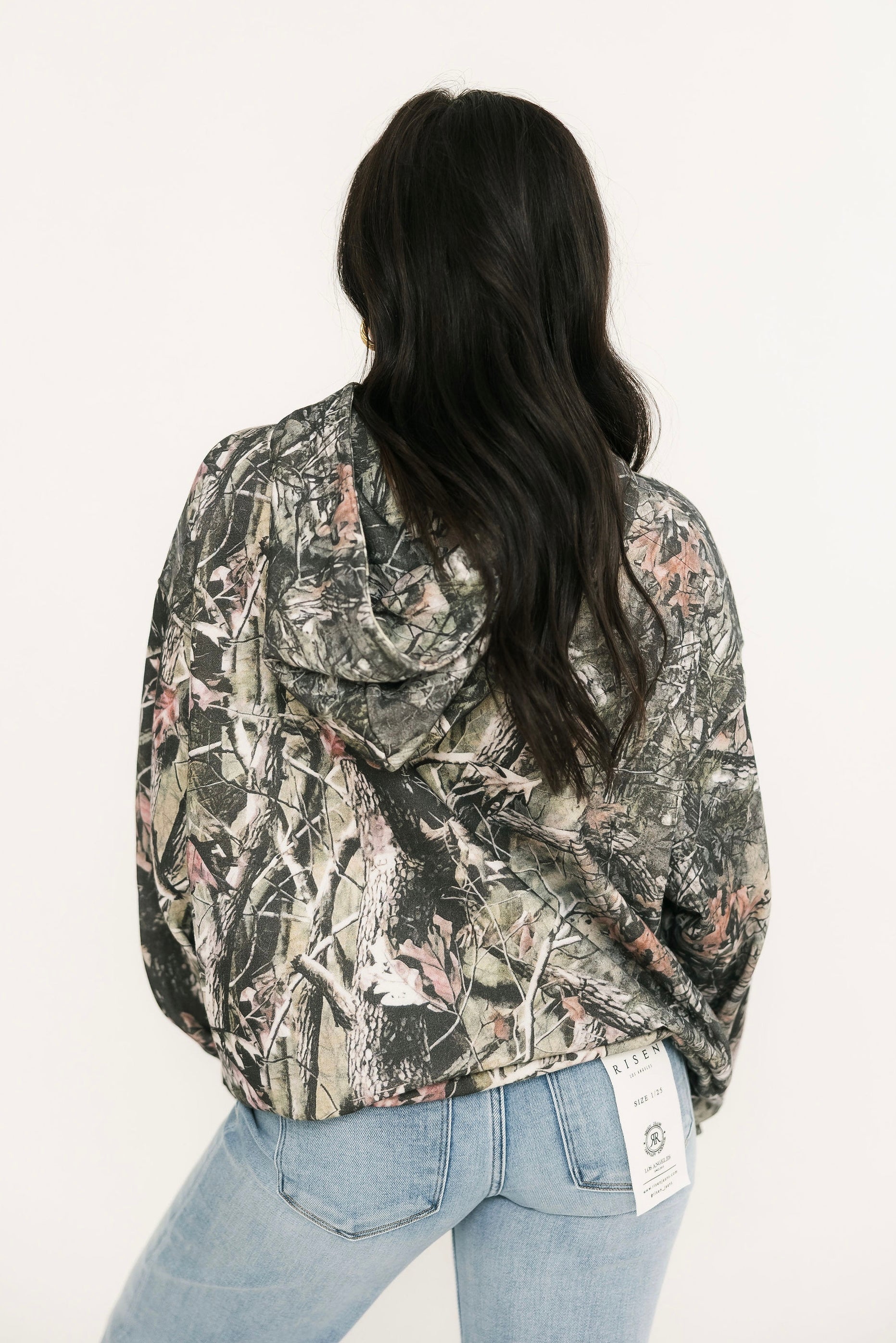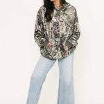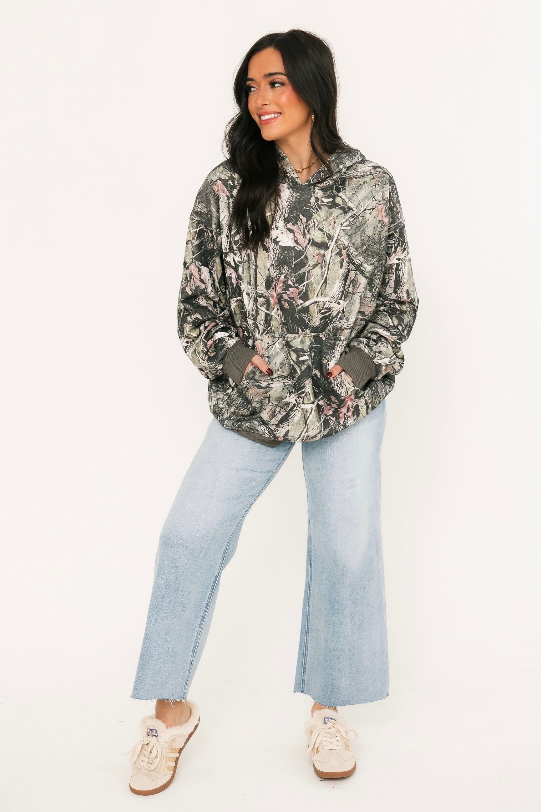The Camo Hoodie in Olive features an oversized, relaxed fit with a classic hood, long sleeves, and a spacious front pocket for that easy, cozy feel. Finished in a bold camo print, it’s the perfect everyday pullover that adds a hint of edge to any casual look. Wear it with joggers, leggings, or denim — it’s made for all-day comfort. Sage is wearing a small.