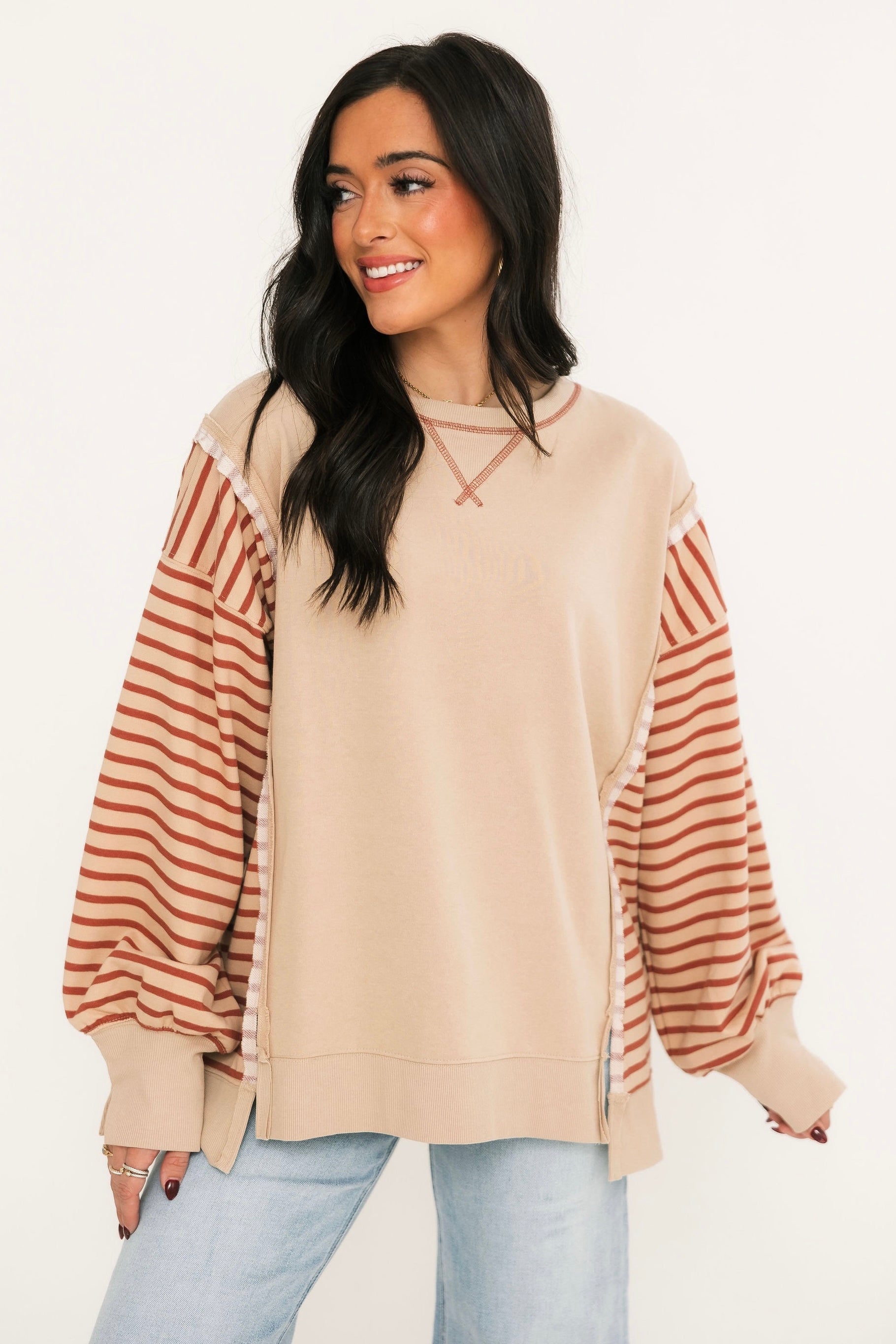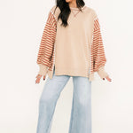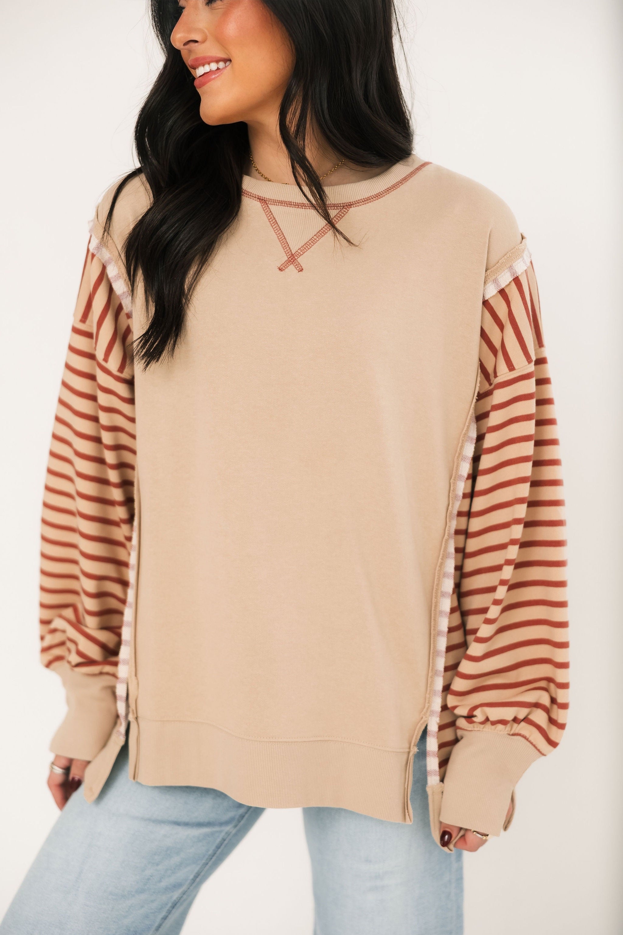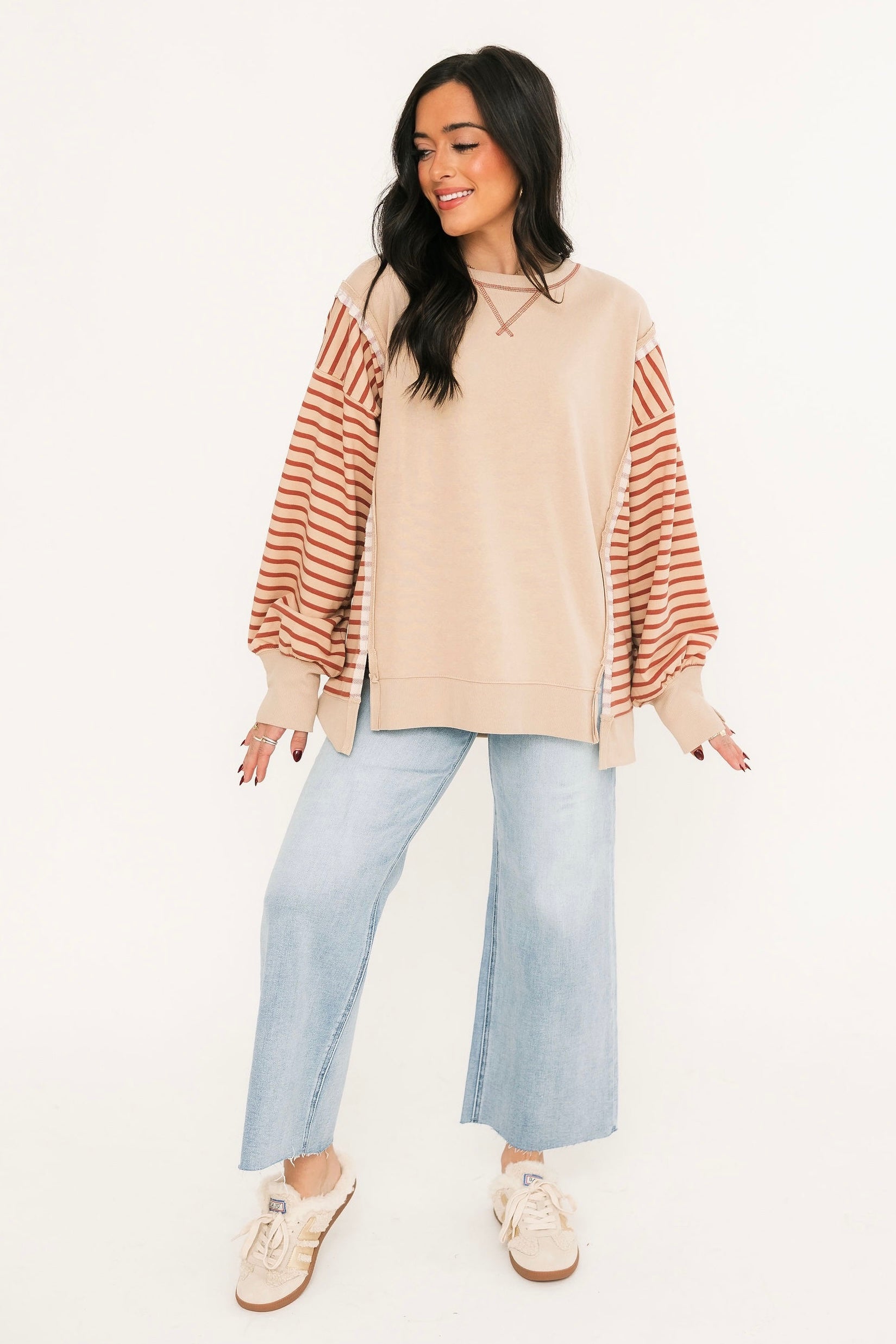 The Good Vibes Crew In Beige is made for easy, laid-back style. Designed with a relaxed oversized fit, this top features a classic round neckline, drop shoulders, front and sleeve slits, and a hi-lo hem for that little extra edge. Pair it with leggings or denim for an off-duty look that still feels put-together. Sage is wearing a small.