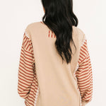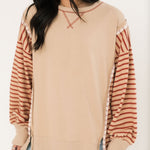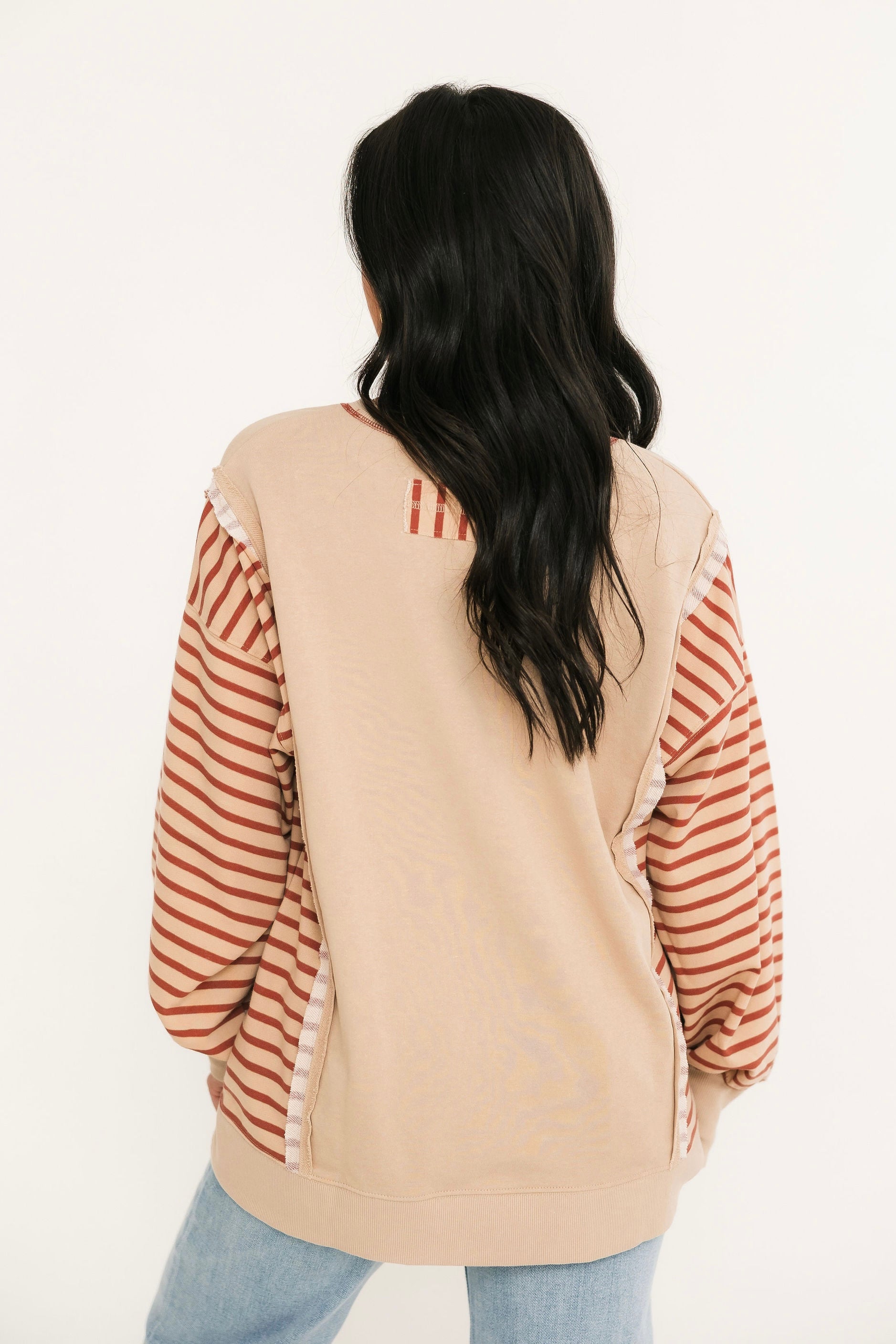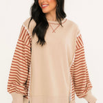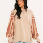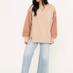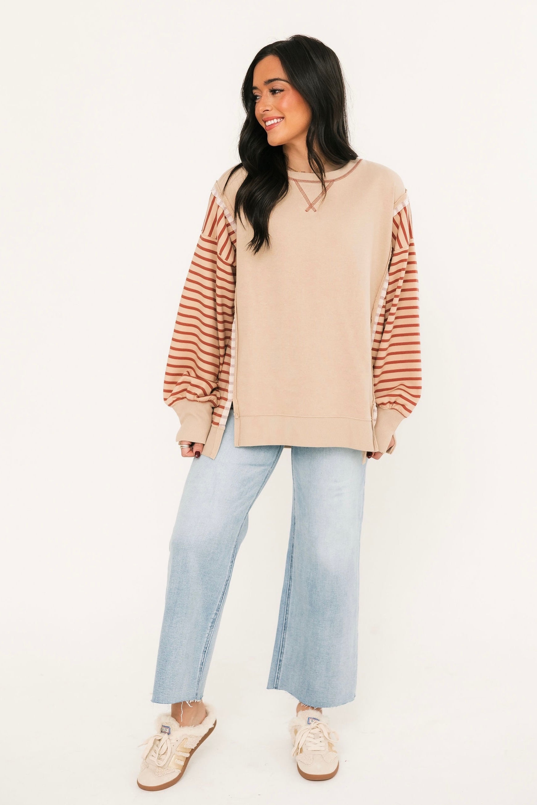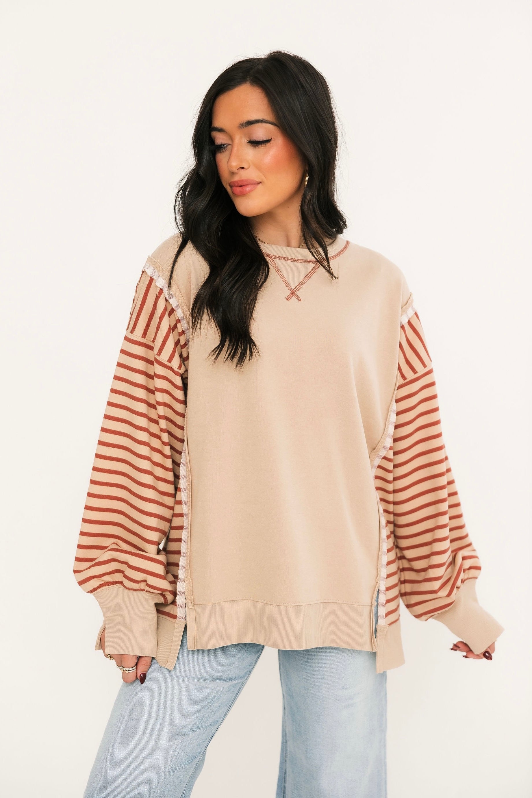 The Good Vibes Crew In Beige is made for easy, laid-back style. Designed with a relaxed oversized fit, this top features a classic round neckline, drop shoulders, front and sleeve slits, and a hi-lo hem for that little extra edge. Pair it with leggings or denim for an off-duty look that still feels put-together. Sage is wearing a small.