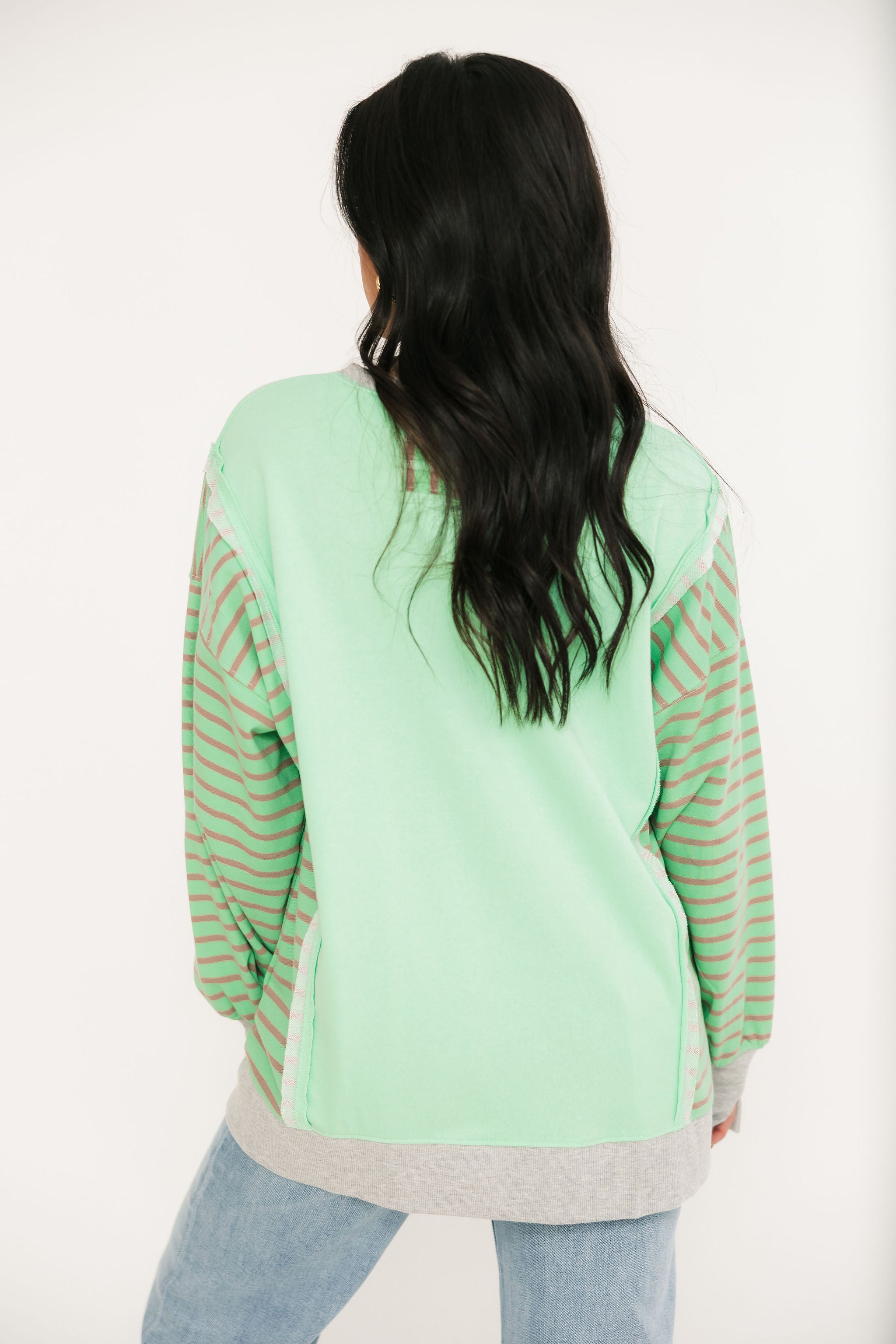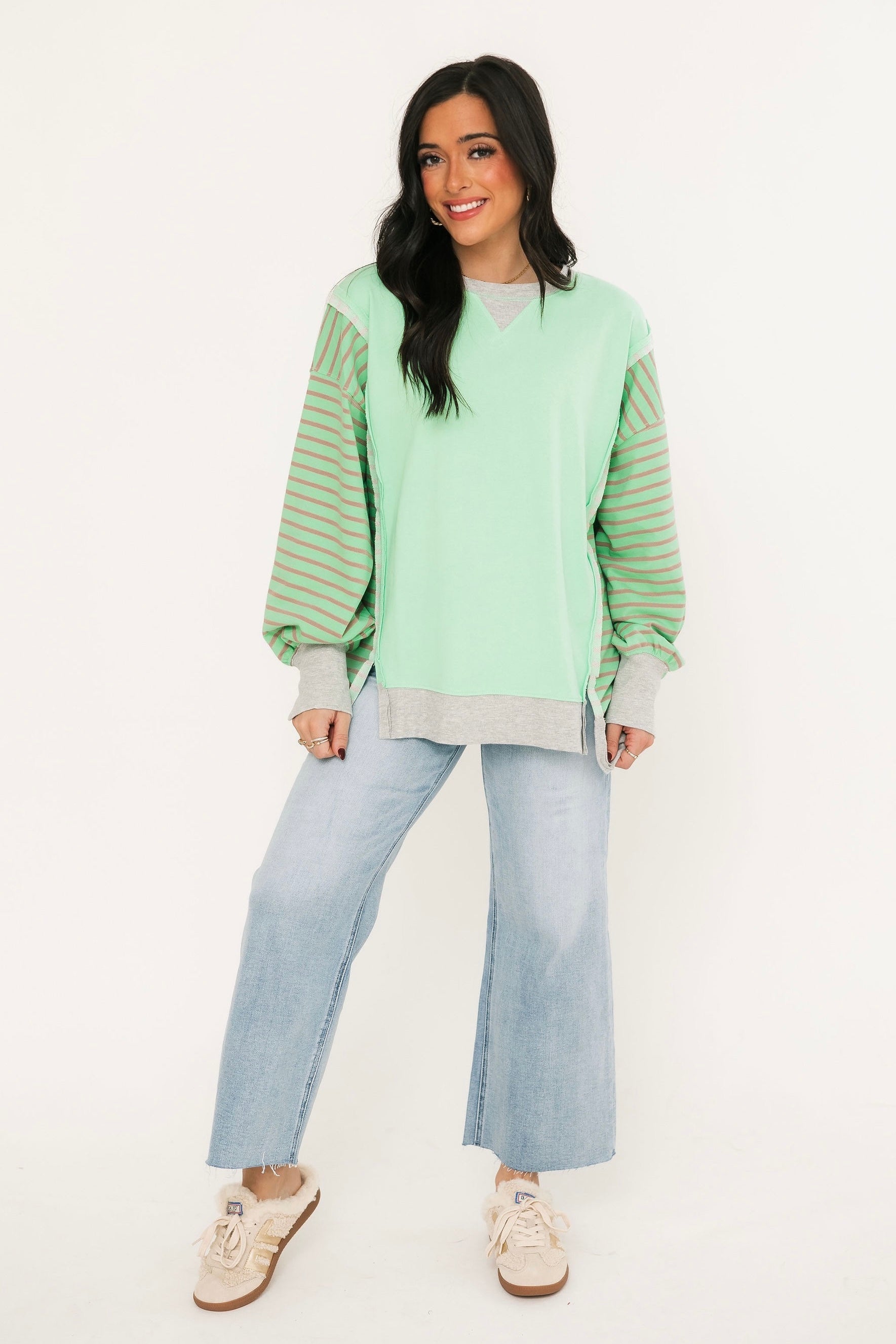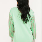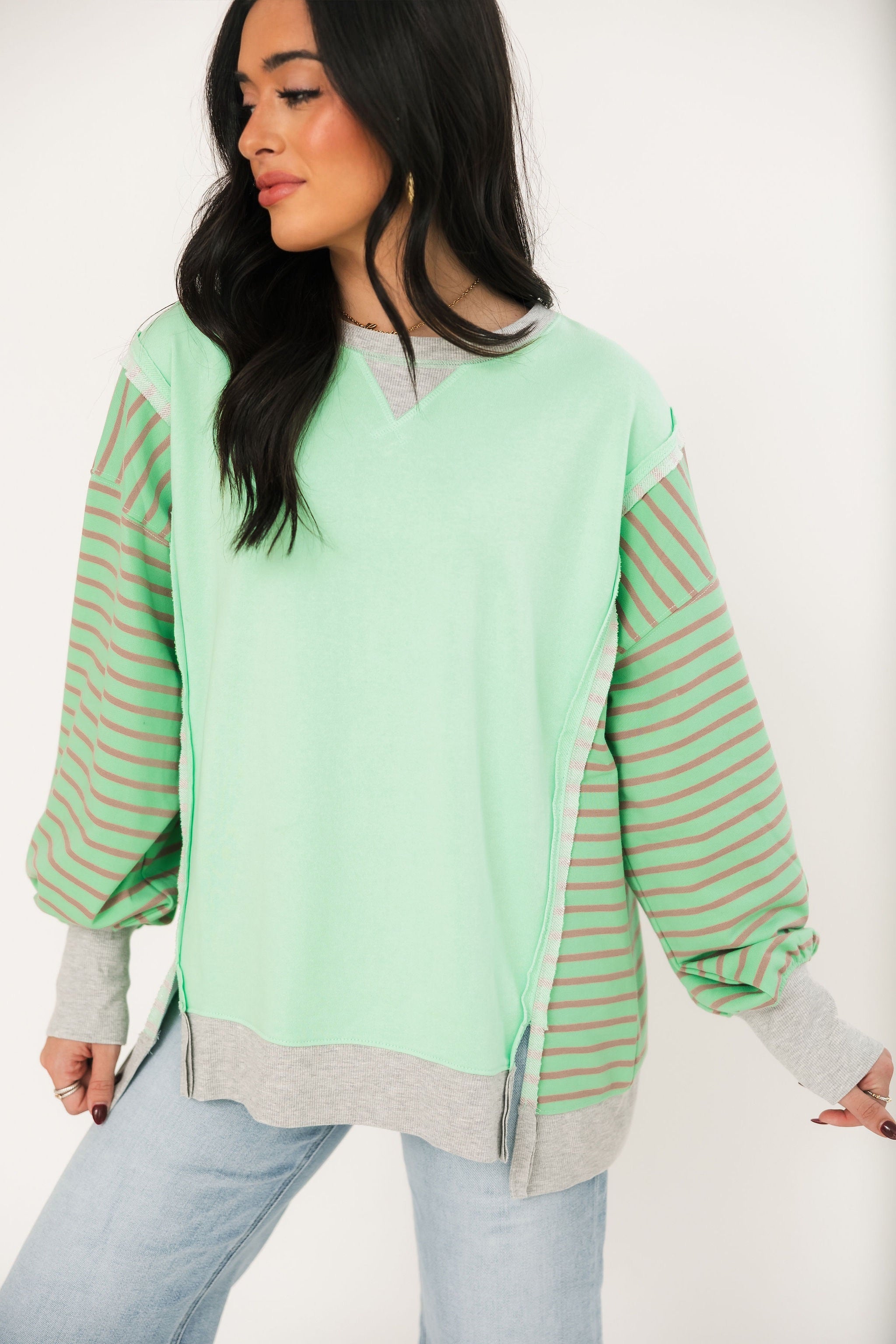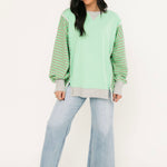 The Good Vibes Crew In Green is made for easy, laid-back style. Designed with a relaxed oversized fit, this top features a classic round neckline, drop shoulders, front and sleeve slits, and a hi-lo hem for that little extra edge. Pair it with leggings or denim for an off-duty look that still feels put-together. Sage is wearing a small.