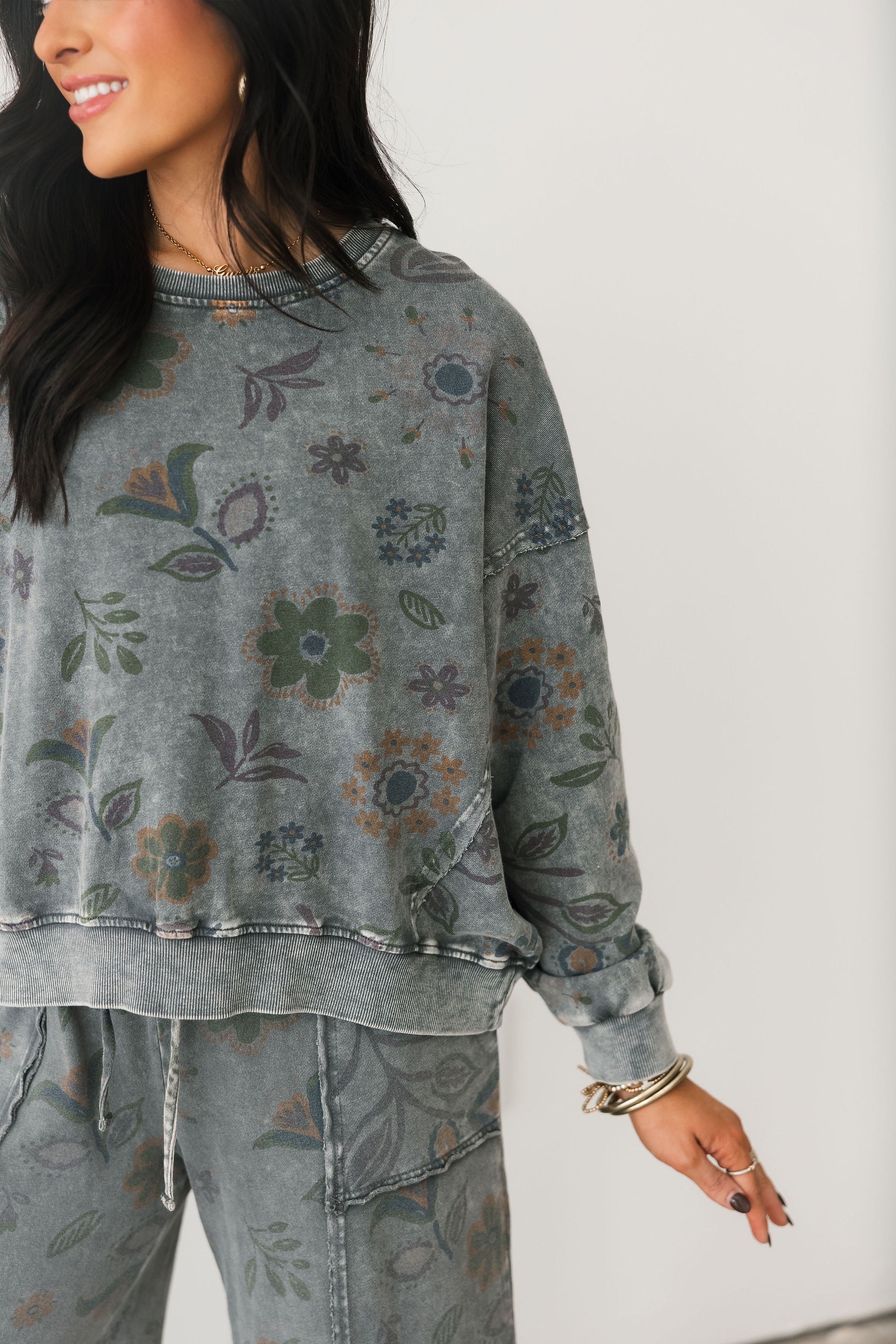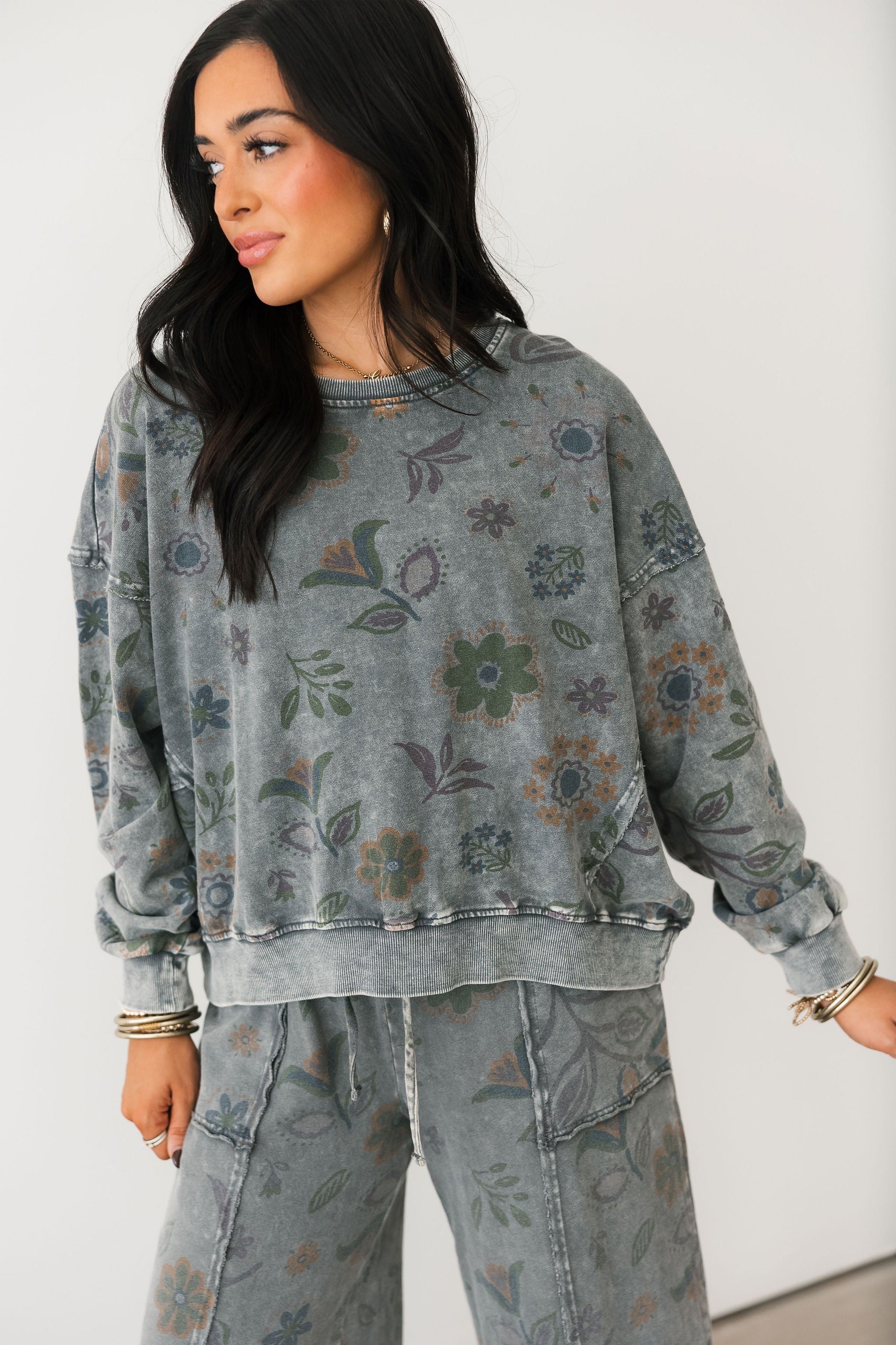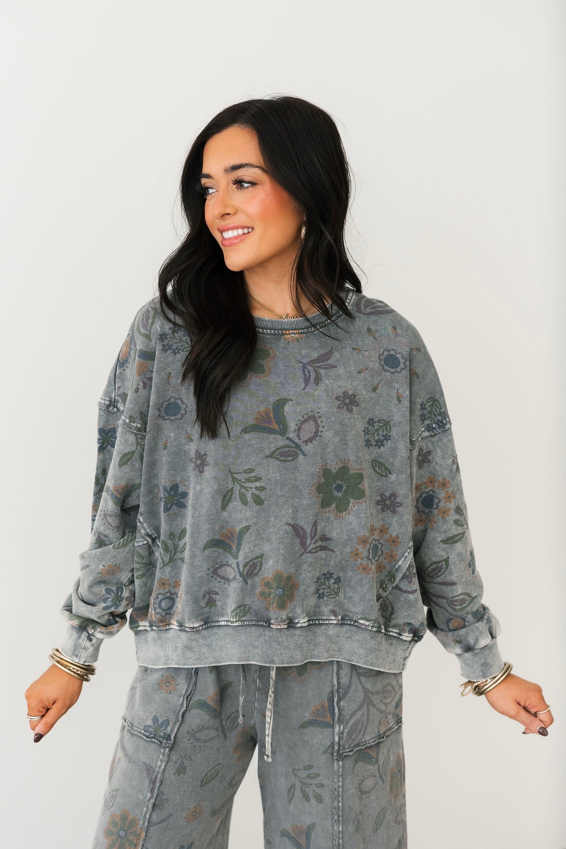 The Dreamy Daze Floral Pullover features a relaxed, loose fit with a slightly cropped length for a modern, laid-back feel. Designed with a classic crew neckline, long sleeves, and ribbed cuffs and hems, it’s finished in a soft floral print that adds subtle interest. Pair it with the matching pants for a coordinated set or style it with denim for an easy everyday look. Sage is wearing a small.