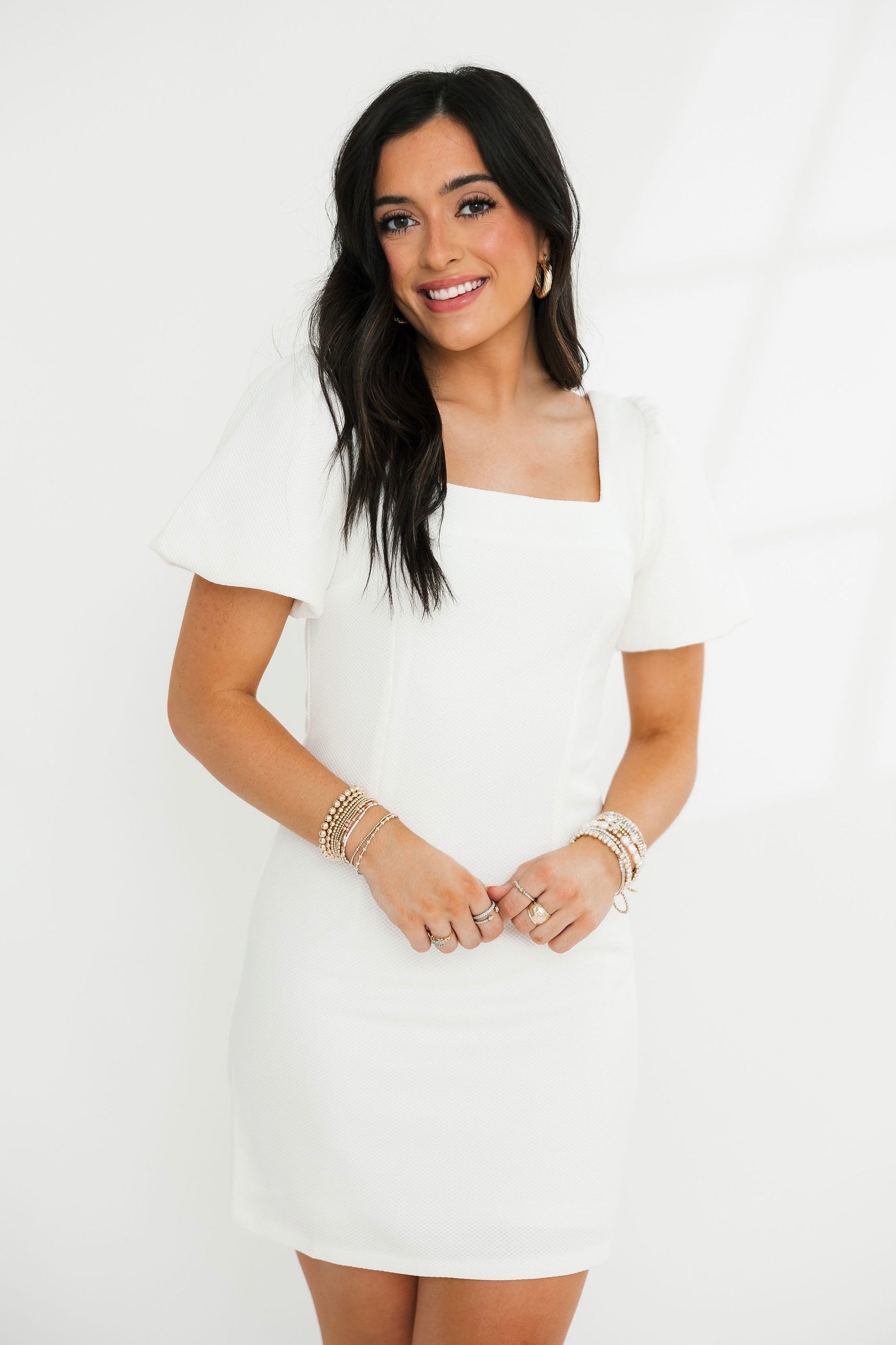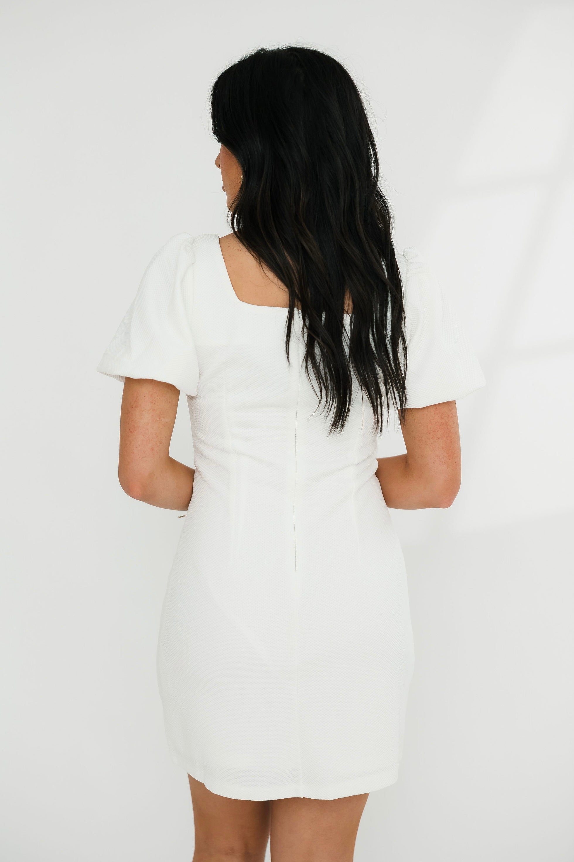 Soft, romantic, and endlessly chic. The Eloise Mini features a graceful silhouette in off white—perfect for bridal shower s, garden parties, or any moment worth remembering. Sage is wearing a small.