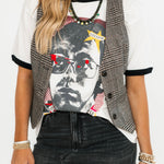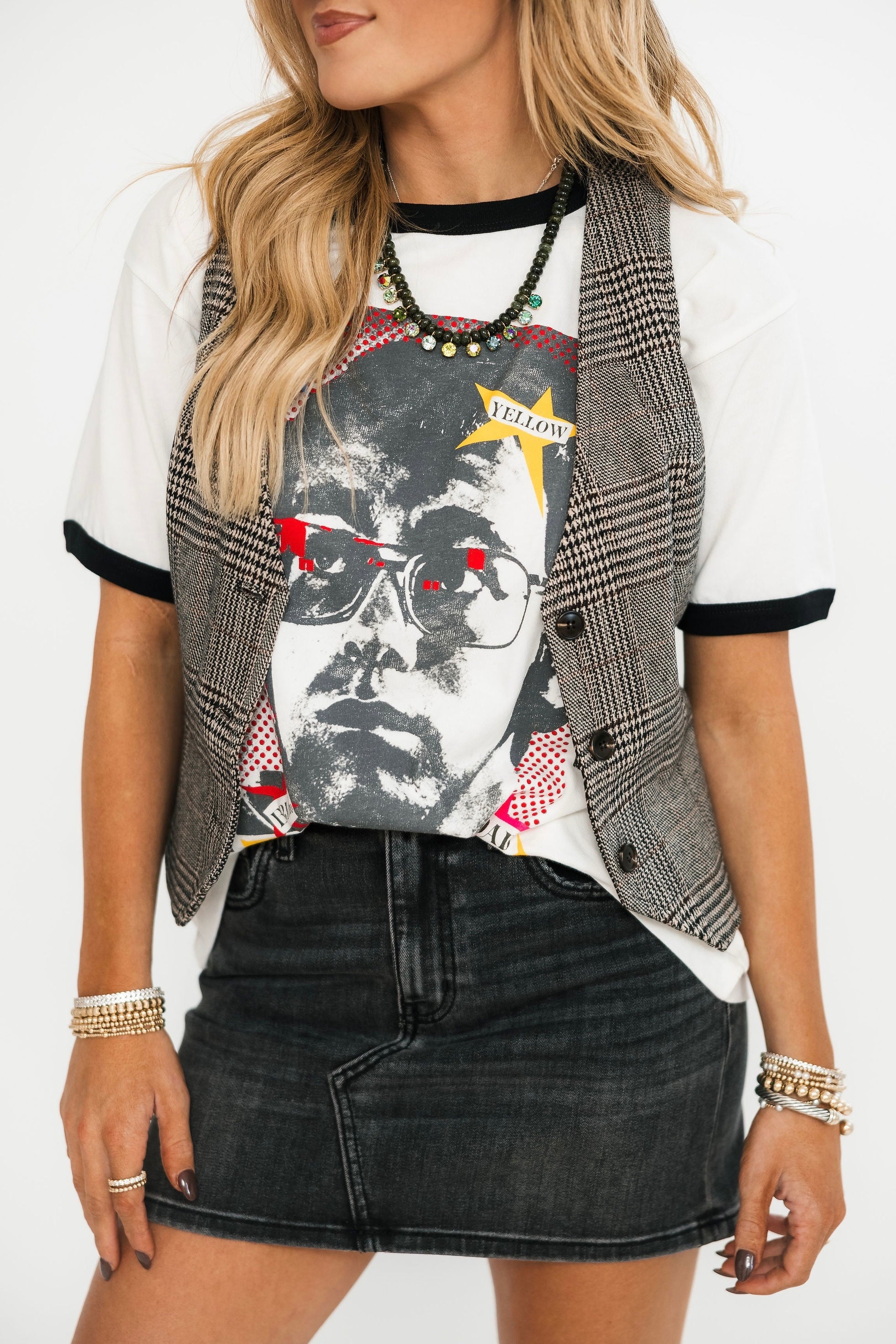 Celebrate Elton John's magnum opus with a pop art portrait of the most glamorous icon in the industry and a collage of Goodbye Yellow Brick Road inspired artwork highlighting all things that made Elton, Elton John. Lexi is wearing an xs.