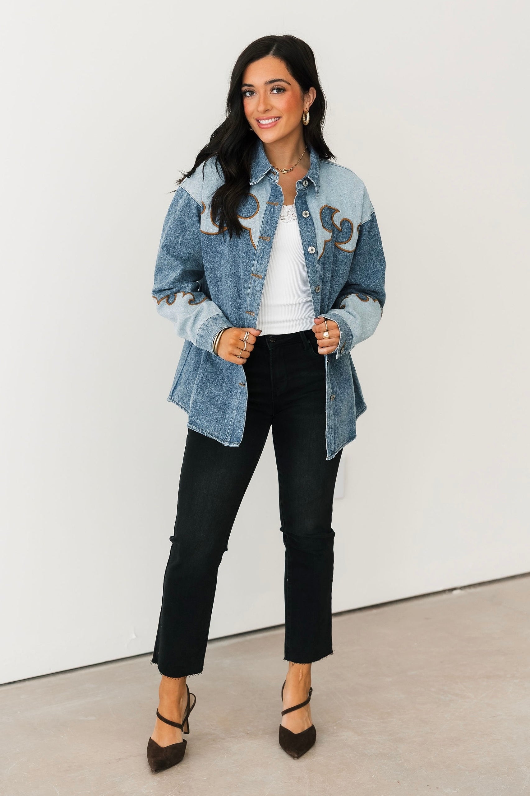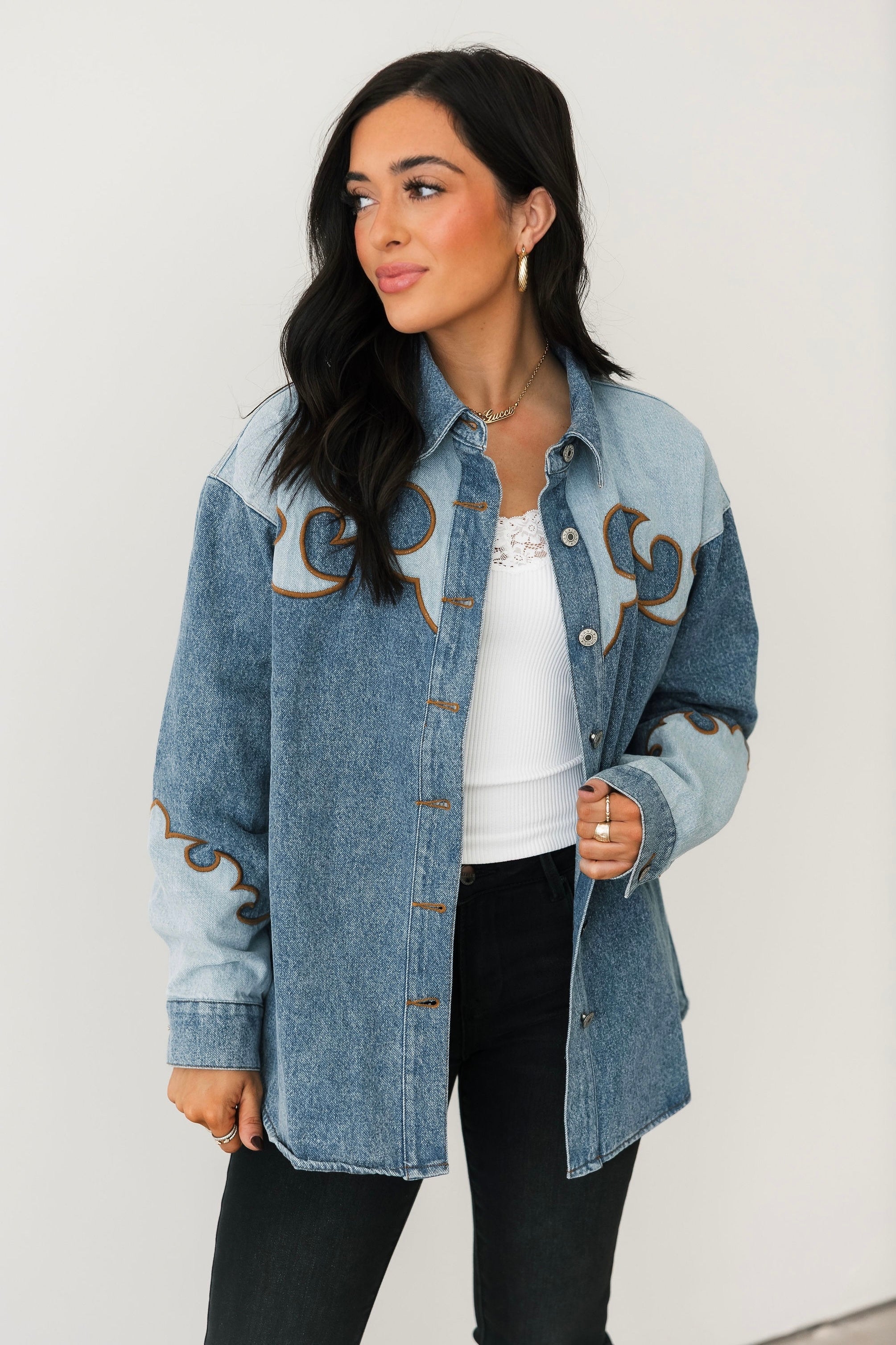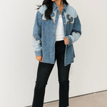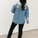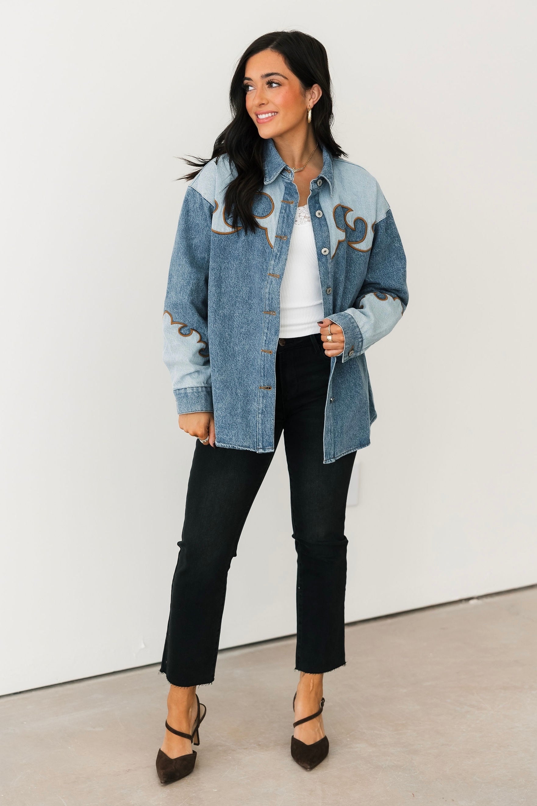 This relaxed, oversized denim jacket features embroidery details for a fun touch. With a classic 4-pocket design, it’s both stylish and functional. Perfect for layering with its easy button closure and laid-back vibe. Sage is wearing a small.