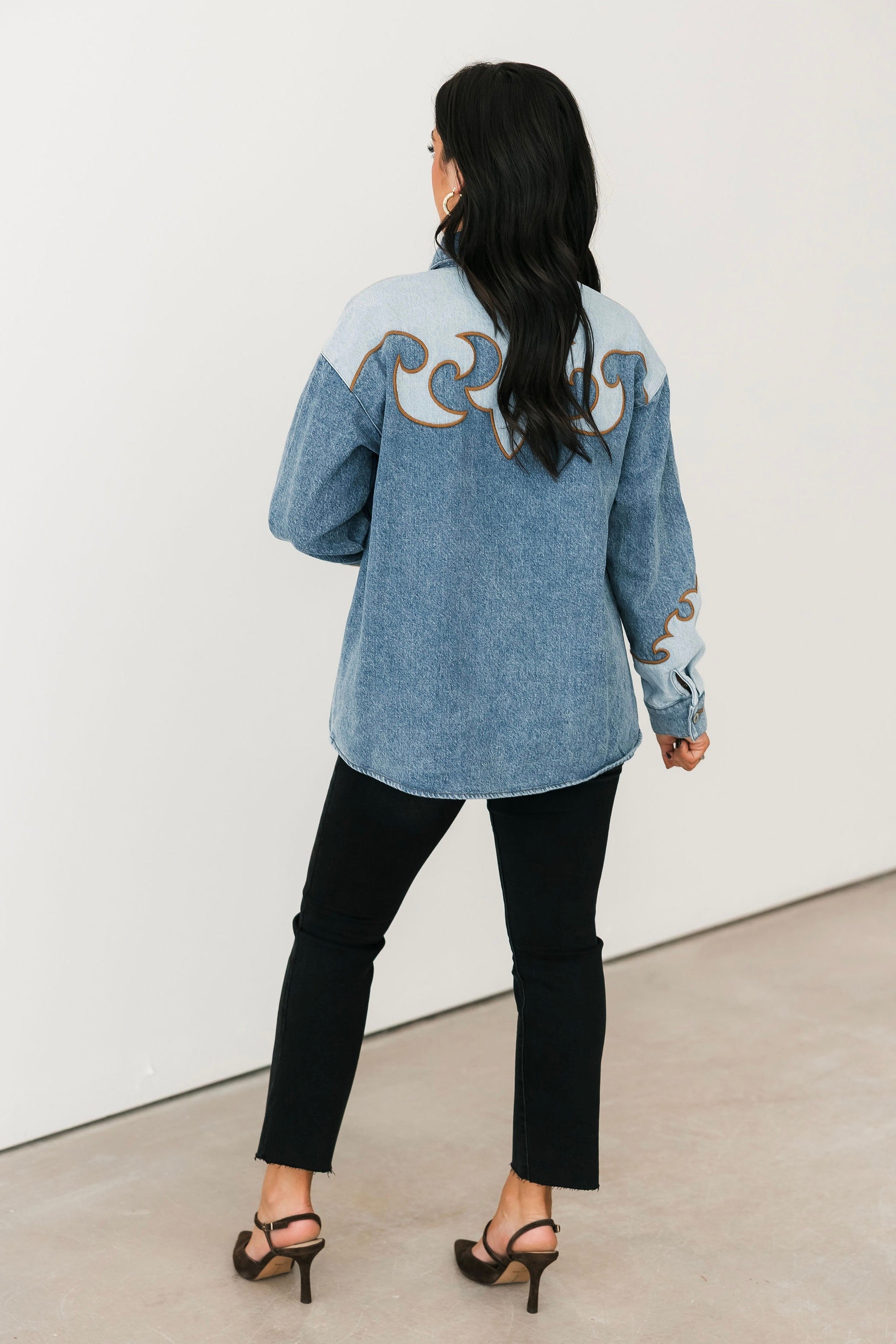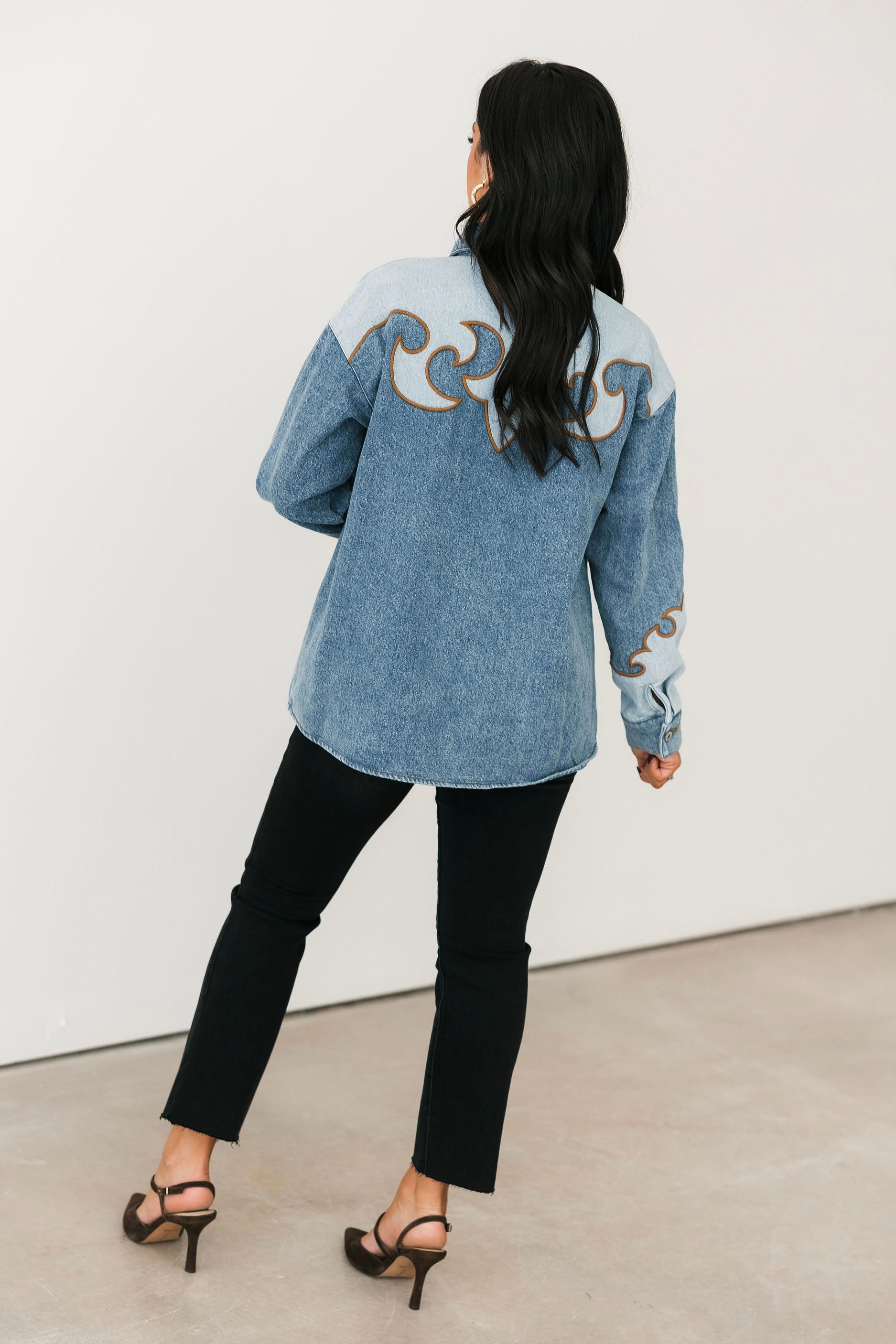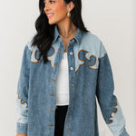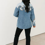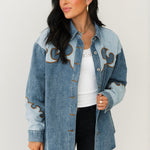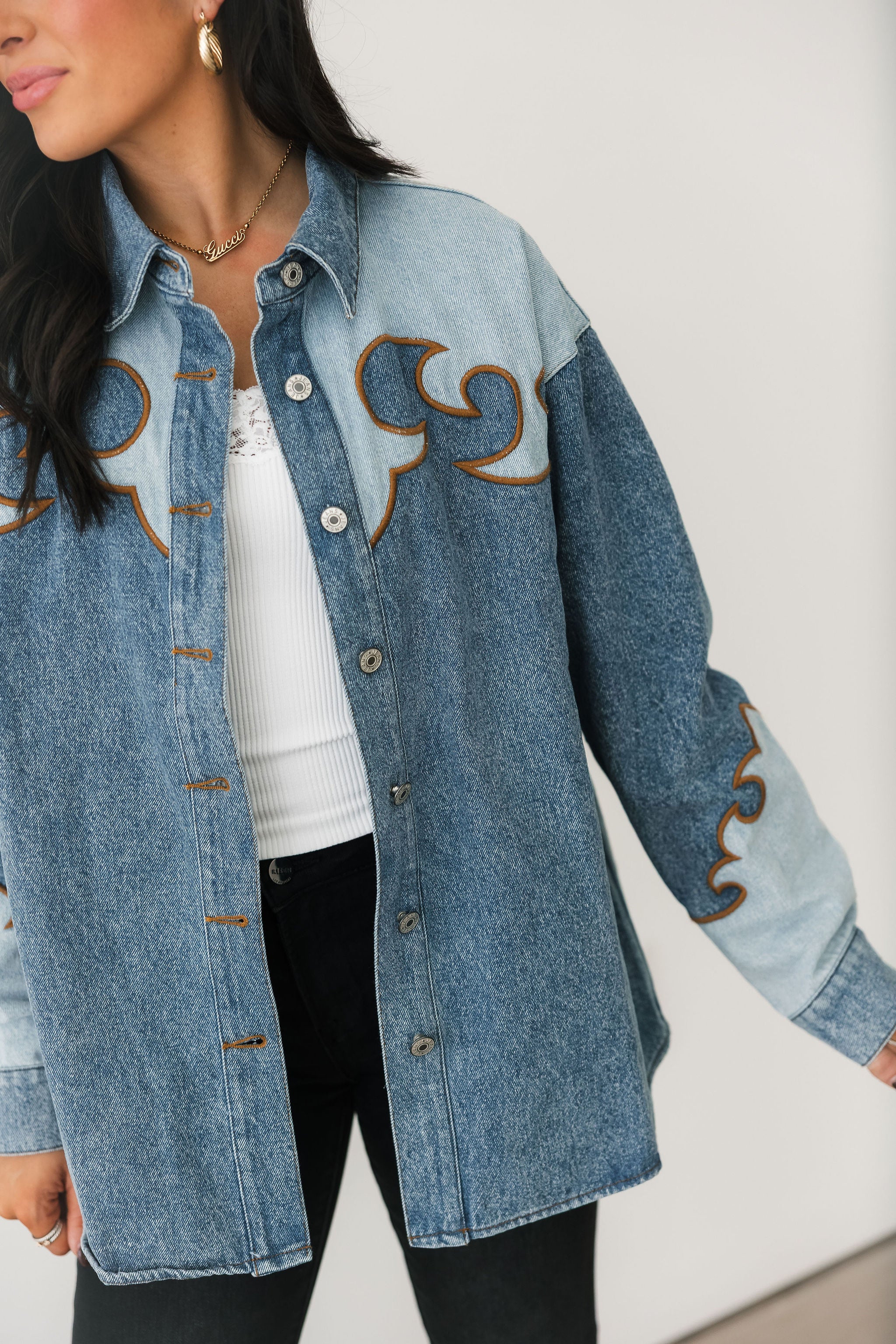 This relaxed, oversized denim jacket features embroidery details for a fun touch. With a classic 4-pocket design, it’s both stylish and functional. Perfect for layering with its easy button closure and laid-back vibe. Sage is wearing a small.
