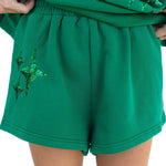 Add a pop of color to your look with these emerald green shorts featuring the signature Queen of Sparkles card logo. With their relaxed fit and easy pull-on elastic waistband, they bring together playful sparkle and all-day comfort.
