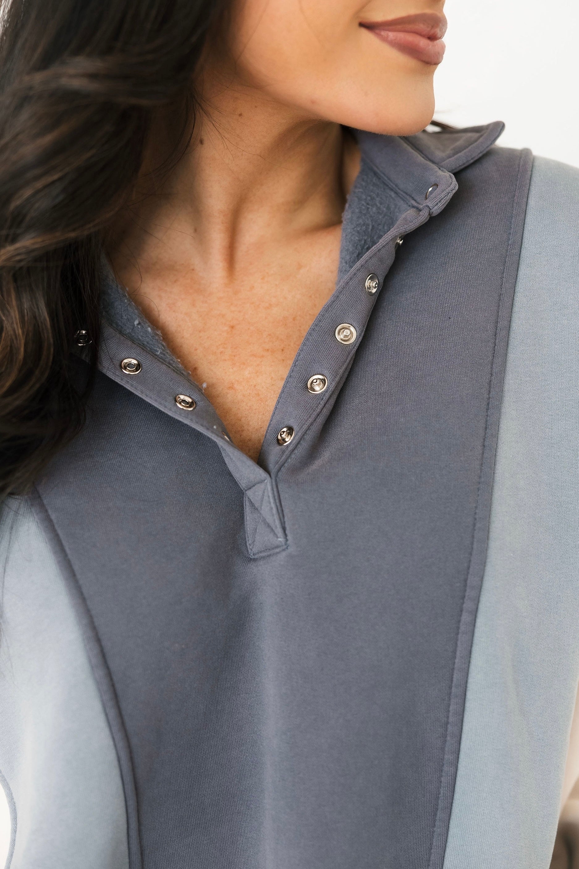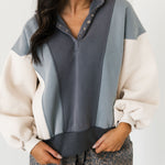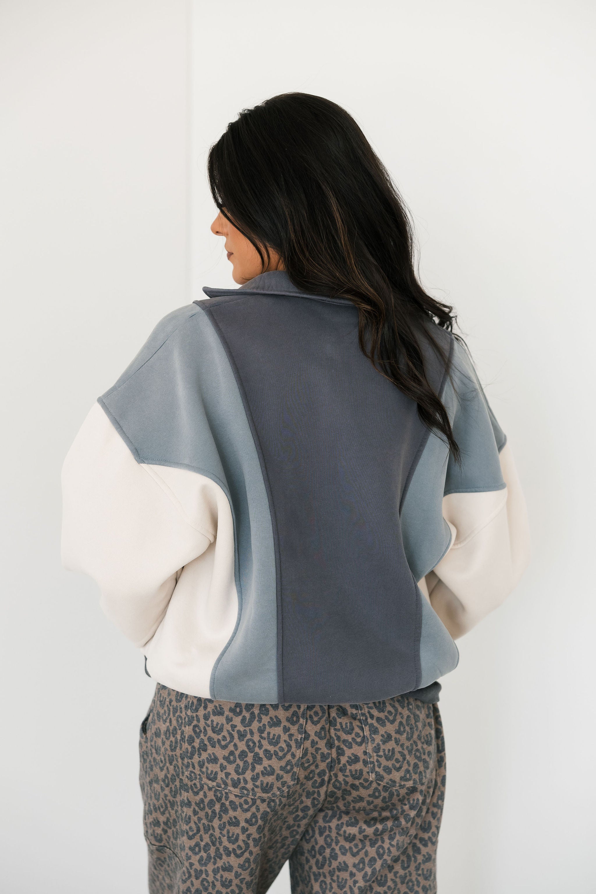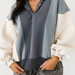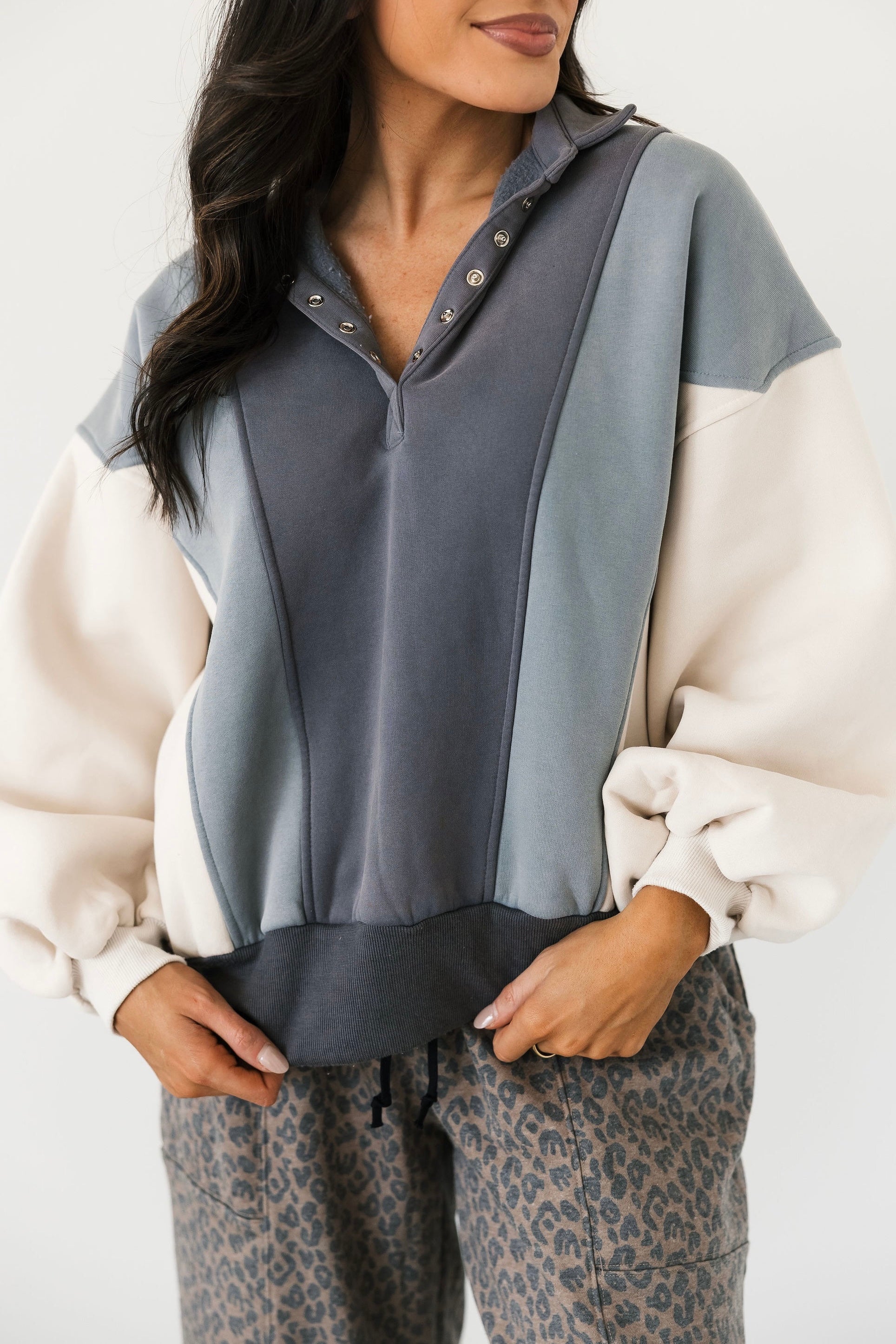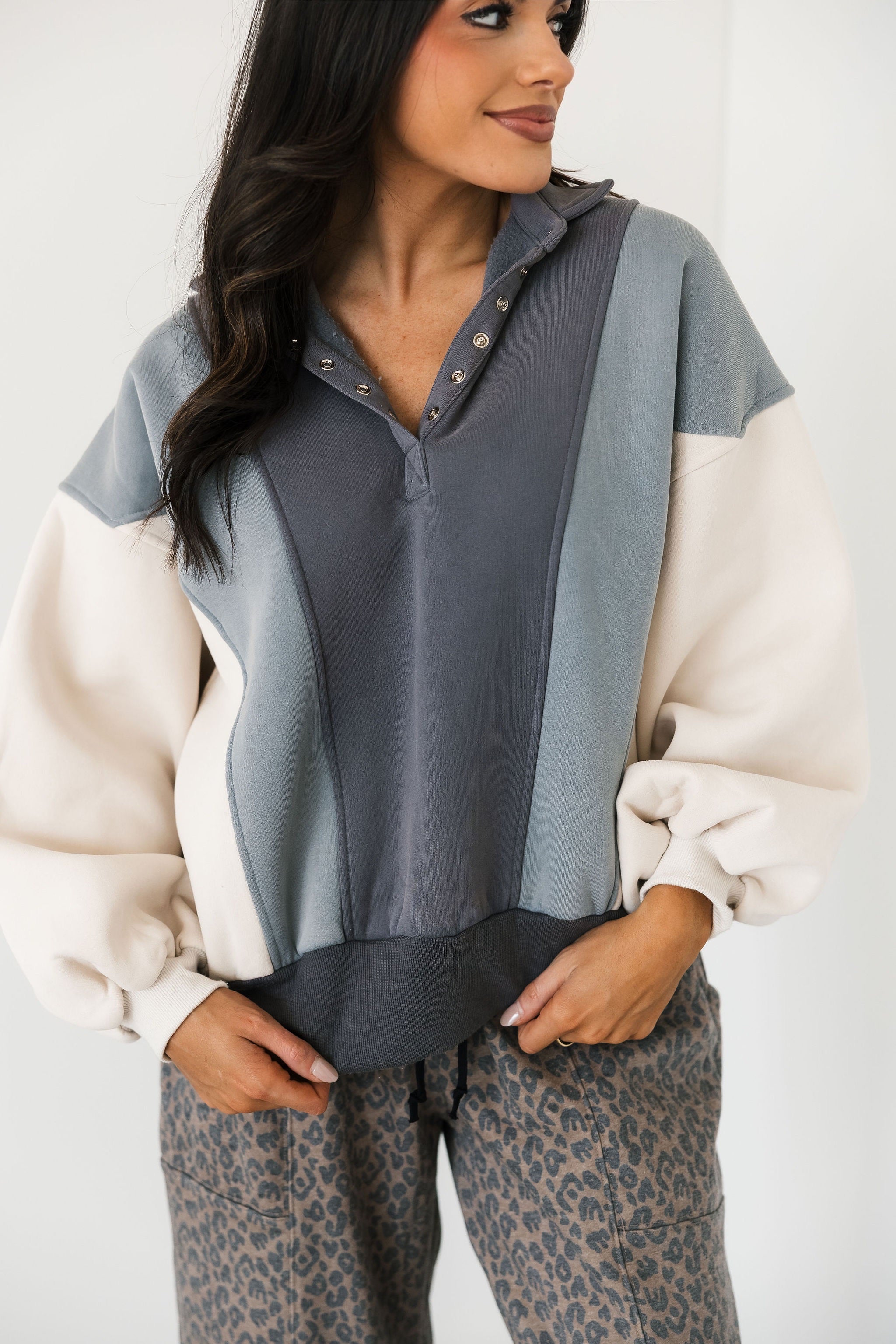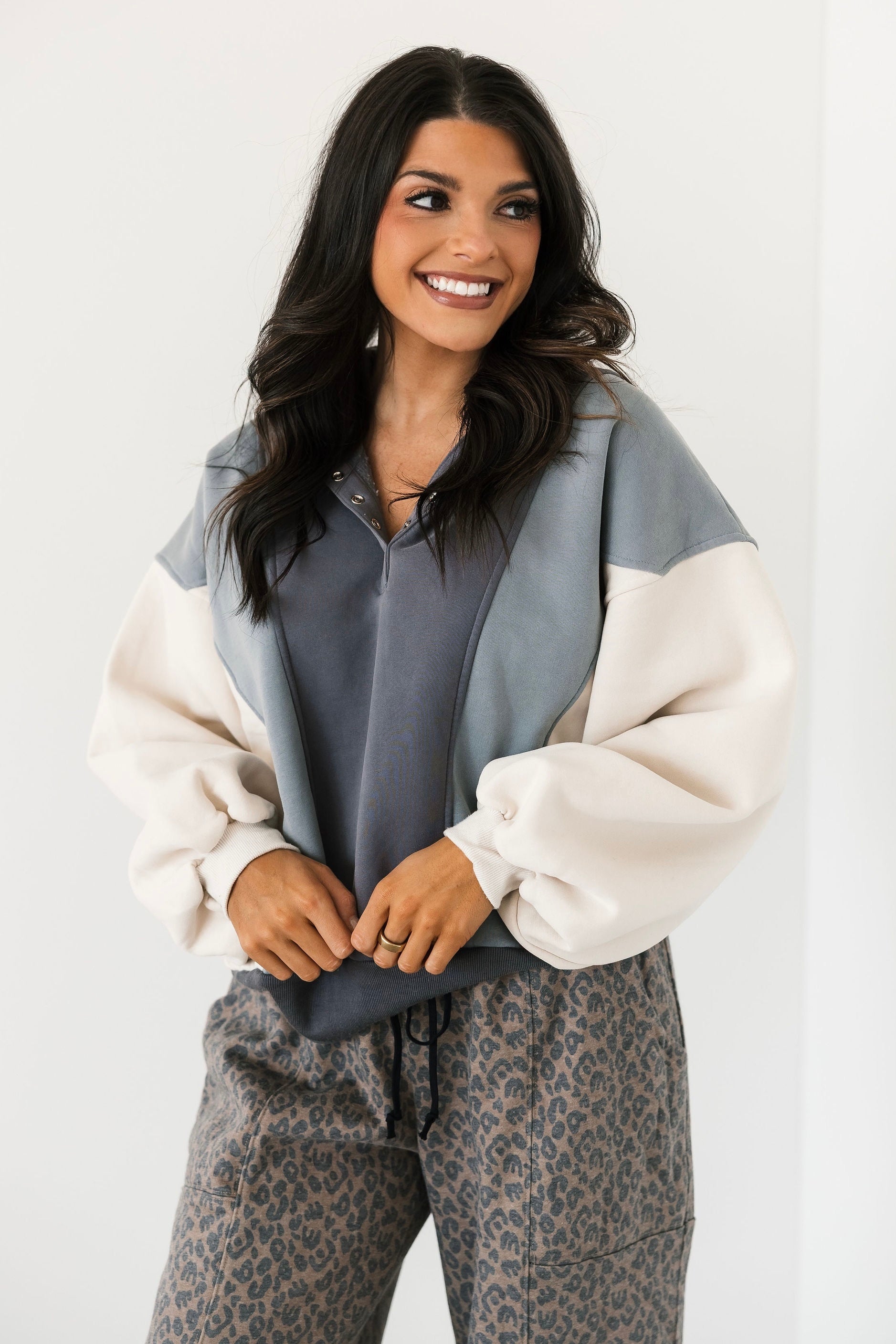 The Emma Sweatshirt features an oversized fit with a quarter-snap front and collared neckline for a relaxed yet elevated look. Finished with long sleeves and colorblock detailing, it’s the kind of throw-on-and-go piece that still feels thoughtfully styled. Harli is wearing medium.