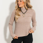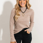 The Essential Ribbed Mock Neck in Mocha is your new go-to elevated basic. Crafted from a soft ribbed knit with a subtle shimmer, this relaxed-fit top adds a touch of sophistication and sparkle to any outfit — perfect for layering or wearing on its own. Lexi is wearing a small.