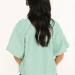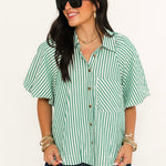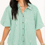 Dressing chic comes easy when you’re styling with this striped bubble sleeve top! Striped fabric shapes a collared neckline with a button down placket and voluminous bubble sleeves. Relaxed bodice (with a front patch pocket) ends at the waist. Pair with any bottoms to achieve an effortlessly pulled-together look! Sage is wearing a small.