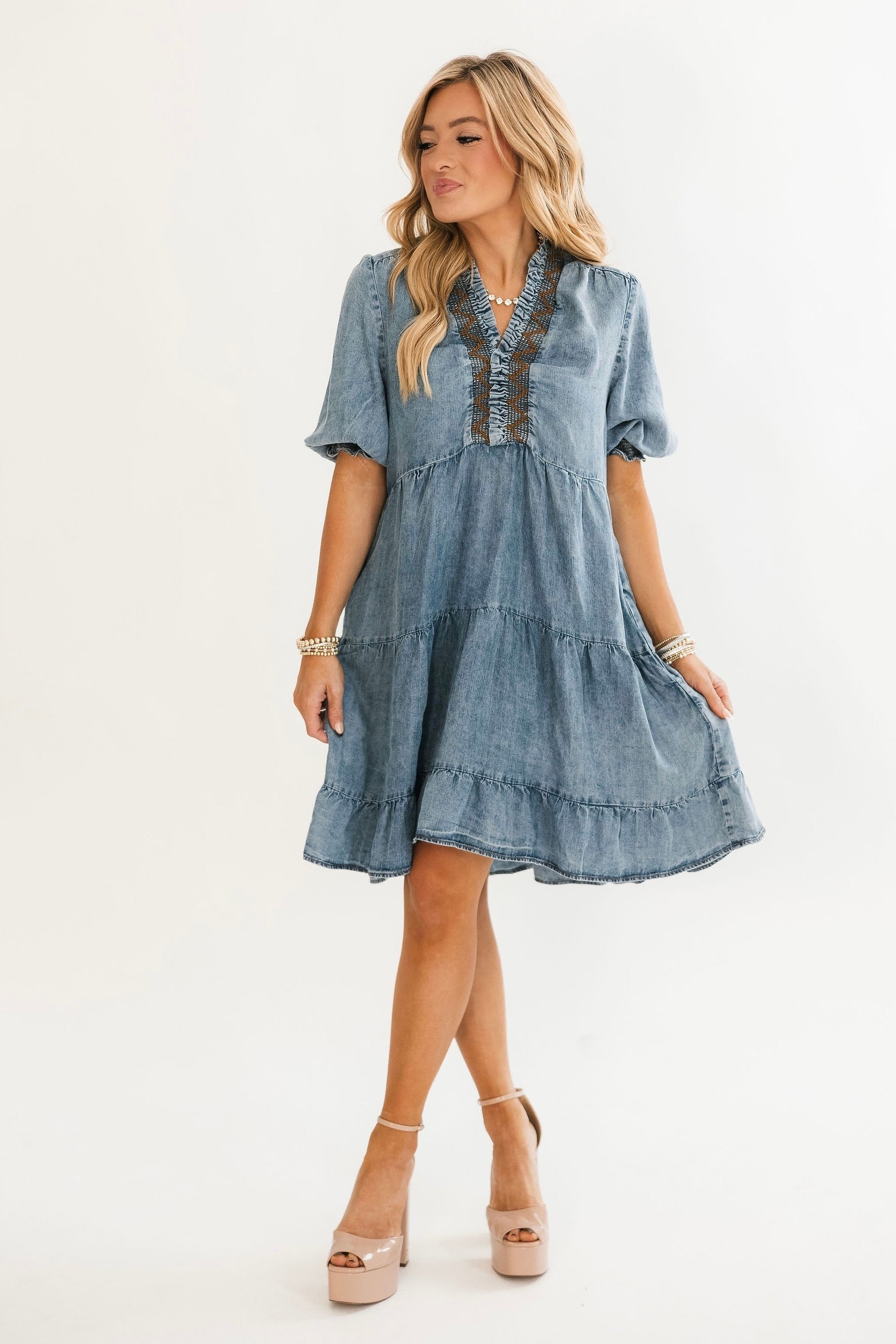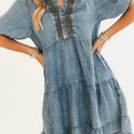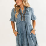 The Everly Mini Dress is the perfect mix of playful and polished. Designed in a lightweight denim wash, this flowy mini features a flattering A-line silhouette with tiered layers for easy movement. A ruffled v-neckline with smocked embroidery trim adds feminine charm, while half puff sleeves keep the look soft and romantic. Finished with side pockets, it’s an effortless everyday dress you’ll reach for again and again. Lexi is wearing a small.