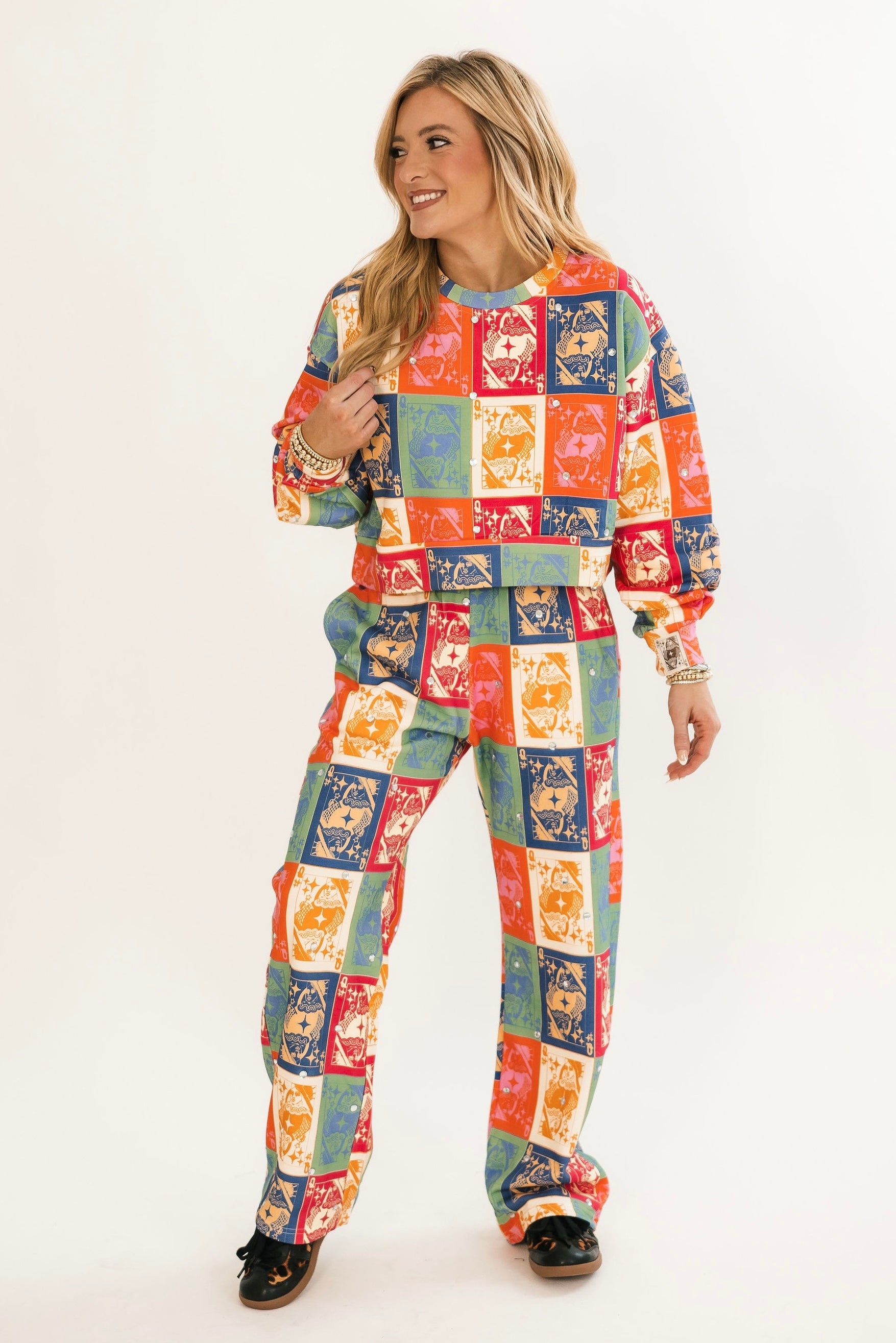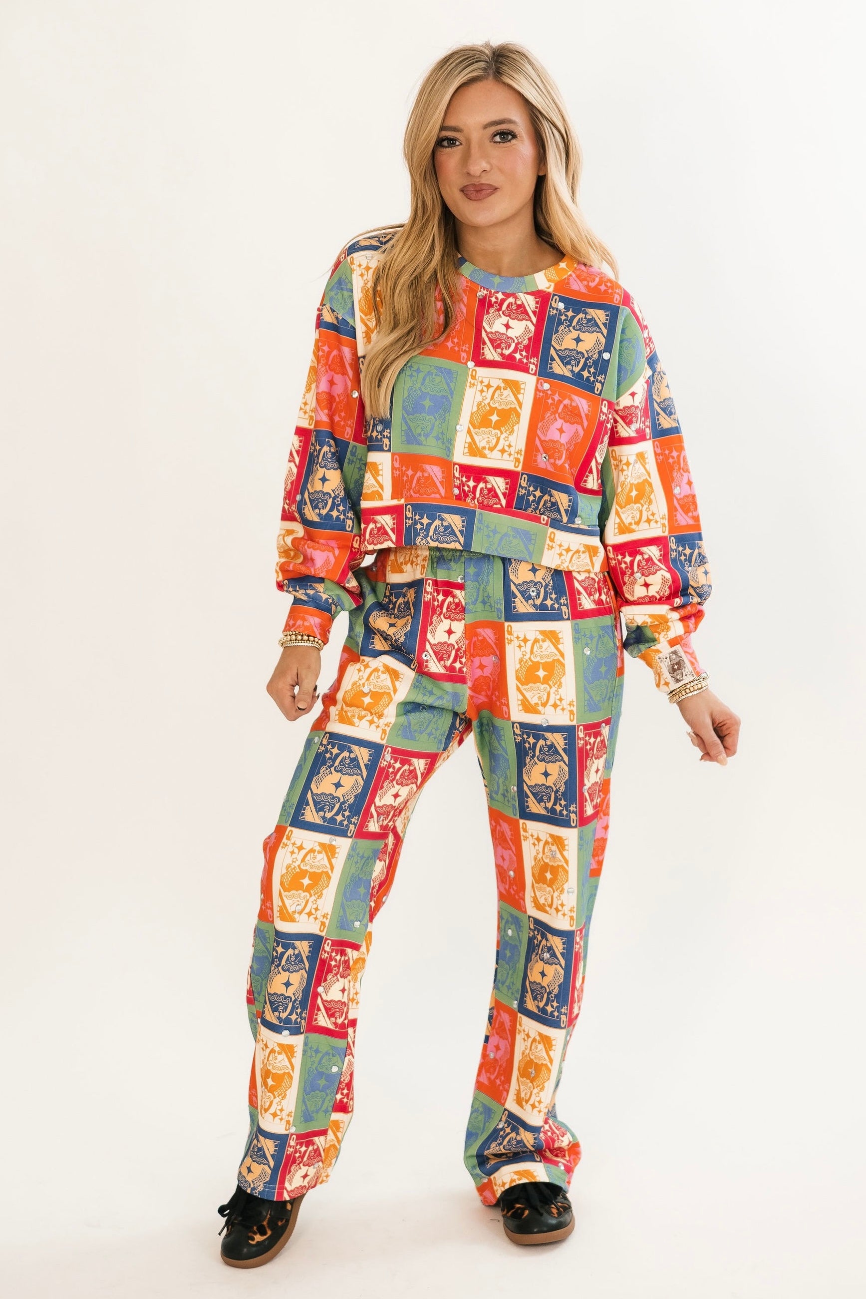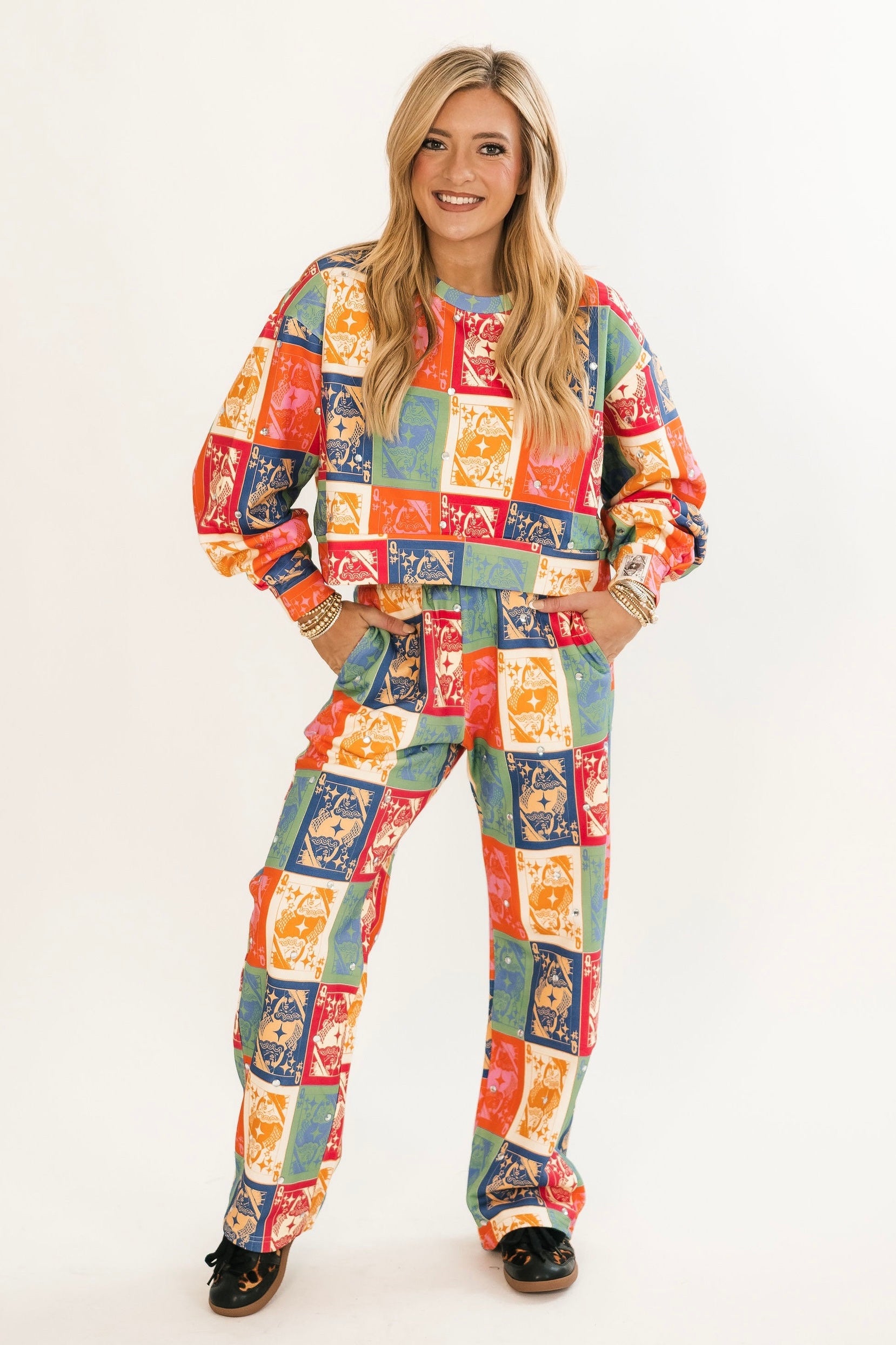 Bring bold, seasonal charm to your cozy wardrobe with this relaxed-fit crewneck. Featuring rich fall-toned colorblocking and the signature QOS card logo, it’s the perfect blend of playful and laid-back. Pair it with jeans, leggings, or the matching sweatpants for a head-to-toe fall statement. Lexi is wearing an XS.