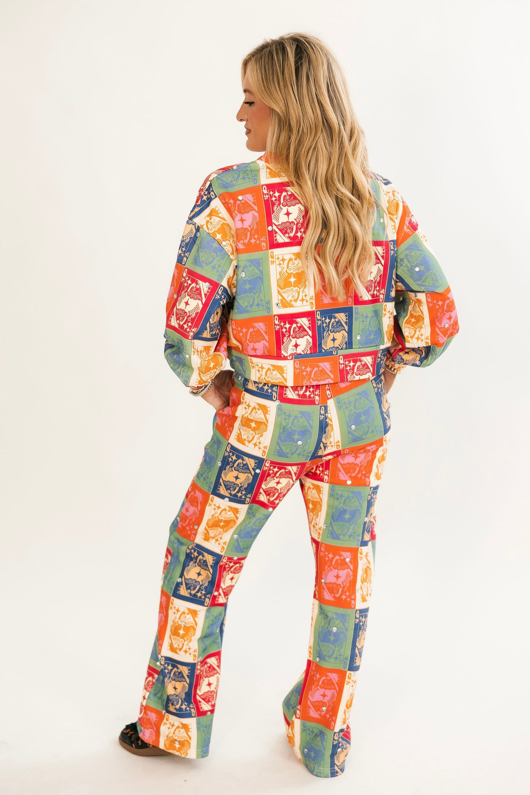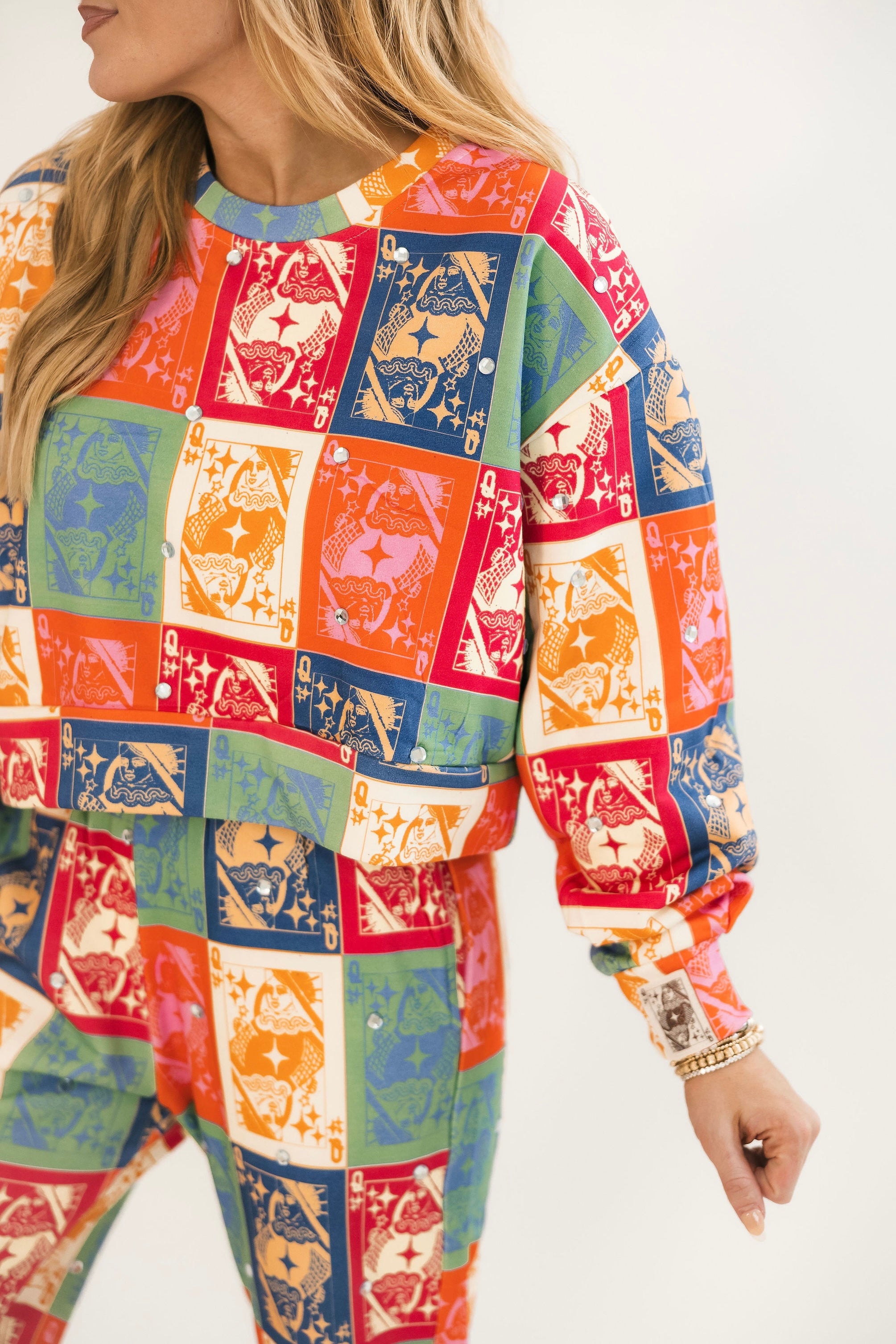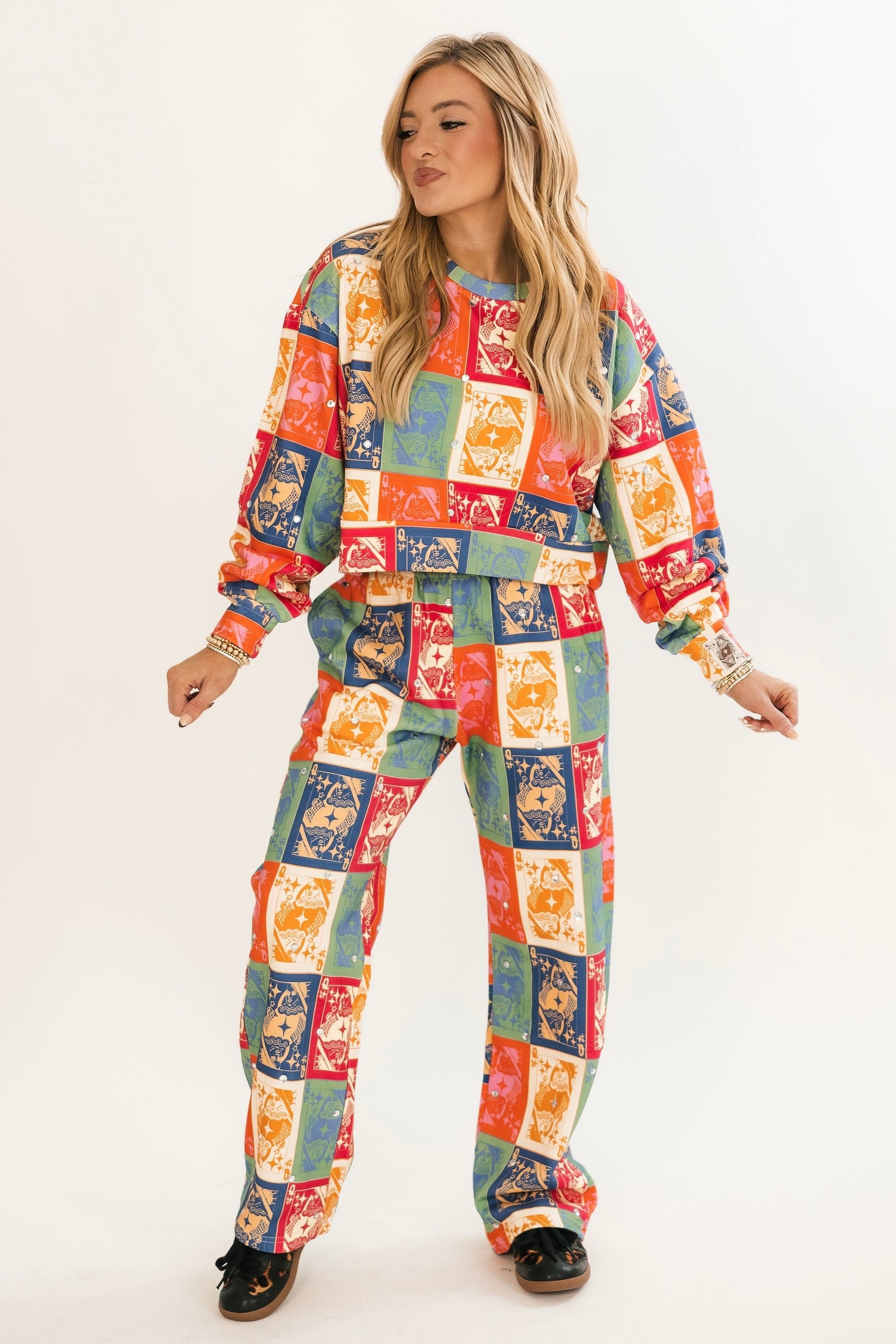 Bring bold, seasonal charm to your cozy wardrobe with this relaxed-fit crewneck. Featuring rich fall-toned colorblocking and the signature QOS card logo, it’s the perfect blend of playful and laid-back. Pair it with jeans, leggings, or the matching sweatpants for a head-to-toe fall statement. Lexi is wearing an XS.