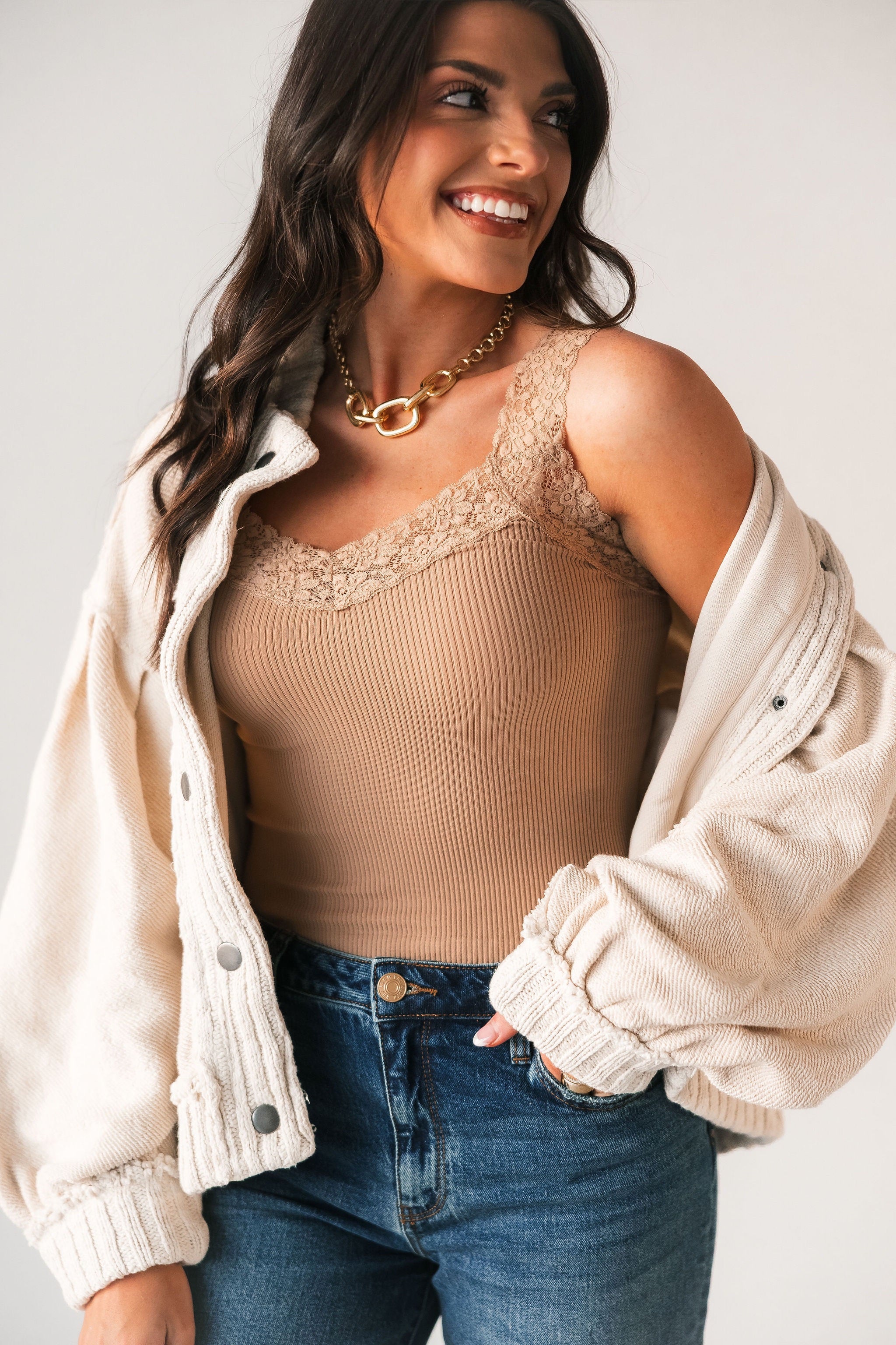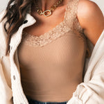 The Fallen For Lace Tank is a fitted knit style featuring a flattering scoop neckline and delicate lace trim for that sweet, elevated finish. Sleeveless and stretchy, it’s designed to hug you comfortably while adding a subtle touch of charm. Dress it up, layer it, or wear it casual — it’s a versatile must-have. Harli is wearing a S/M.