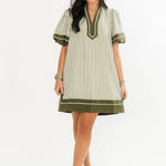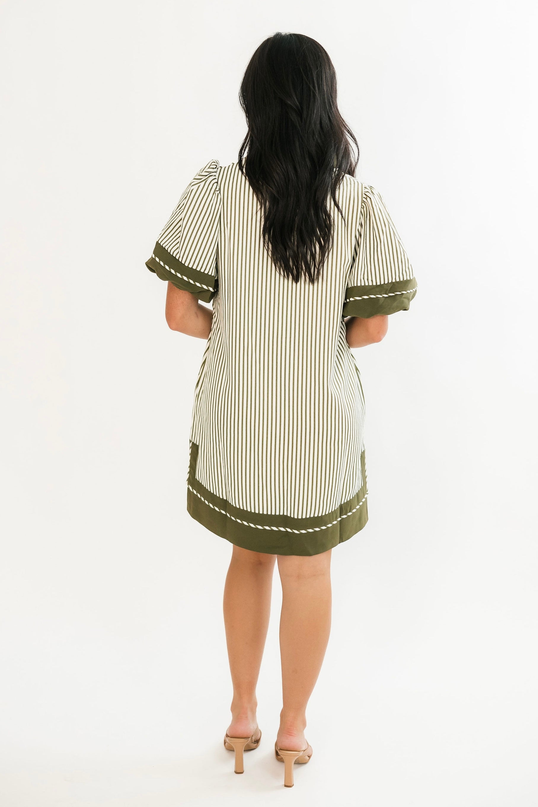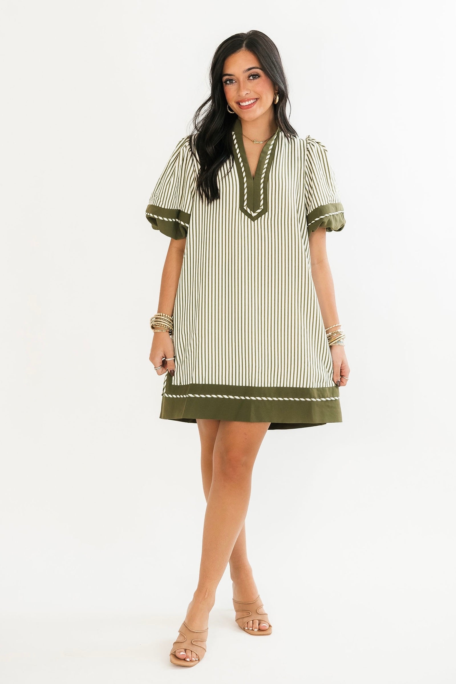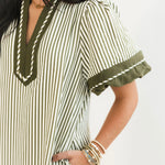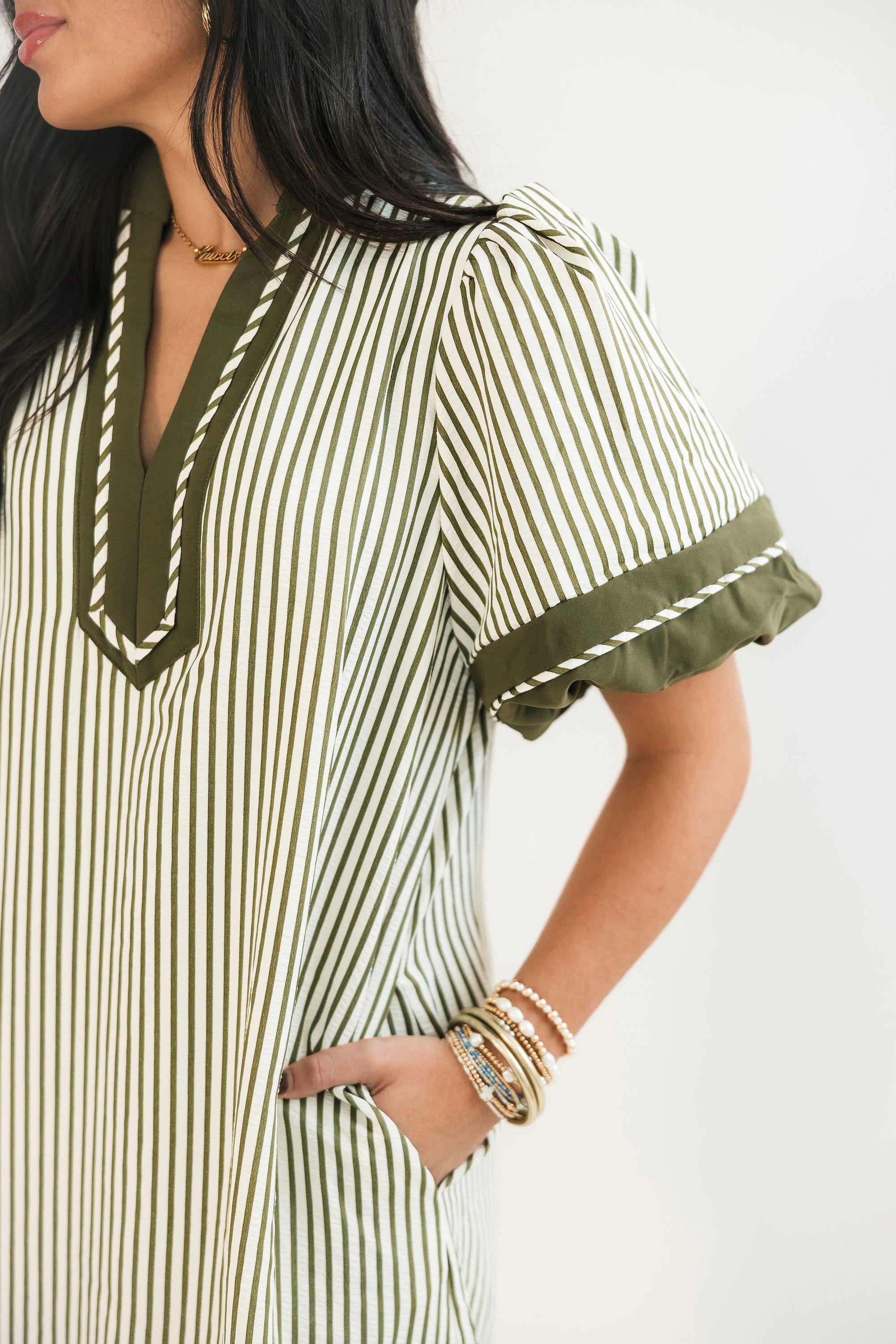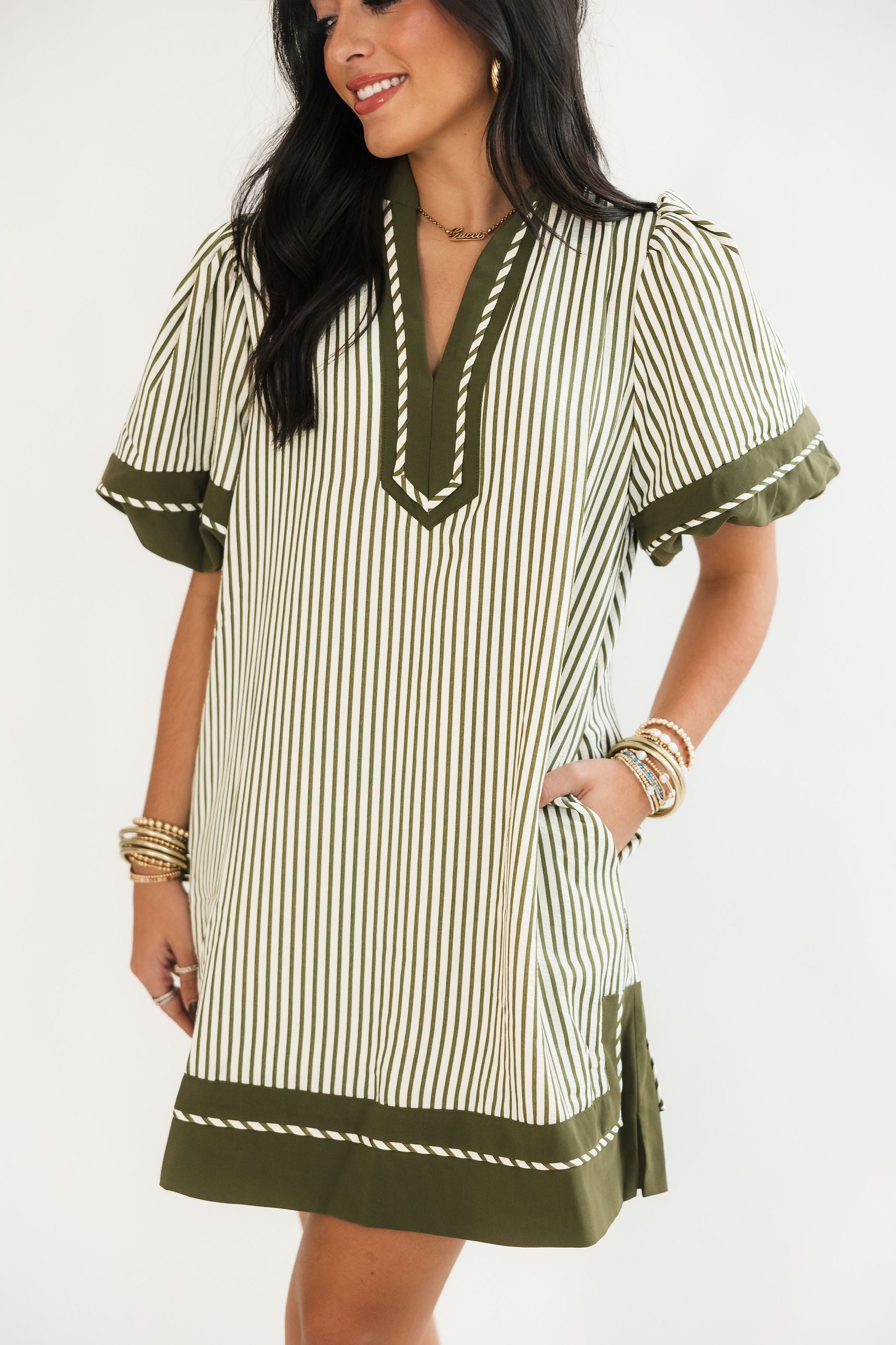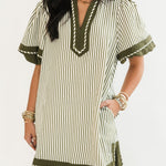 The Falling For You Mini Dress in Olive features a relaxed fit, V-neckline, short sleeves, and a fun striped pattern. Its mini length makes it perfect for casual days or layering with boots for a chic seasonal look. Sage is wearing a small.