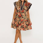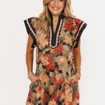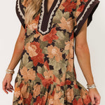 A love letter to autumn, the Falling Leaves Mini Dress features a relaxed, billowy silhouette with an airy V-neckline and an all-over print of rich, fall-colored leaves and florals. Effortlessly flattering and endlessly wearable, it’s perfect for crisp days with boots or layered under a cozy cardigan. Lexi is wearing a small.
