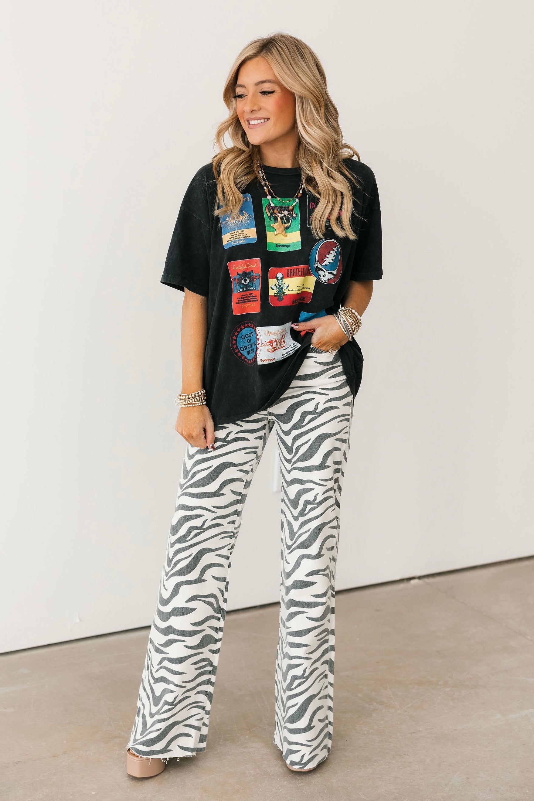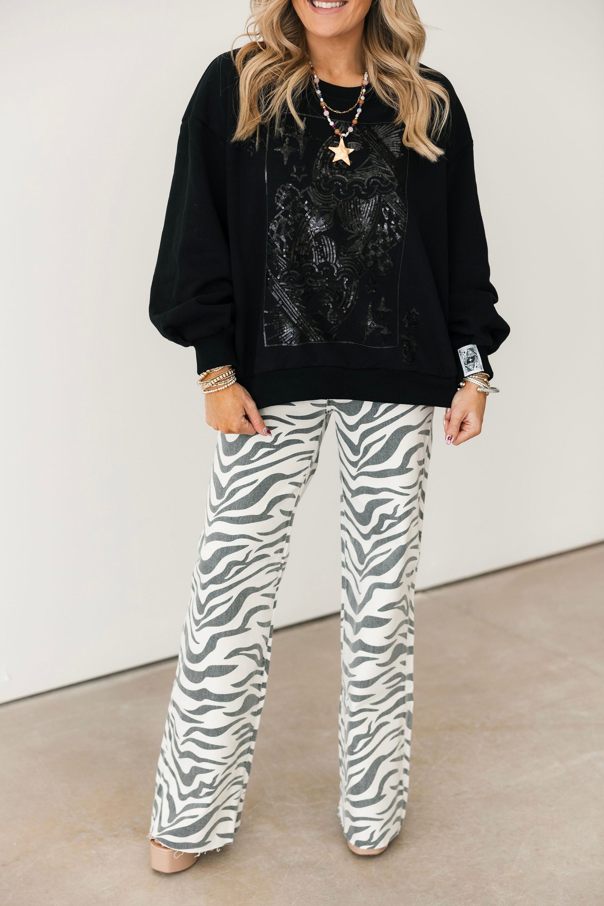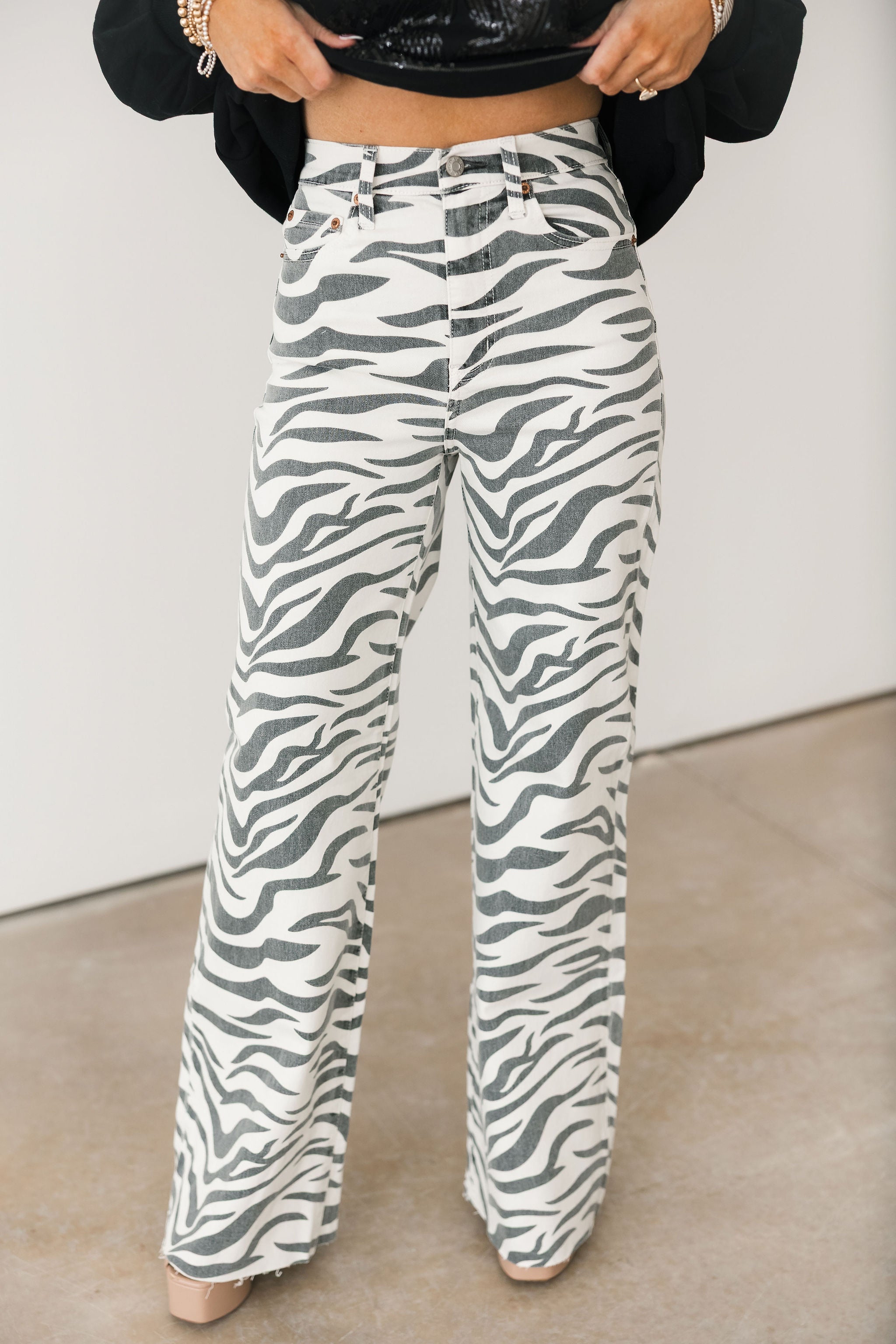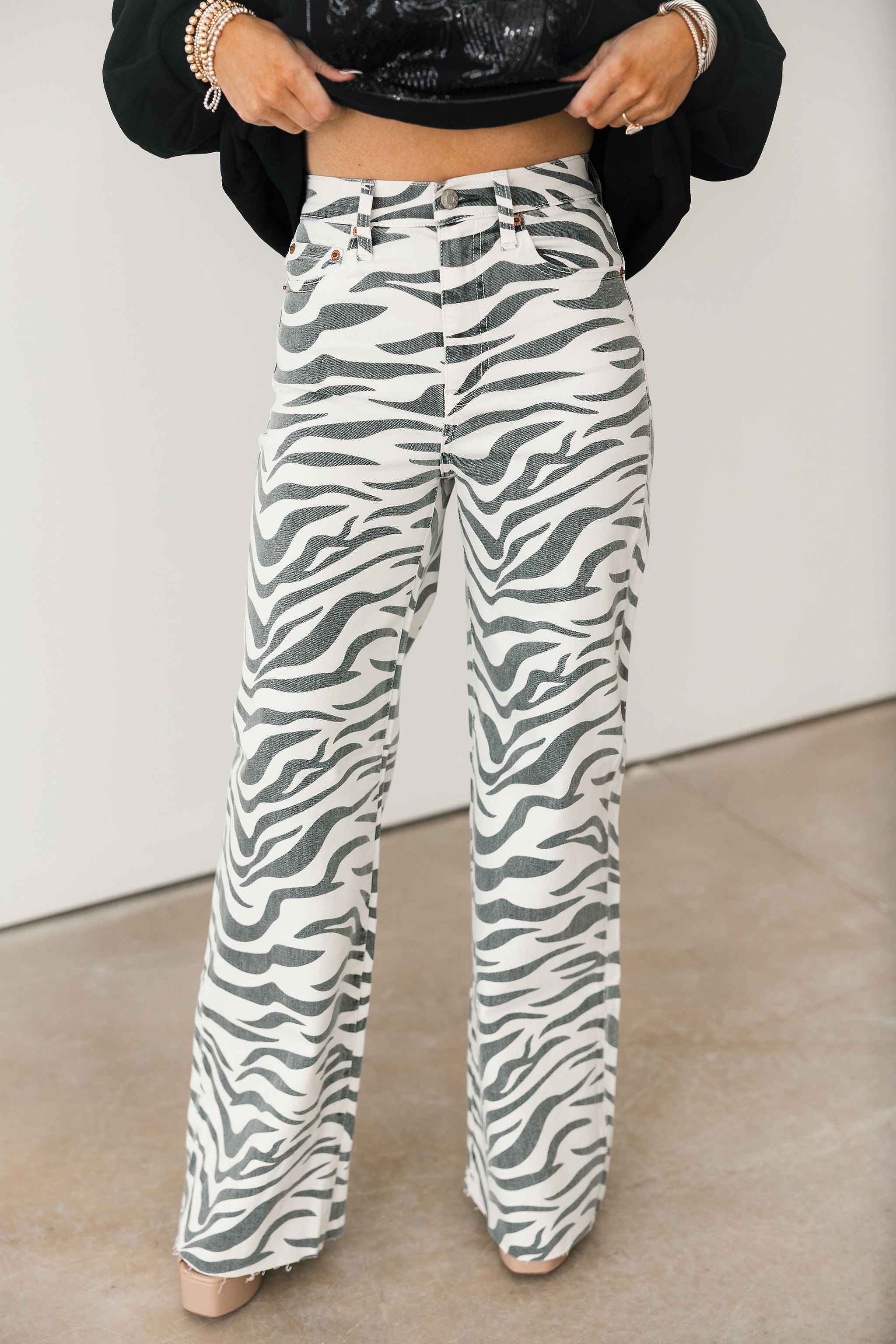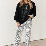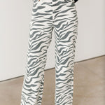 The cool girl jean, Far Out is a modern silhouette made fun with a statement making zebra print! The fit's twisted seams and waist defining high rise give the appearance of longer legs. This wide leg is constructed in our "hug" denim that hugs your body, but has just enough weight to keep a structured fit.