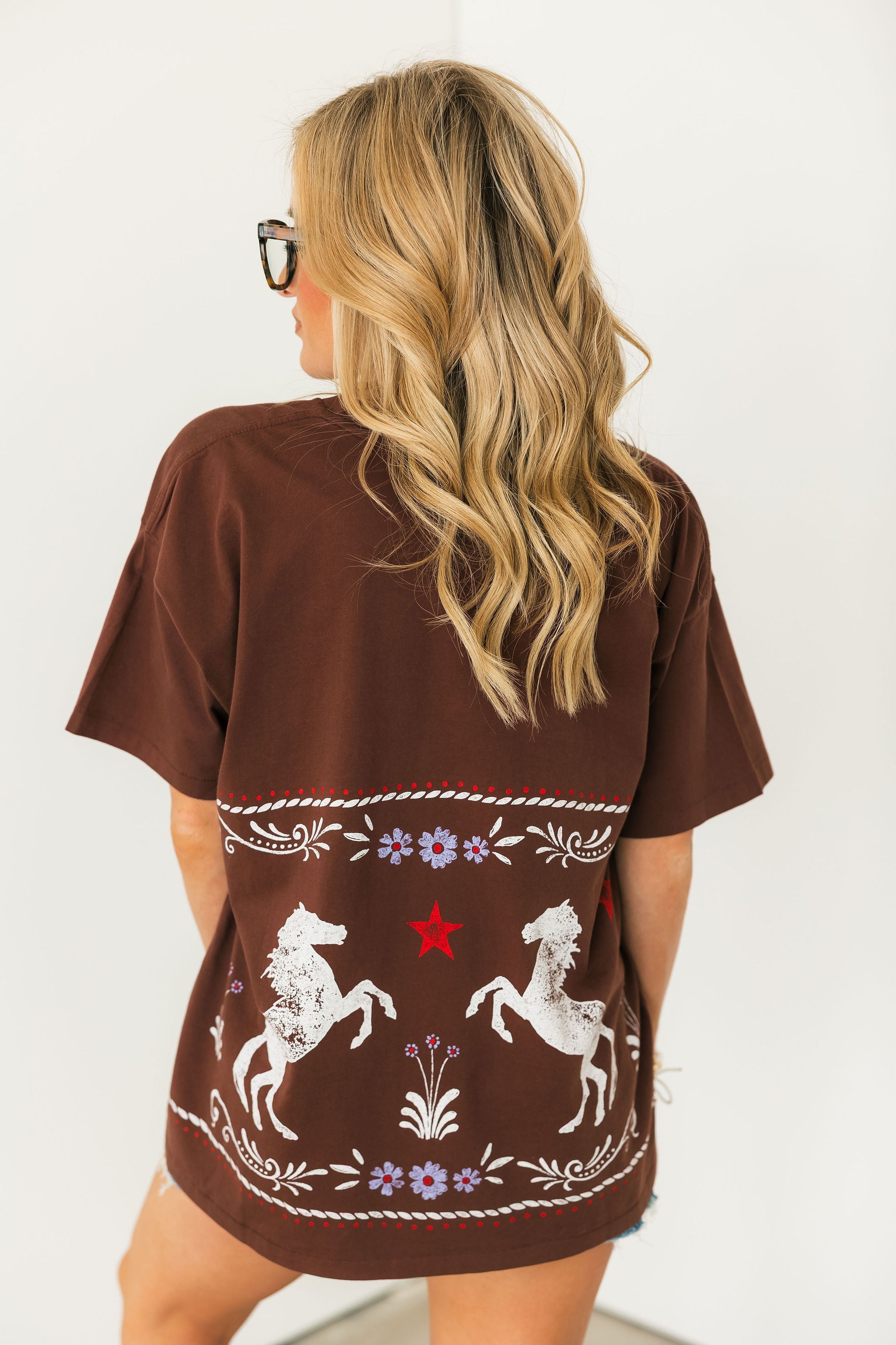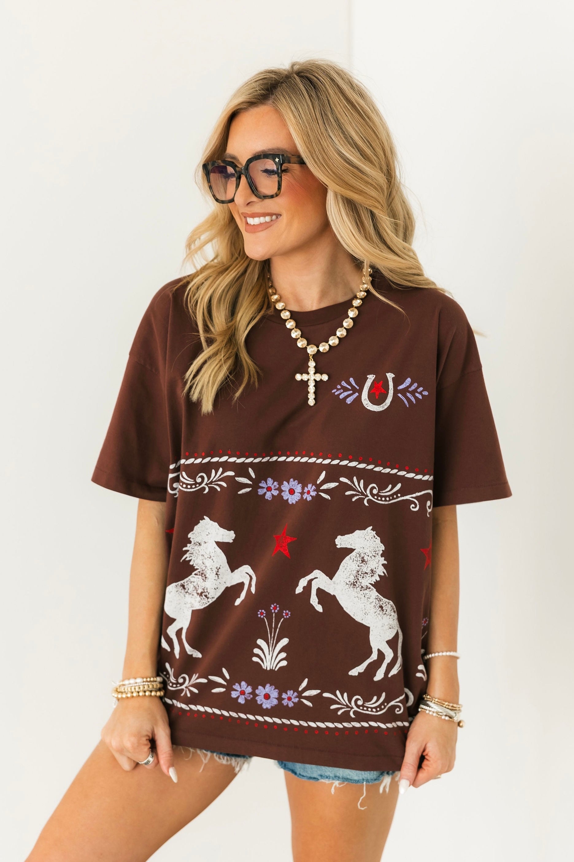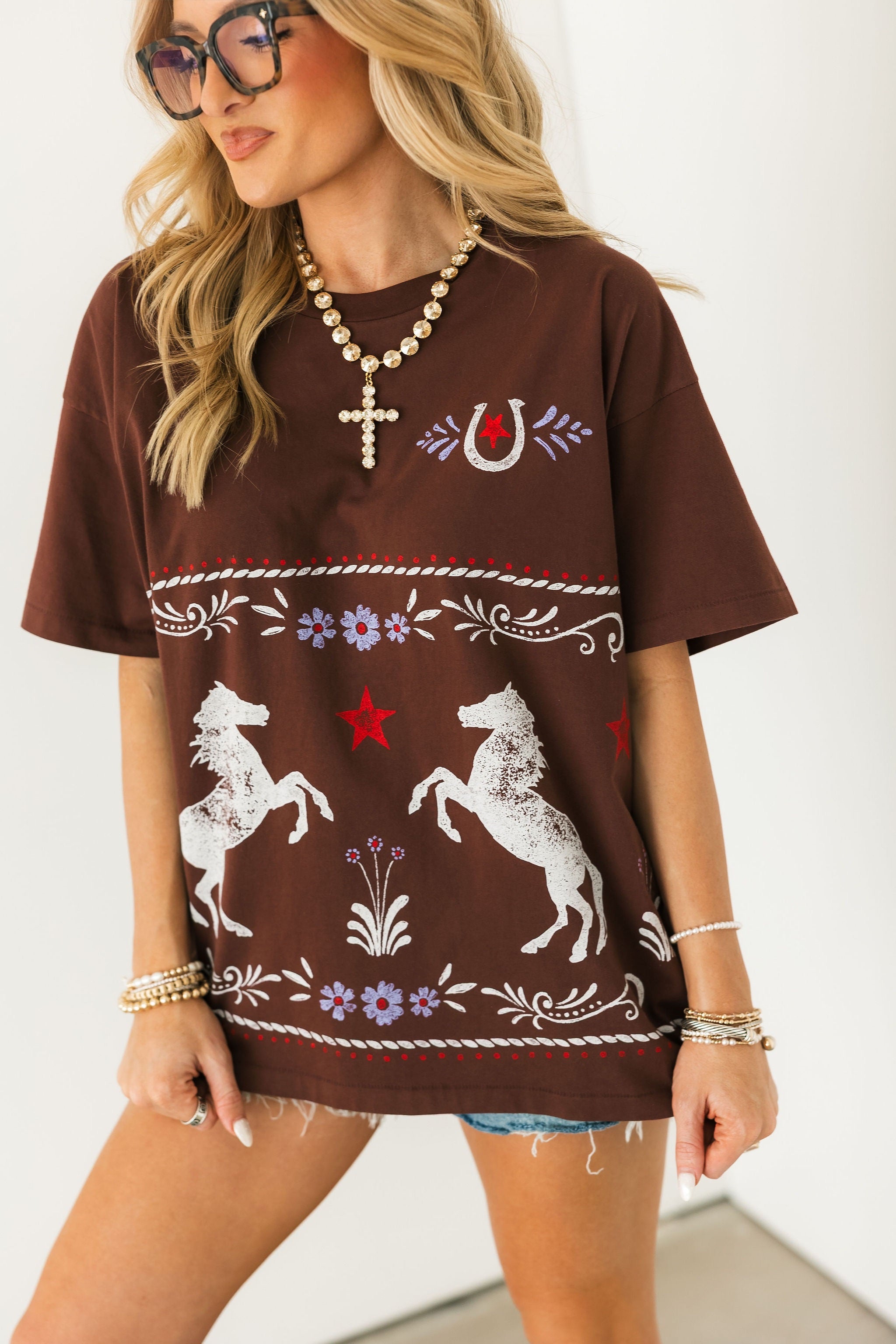 Buckle up in style, this oversized short sleeve Merch Tee brings a fresh, boutique-ready twist to country-inspired graphics. Featuring a floral horse pattern that wraps around both sides. A stamped horseshoe on the left chest adds a subtle, signature detail, while the relaxed, oversized fit makes it effortlessly comfortable and perfect for layering or wearing solo. Soft, stylish, and full of personality, this tee is a standout piece for your wardrobe. Lexi is wearing a small. 🐎✨
