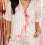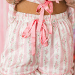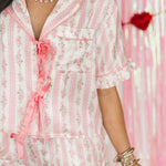 The Floral Pajamas in Pink feature a cozy, relaxed fit with satin material. The short-sleeve top has a collared neckline and front tie closure, while the matching shorts have an elastic waistband for comfort. Perfect for cozy nights in, Valentine’s morning, or gifting to someone special. Sage is wearing a small.