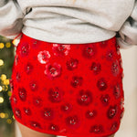 Turn heads in the Floral Sequin Embellished Mini Skirt in Red — a statement piece that sparkles with dimensional floral detailing and vibrant color. Designed with intricate 3D flowers and shimmering sequins, this mini brings the perfect dose of glam to your holiday or night-out look. Lexi is wearing an xs.