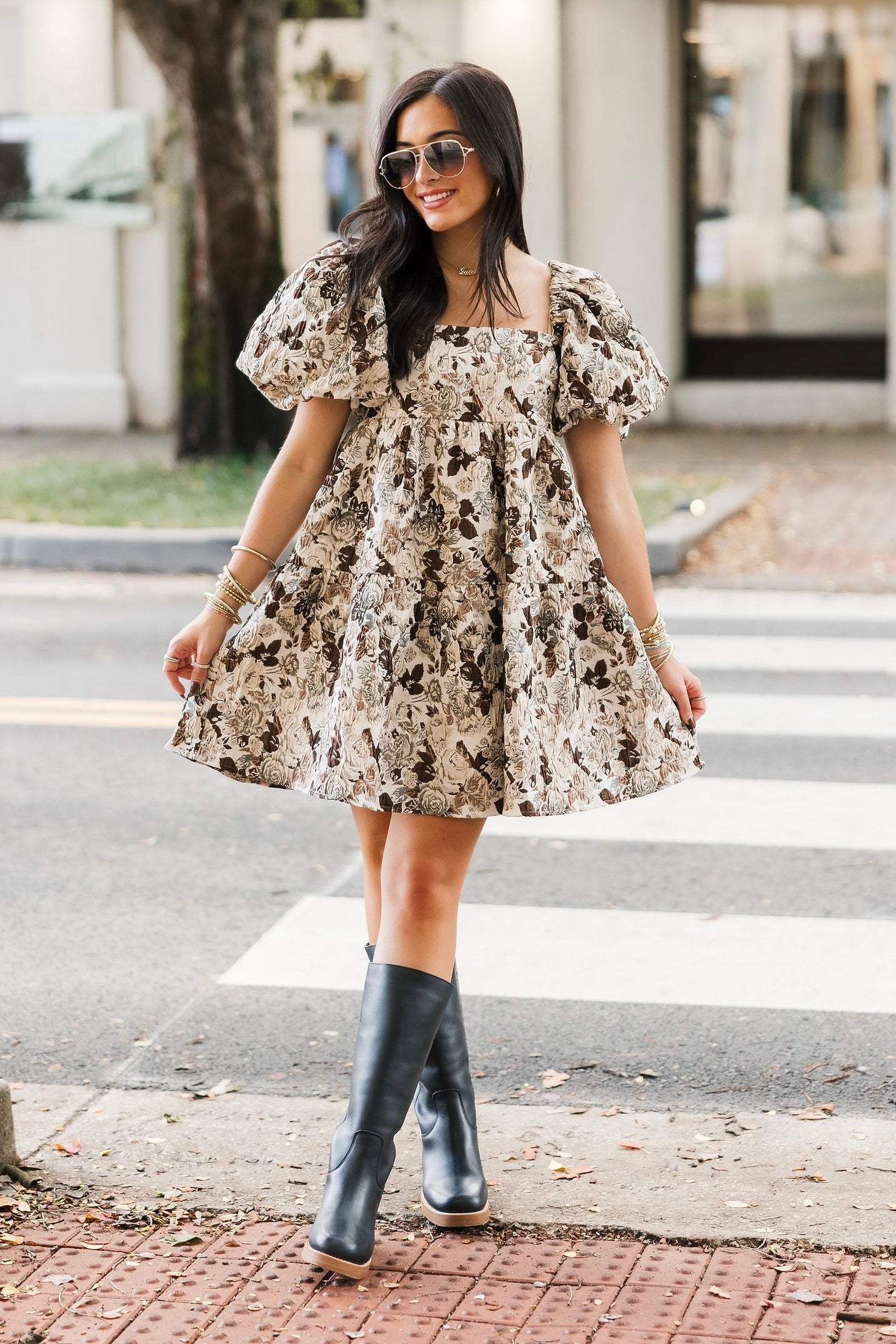 Soft and romantic, this mini dress blooms with a delicate floral print and a breezy tiered skirt. The square neckline and charming puff sleeves add a touch of vintage-inspired elegance, making it perfect for brunch dates or sunny strolls. Sage is wearing a small.
