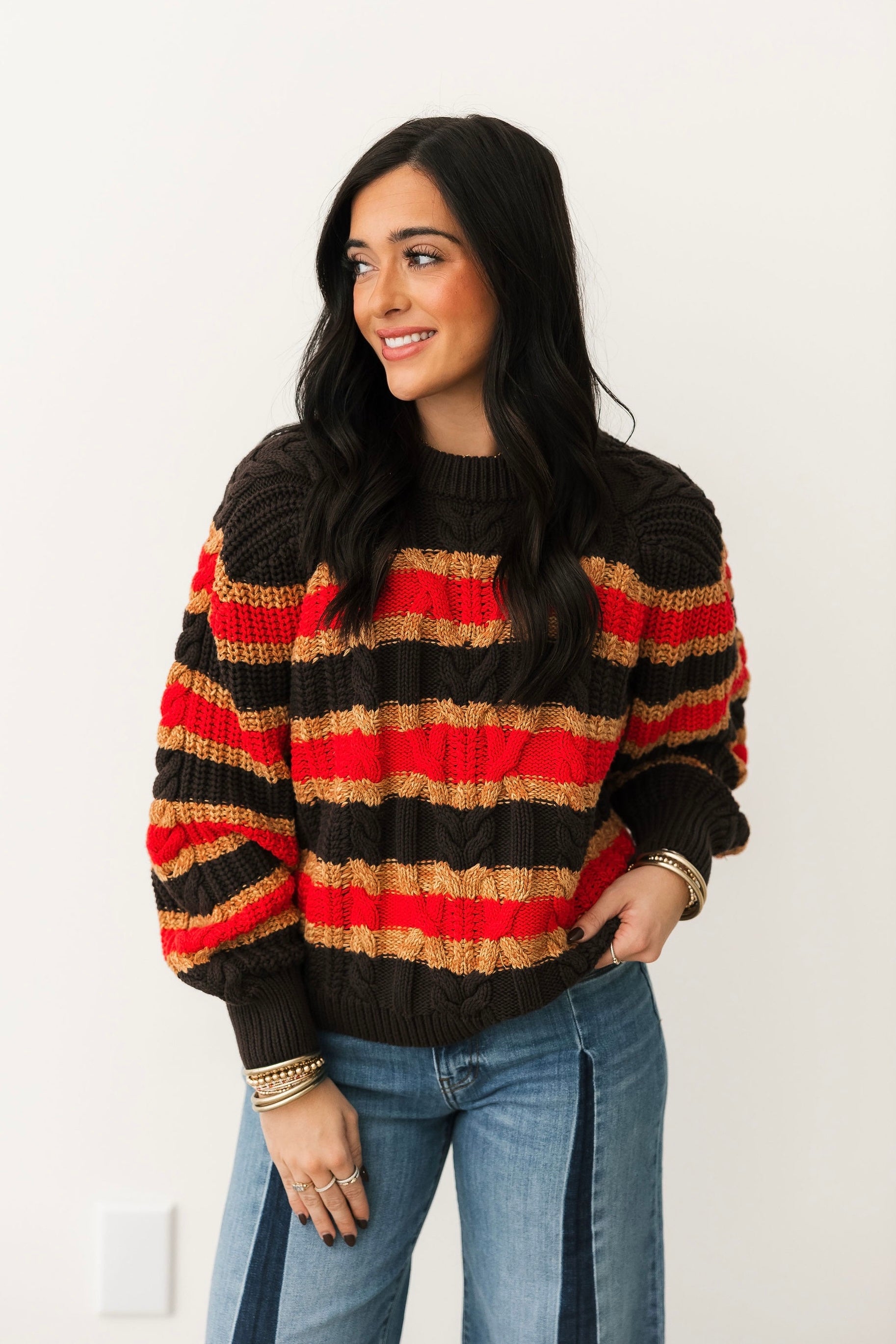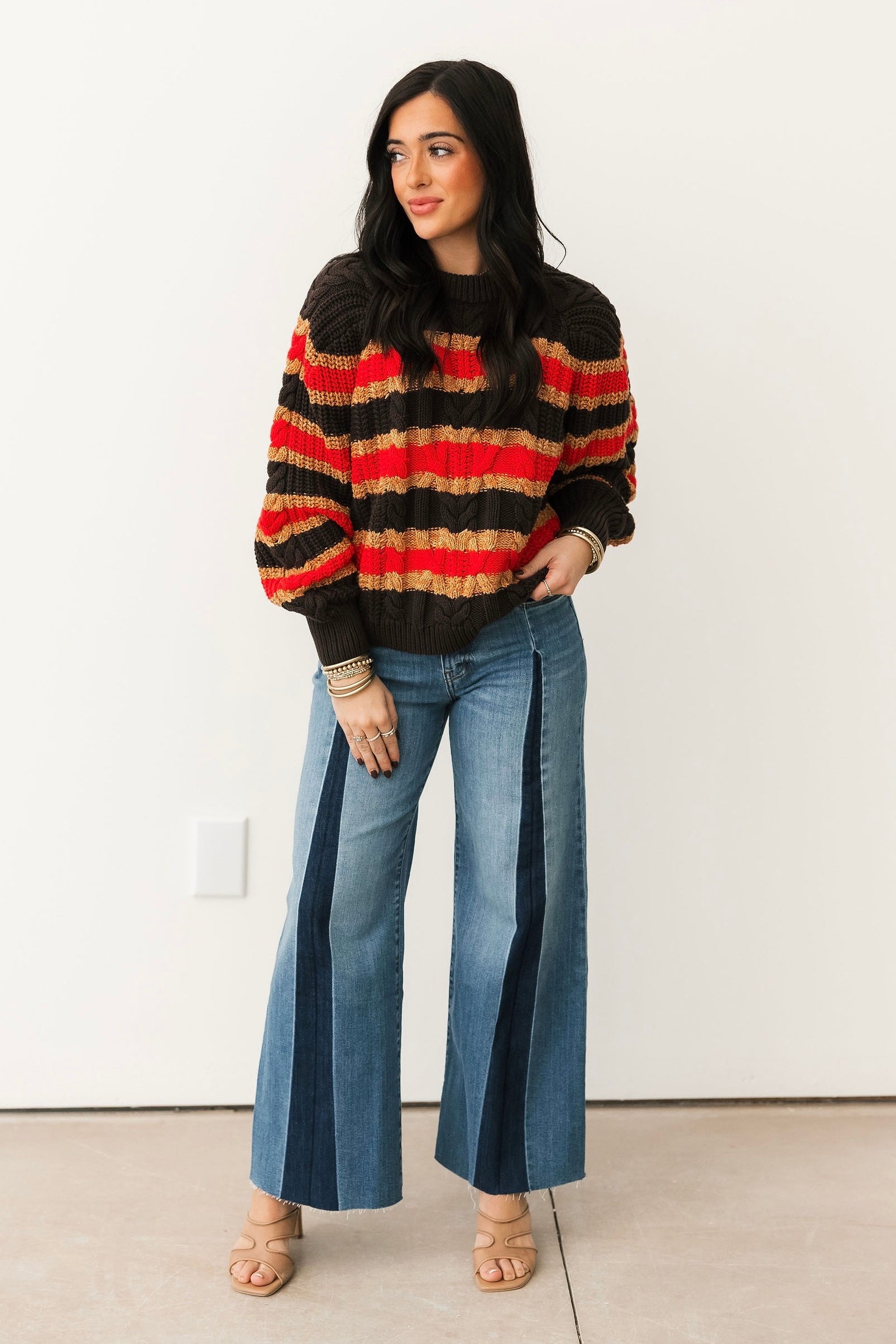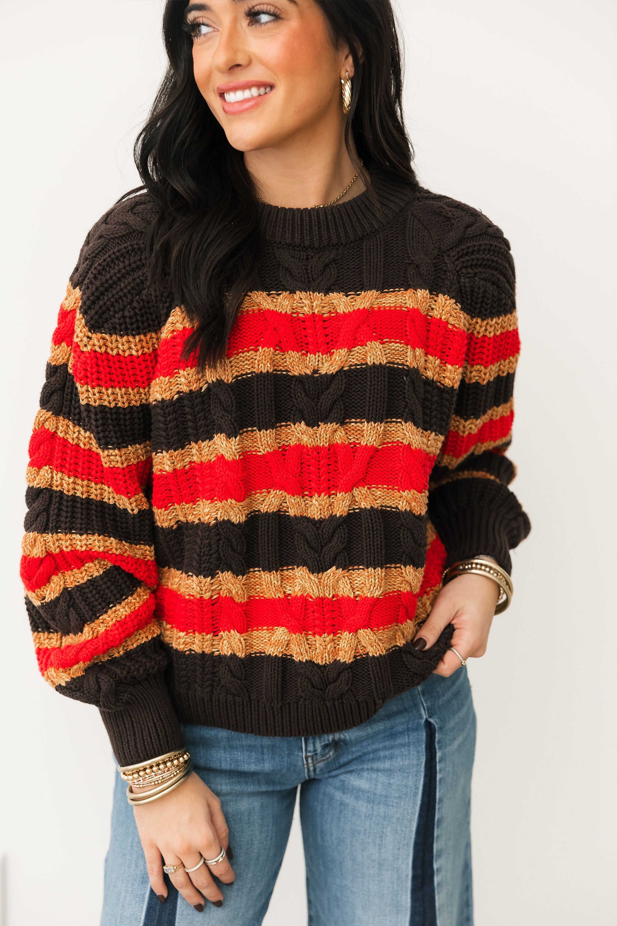 Free People Frankie Cable Striped Pullover In Chocolate Combo