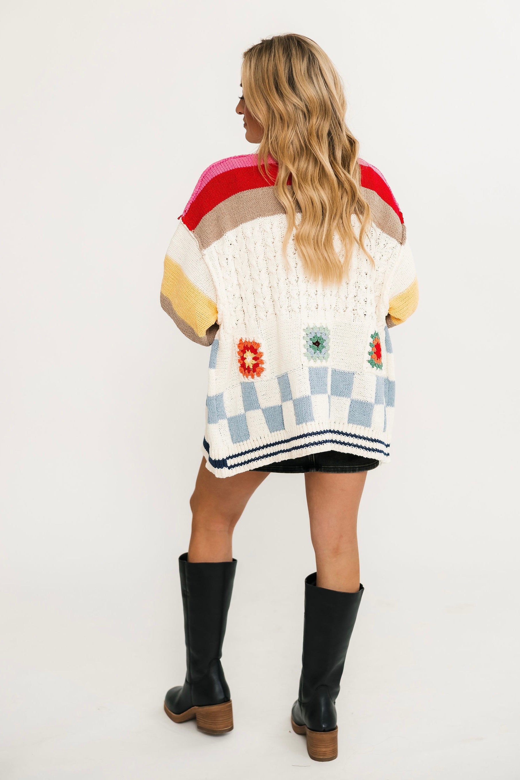 The Free Spirit Patchwork Cardigan in Almond is an oversized knit with a relaxed, cozy feel. Featuring handmade patch details, balloon sleeves, and a unique pointed striped pattern, it’s the perfect blend of comfort and individuality. A one-of-a-kind layer.